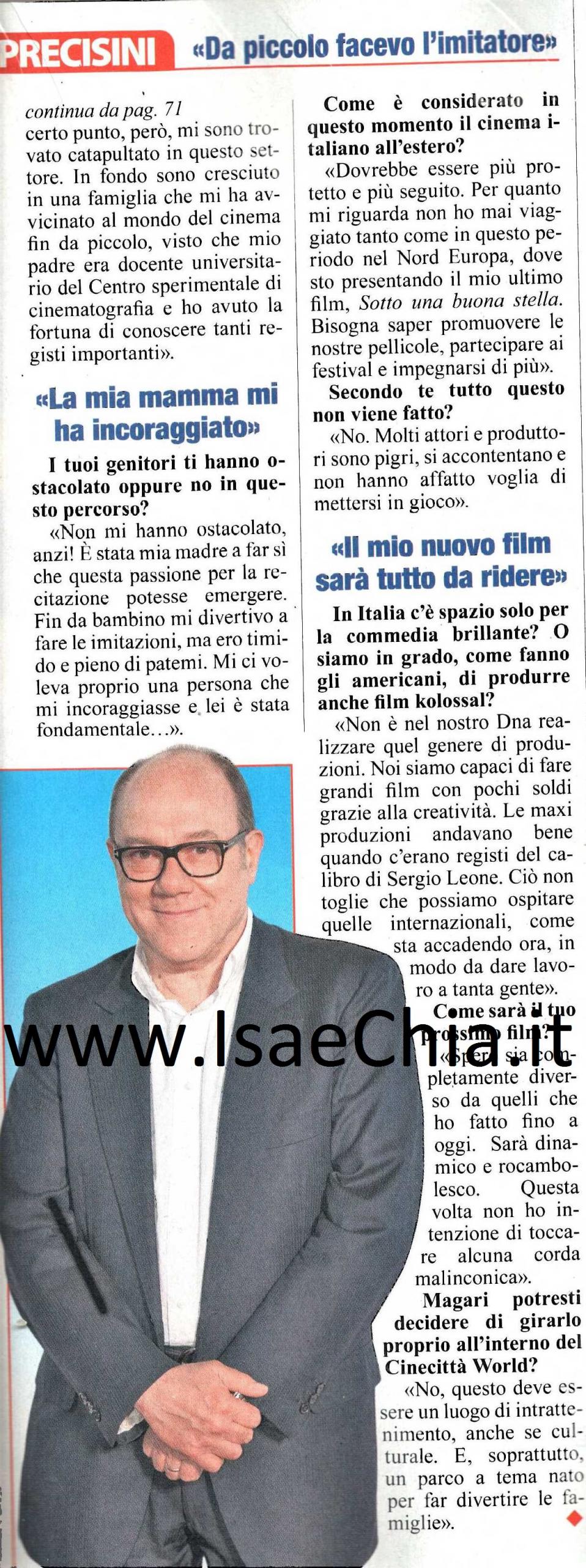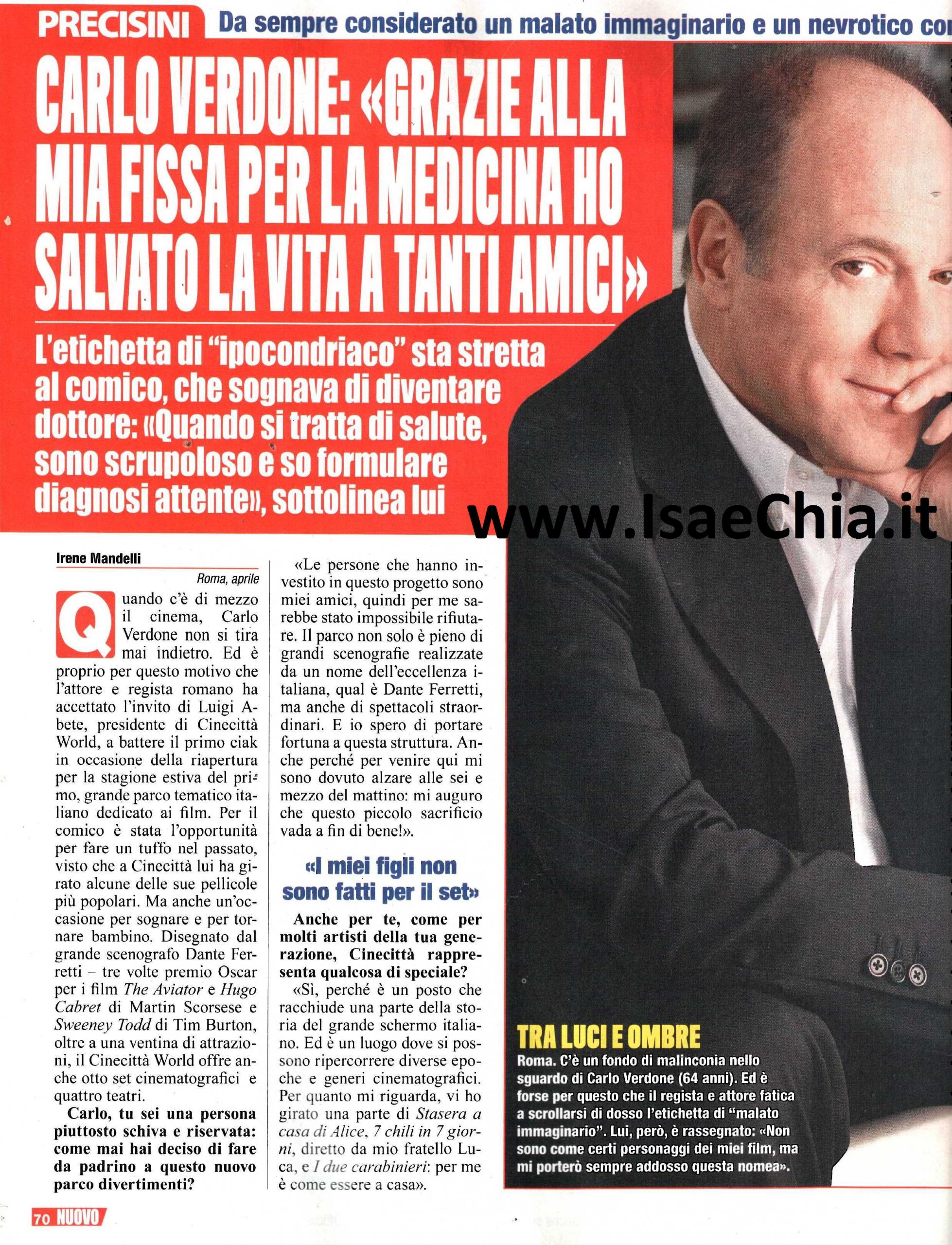 Quando c’è di mezzo il cinema, Carlo Verdone non si tira mai indietro. Ecco perché ha deciso di accettare l’invito di Luigi Abete, presidente di Cinecittà World, a battere il primo ciak per la riapertura del grande parco tematico italiano sui film. “Le persone che hanno investito su questo progetto sono miei amici, quindi sarebbe stato impossibile per me rifiutare. Il parco non solo è pieno di grandi scenografie realizzate da un grande nome, Dante Ferretti, ma anche di spettacoli straordinari e io spero di portare fortuna a questa struttura. Anche perché mi sono dovuto alzare alle 6.30 e spero che questo piccolo sacrificio sia stato a fin di bene! Cinecittà racchiude una parte della storia del cinema italiano. Per quanto mi riguarda, vi ho girato Stasera a casa di Alice, 7 chili in 7 giorni, e I due carabinieri: per me è come essere a casa“. Quando gli si fa notare che per lui, però, sono lontani i tempi in cui lui portava i suoi figli al parco giochi, Carlo risponde: “Direi di sì! Giulia e Paolo sono ormai vicini ai 30 e lavorano. La prima sta seguendo più o meno la mia strada, ma come produttrice; Paolo invece è laureato in Lettere e filosofia ed è un bravo chitarrista. Lui potrebbe diventare un attore professionista, ma non è molto interessato. Ho la nomea di persona ansiosa, ma non sono come alcuni personaggi dei miei film! Sono una persona molto scrupolosa e se sento che qualcosa non mi convince vado a farmi controllare. E tendo a mandarci anche gli altri!“. Infatti, in passato, l’attore romano ha salvato diversi amici grazie alle sue intuizioni e alla sua passione per la medicina: “Sì, credo di esser stato benefattore per tante persone, sono stato in grado di formulare diagnosi attente e scrupolose, che hanno salvato delle vite. Se non avessi fatto l’attore, mi sarebbe piaciuto essere il vecchio medico di famiglia che andava per le case con la borsa a visitare i malati. Mi è sempre piaciuta l’idea di fare del bene alle persone. In fondo, anche un film è antidepressivo, privo di effetti collaterali! Mi sono laureato in Letteratura italiana, per fare il professore o il giornalista. Poi però mi sono trovato catapultato in questo settore. In fondo sono cresciuto in una famiglia che mi ha avvicinato al mondo dello spettacolo: mio padre era docente di cinematografia e mia madre mi ha fatto sì che emergesse la mia passione per la recitazione: fin da bambino mi piaceva fare le imitazioni, ma ero timido e lei mi ha incoraggiato“.