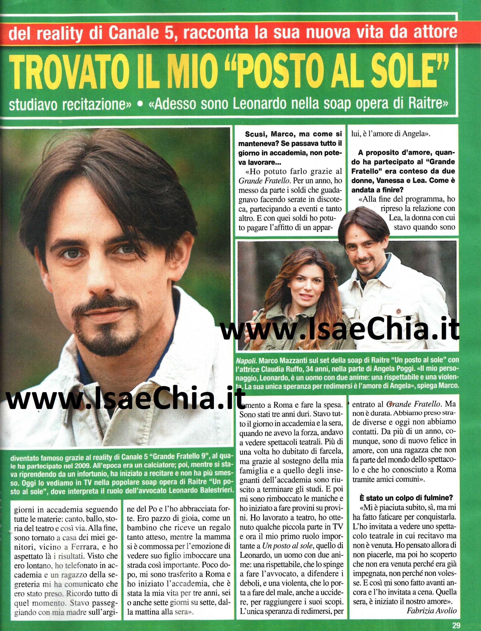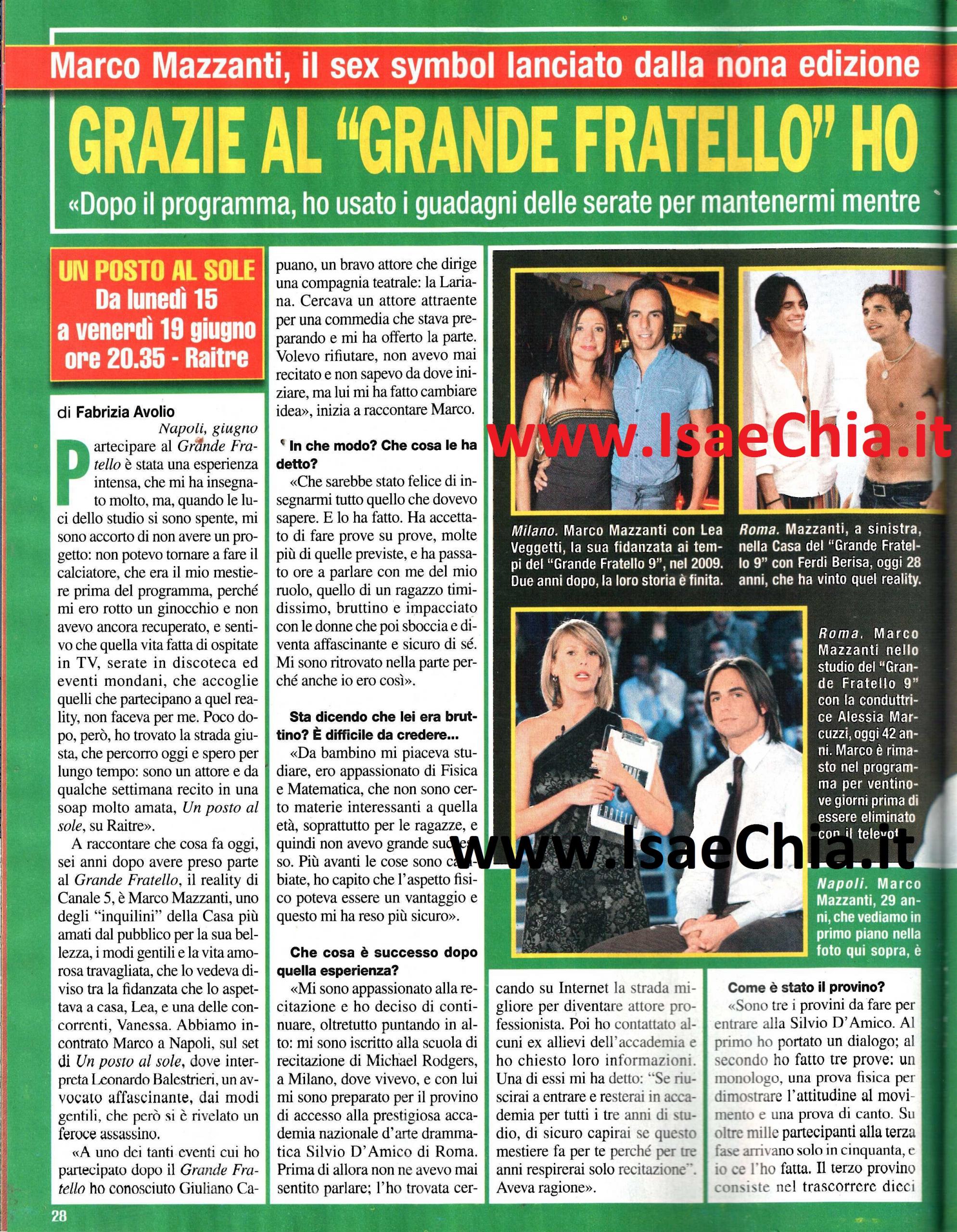 Il concorrente del Grande Fratello 9 Marco Mazzanti aveva fatto parlare di sé per la sua relazione con Lea Veggetti, di qualche anno più grande di lui, poi interrotta per la sbandata presa per Vanessa Ravizza nella Casa. Adesso, però, quei tempi sembrano lontani anni luce e lui è sempre più lanciato nella sua carriera di attore: “Partecipare al Grande fratello è stata un’esperienza molto intensa, che mi ha insegnato molto, ma quando le luci si sono spente, mi sono accorto di non avere un progetto. Non potevo tornare a fare il calciatore, il mio mestiere prima del programma, perché mi ero rotto un ginocchio, e sentivo che la vita fatta di ospitate in tv, serate in discoteca ed eventi mondani, che accoglie quelli che partecipano ai reality, non faceva per me. Poco dopo ho trovato la strada giusta, che percorro oggi e spero ancora per lungo tempo: sono un attore e da qualche settimana ho un ruolo in una soap molto amata: Un posto al sole, su Raitre. Ad un evento ho conosciuto Giuliano Capuano, un attore e direttore di una compagnia teatrale che cercava un attore attraente per una commedia che stava preparando e mi ha offerto la parte. Volevo rifiutare: non avevo mai recitato e non sapevo dove iniziare, ma lui mi ha fatto cambiare idea. Mi ha detto che sarebbe stato felice di insegnarmi tutto quello che c’era da sapere. Ha accettato di fare prove su prove, molte più di quelle previste e ha passato ore a parlare con me del mio ruolo, quello di un ragazzo timido e impacciato che poi sboccia e diventa affascinante e sicuro di sé. Mi sono ritrovato nella parte perché ero anch’io così: da ragazzino mi piaceva studiare, mi piacevano la fisica e la matematica, materie certo non interessanti per le ragazze a quell’età. Poi le cose sono cambiate e ho capito che l’aspetto fisico poteva essere un vantaggio. Dopo la prima esperienza a teatro, ho deciso di continuare e mi sono iscritto alla scuola di recitazione di Michael Rodgers di Milano e poi ho fatto il provino per la più prestigiosa accademia di arte drammatica, la Silvio D’Amico di Roma. Un’ex allieva mi ha detto: ‘Se riuscirai ad entrare e a resterai in Accademia per tutti e tre gli anni, di sicuro capirai se questo mestiere fa per te perché per tre anni respirerai solo recitazione’. Ed aveva ragione. Al primo provino ho portato un dialogo; al secondo c’erano tre prove: un monologo, una prova fisica e per dimostrare l’attitudine al movimento e una di canto. Su oltre 1000 partecipanti siamo entrati in 50. Il terzo provino consiste nel trascorrere dieci giorni in Accademia seguendo ballo, canto, storia del teatro etc. Alla fine, sono tornato a casa e ho aspettato i risultati. Ho telefonato e mi è stato detto che ero stato preso. Ricordo tutto di quel momento: stavo passeggiando con mia madre e l’ho abbracciata forte. Ero pazzo di gioia, come un bambino che riceve un regalo tanto atteso. Poco dopo, mi sono trasferito a Roma dove ho iniziato l’Accademia, che è stata la mia vita per tre anni, sette giorni su sette, dalla mattina alla sera. Mi sono mantenuto grazie ai soldi messi da parte dopo il Grande fratello, partecipando a serate ed eventi. Con quei soldi ho potuto pagare l’affitto e la spesa. Sono stati anni duri: stavo tutto il giorno in accademia e di sera, quando avevo la forza, andavo a vedere spettacoli teatrali. Più volte ho dubitato di farcela, ma grazie al sostegno della mai famiglia e degli insegnanti, sono riuscito a terminare gli studi. Poi mi sono rimboccato le maniche e ho iniziato a fare provini su provini. Ho lavorato a teatro, ho ottenuto qualche parte in tv e infine il mio primo ruolo importante in Un posto al sole. Leonardo ha due anime: una rispettabile, che lo spinge a fare l’avvocato e a difendere i deboli, e una violenta, che lo porta a fare male, anche ad uccidere, per raggiungere i suoi scopi“. Infine, quando gli si chiede dell’amore e di come si è evoluta la sua situazione sentimentale dopo il GF, Marco racconta: “Dopo il programma ripresi la relazione con Lea, ma non è durata. Abbiamo preso strade diverse e oggi non abbiamo più contatti. Da più di un anno sono felice con una ragazza che non fa parte del mondo dello spettacolo e che ho conosciuto a Roma tramite amici comuni. Mi è piaciuta subito, ma ho fatto fatica per conquistarla. L’ho invitata a vedere uno spettacolo teatrale in cui recitavo, ma non è venuta. Ho pensato allora di non piacerle, ma poi ho scoperto che non era venuta perché era già impegnata. Così mi sono fatto avanti ancora e l’ho invitata a cena. Quella sera è iniziato il nostro amore“.