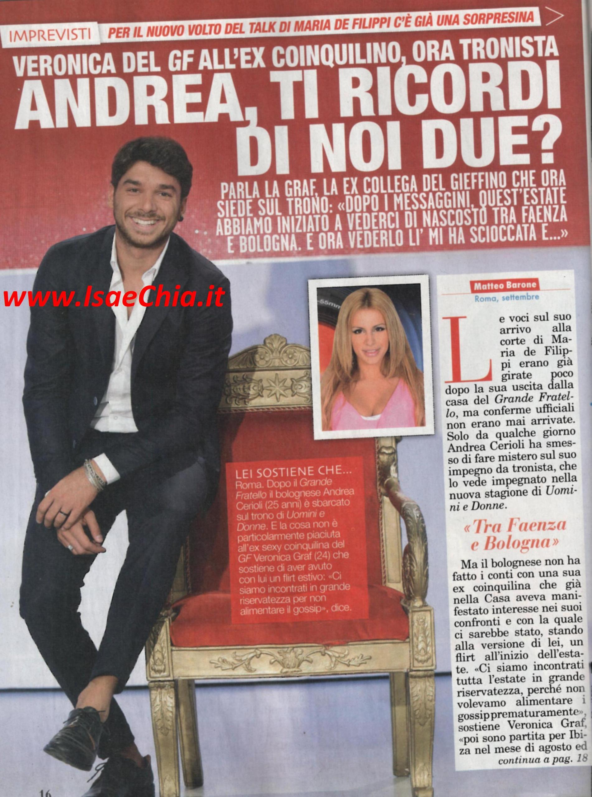 Rivelazione shock da parte della gieffina Veronica Graf: l’ex coinquilina di Andrea Cerioli rivela la storia che ha avuto con il bell’emiliano, che ora si dichiara single sul trono di Uomini e donne: “Ci siamo incontrati tutta l’estate con grande riservatezza, per non alimentare gossip prematuramente” dice lei. “Poi ad agosto sono partita per Ibiza ed ero certa che ci saremmo ritrovati al mio ritorno. Mentre ero ancora lì, invece, ho appreso la notizia. Quando ho letto la notizia sui social network, inizialmente ho creduto che si trattasse di una bufala, soprattutto se a Uomini e donne si va per cercare la donna giusta”. Ma, in effetti, dopo il Grande fratello, Veronica aveva già dichiarato che avrebbe fatto un pensierino su di lui: “Ci ho fatto più di un pensierino, e lui lo sa. Ce lo siamo detti quando è uscito dalla Casa. Sono la sola che ha capito la sua natura: dietro il suo fare da pavone, c’è un ragazzo dolcissimo e desideroso d’affetto. Questo un po’ la testa me l’ha fatta girare. Dopo la sua uscita abbiamo cominciato a scambiarci messaggi, più volte al giorno. Abbiamo evitato tutti i circuiti dove avrebbero potuto riconoscerci proprio per capire cosa c’era dietro l’apparente intesa che ci ha tenuti uniti”. Ma quando le si chiede come mai è bastata la vacanza di lei ad allontanarli, la gieffina risponde: “Francamente non so cosa dire, se ha giocato nella Casa, lo farà anche a Uomini e donne. Se allora è una strategia per rimanere in tv e giocare tutte le sue carte, ha tutto il mio appoggio. Sappiamo bene quanta popolarità dia un programma simile. Se con me avesse recitato, probabilmente ci saremmo fatti vedere in pubblico, a favore di telecamere, anziché a Faenza, vicino casa mia, o a Bologna, vicino casa sua. Andare a riprendermelo? Per quanto sarebbe divertente apparire tra le sue corteggiatrici, devo anche dire che la mia natura non è quella di chi si mette a corteggiare. Se vuole, dovrà essere lui a riconquistarmi”.