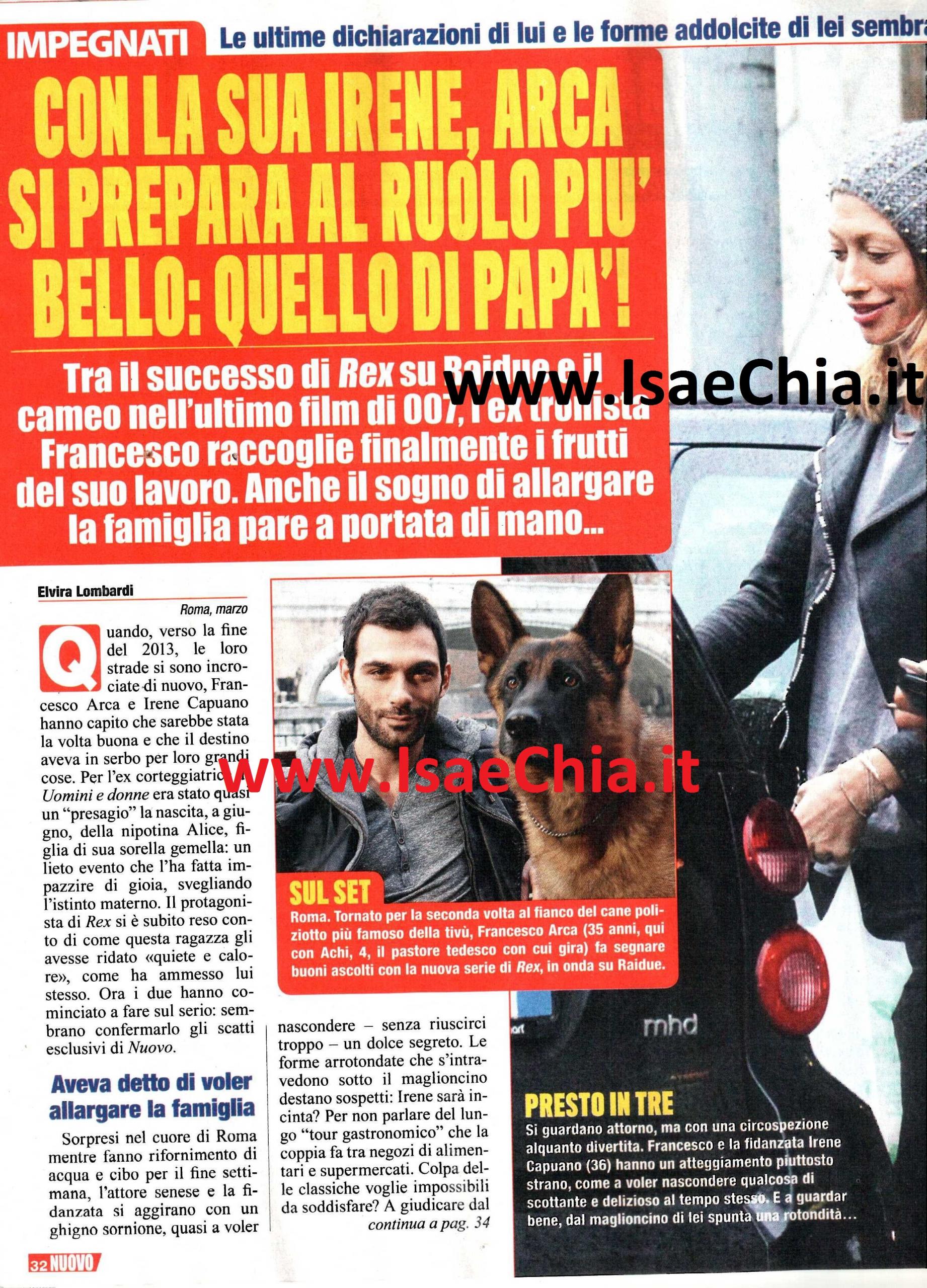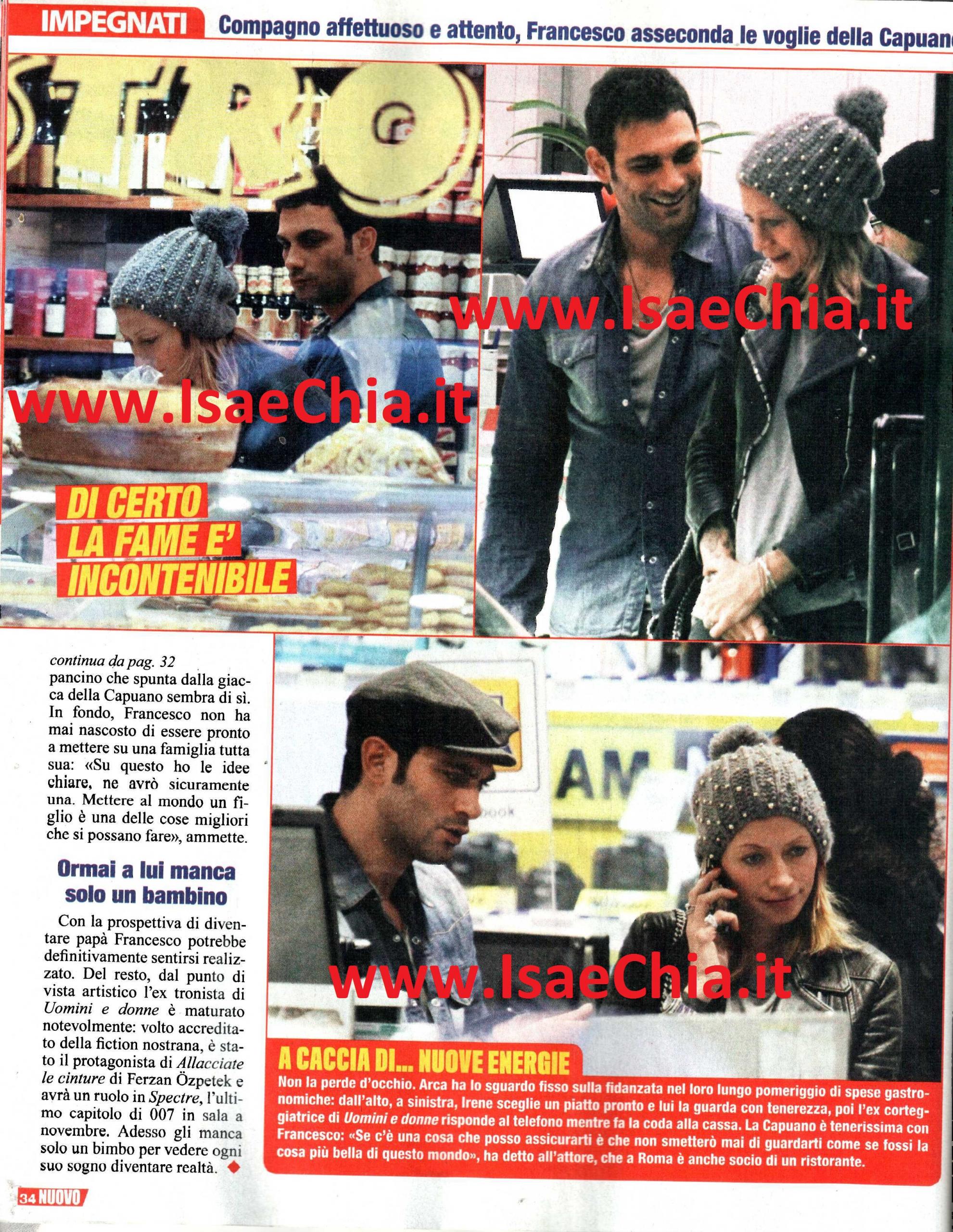 Quando verso la fine del 2013 le loro strade si sono incrociate di nuovo, Francesco Arca e Irene Capuano hanno capito che sarebbe stata la volta giusta e che il destino aveva in serbo per loro grandi cose. Per l’ex corteggiatrice era stato quasi un presagio la nascita della nipotina Alice, figlia di sua sorella gemella: un lieto evento che l’ha fatta impazzire di gioia e le ha risvegliato l’istinto materno. Al contempo, l’ex tronista, ora protagonista de Il commissario Rex, ha dichiarato che lei gli trasmette “quiete e calore”. E, a quanto pare, i due hanno grandi progetti: sorpresi nel cuore di Roma mentre fanno rifornimenti per il fine settimana, si aggirano con un ghigno sornione, come se volessero nascondere, senza riuscirci troppo, un dolce segreto. A guardar bene, infatti, dal maglioncino di lei si notano delle forme un po’ più rotonde, che non c’erano prima. Che sia incinta? Al supermercato, la bionda 36enne ha fatto un bel giro al reparto gastronomia e Francesco ride beffardo quando lei sceglie un piatto pronto, forse spinta da quelle tipiche voglie…In fondo, Francesco non ha nascosto di essere pronto a metter su famiglia: “Su questo ho le idee chiare, ne avrò sicuramente una. Mettere al mondo un figlio è una delle cose migliori che si possano fare“.