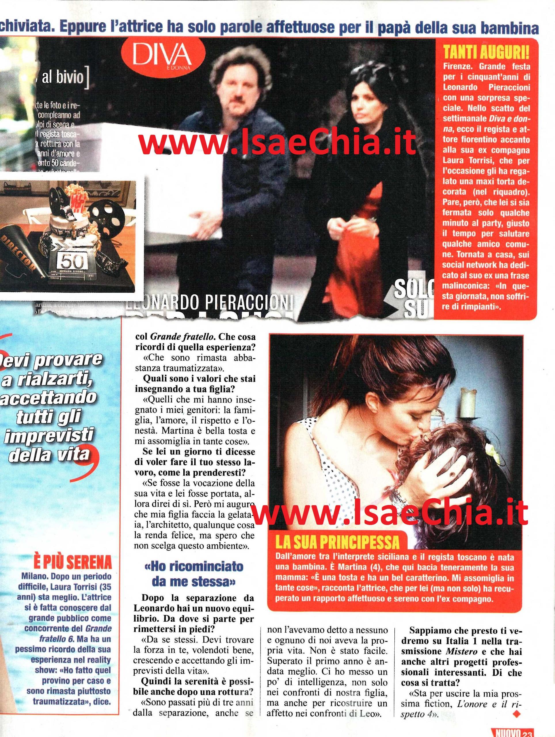 Laura Torrisi e Leonardo Pieraccioni si erano conosciuti sul set del film Una moglie bellissima, dove lei interpretava la protagonista femminile, lui quello maschile nonché il regista. Era il 2007, lei era uscita da poco dal Grande fratello 6, lui era già famoso per il pubblico italiano. I due hanno avuto una figlia, Martina, ma lo scorso ottobre è giunta la notizia della fine della loro relazione e lei dichiara che era già finita da tempo. Adesso, Laura ha pubblicato la foto di una torta di compleanno in occasione del 50° compleanno di Leonardo e lui l’ha ringraziata. Intervistata sul suo percorso e la sua vita di oggi, Laura racconta: “Dal Grande fratello sono rimasta abbastanza traumatizzata. A mia figlia Martina insegno gli stessi valori che mi hanno insegnato i miei genitori: famiglia, amore, rispetto e onestà. Martina è bella tosta e mi somiglia in tante cose. Se la vocazione della sua vita fosse fare l’attrice, allora le direi di sì. Ma spero che faccia la gelataia, l’architetto, qualunque cosa la renda felice, ma spero che non scelga quest’ambiente. Da bambina volevo cantare e fare cinema ed ero sicura che mi sarei sposata ed avrei avuto figli. Il matrimonio non è mai arrivato, però ho realizzato altri sogni!“. A proposito, quando le si chiede da dove è ripartita dopo la separazione da Pieraccioni, la bella toscana risponde: “Si riparte da se stessi: devi trovare la forza in te, volendoti bene, crescendo e accettando gli imprevisti della vita. Sono passati più di tre anni, anche se non avevamo detto niente a nessuno e ognuno viveva la propria vita. Non è stata facile; superato il primo anno, è andata meglio. Ci ho messo un po’ d’intelligenza, non solo nei confronti di nostra figlia, ma anche per ricostruire un rapporto con Leo” rivela lei. Infine, rivela i progetti professionali: sarà nel programma di Italia 1 Mistero, ma non solo: “Sta per uscire la mia prossima fiction, L’onore e il rispetto 4!”.