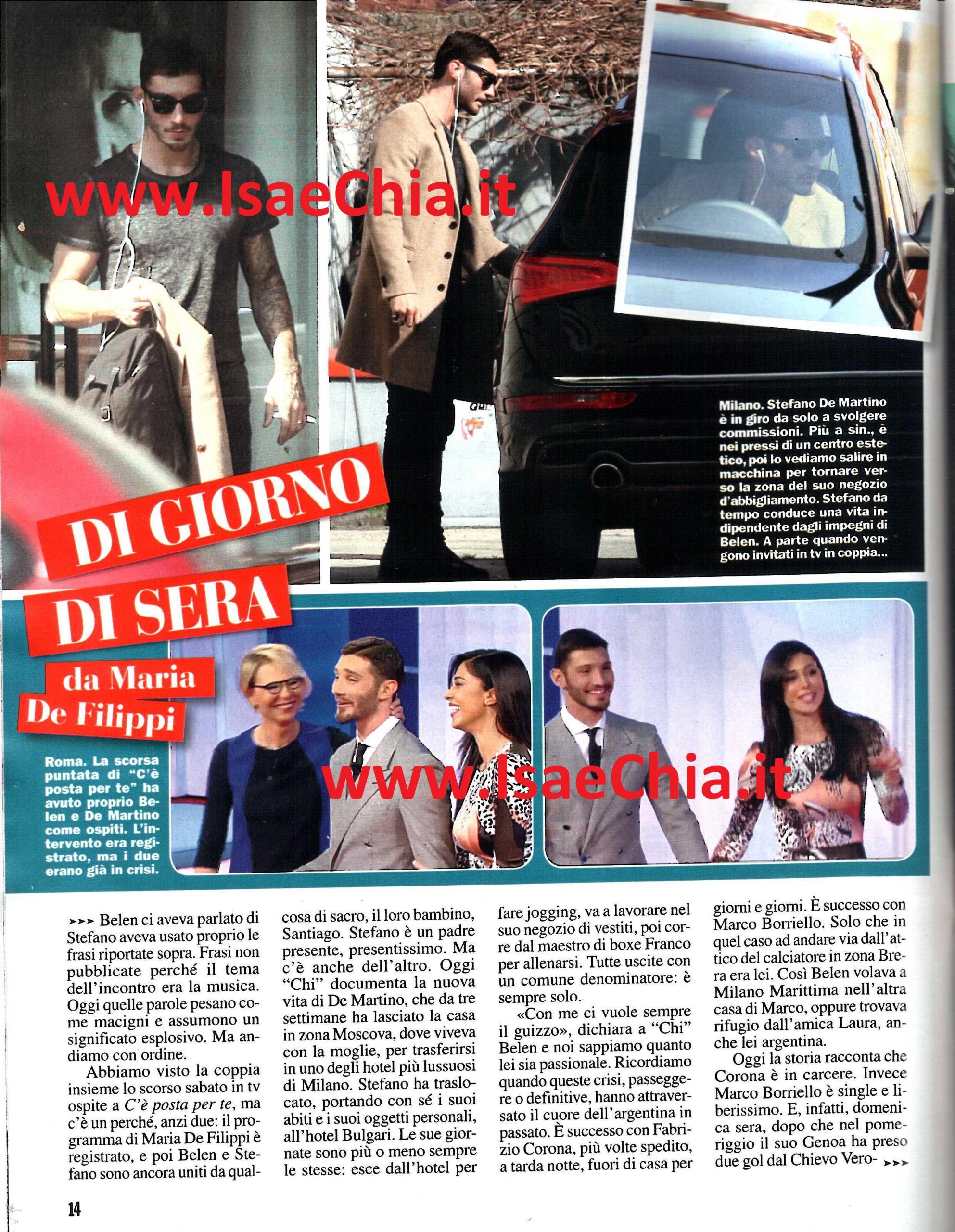 Ieri vi avevamo anticipato la notizia (QUI per rileggere il post): secondo il settimanale Chi, il matrimonio di Belén Rodriguez e Stefano De Martino sarebbe in crisi già da tre settimane. I due, sposatisi nel settembre 2013, si erano conosciuti poco più di un anno prima ad Amici, dove Stefano era tra i ballerini professionisti e lei era nel cast. All’epoca lui era fidanzato con Emma Marrone e lei con Fabrizio Corona, anche se poi i due hanno dichiarato che le rispettive storie erano già in crisi. Fino a poco fa, Stefano e Belén erano apparsi sempre uniti: l’ultima occasione è stata proprio sabato scorso, quando sono apparsi nel programma di Maria De Filippi C’è posta per te. I due hanno trattenuto a stento le lacrime per la storia commovente di cui sono stati testimoni e si sono scambiati vari segni d’affetto. Insomma, niente che facesse presagire una rottura. Ma adesso la notizia è giunta come un fulmine a ciel sereno ed è supportata da queste immagini. “Stefano? Avrei voluto che avesse 33 anni, sarebbe l’età giusta. I primi sei mesi sono spettacolari, poi la vita sessuale nella coppia si deve coltivare! L’inizio di una storia, mamma mia, resta solo l’inizio! Io sono innamorata dell’amore, sono una grande romanticona. Nelle storie passano gli anni e subentra la quotidianità. Ma io ho bisogno sempre del guizzo” è stata l’ultima dichiarazione di Belén, fatta due settimane fa alla stessa rivista. Parole alle quali, sul momento, nessuno aveva dato tanto peso, al punto tale che nell’intervista, incentrata sul suo debutto nella musica, erano state tagliate, ma che sembrano nascondere i motivi della crisi con il marito. Il ballerino ha lasciato da ben tre settimane l’appartamento in zona Moscova di Milano per trasferirsi in uno degli hotel più lussuosi della città, il Bulgari: eccolo mentre fa il “trasloco” e porta su le valigie con tutti i suoi effetti personali. Nei giorni successivi, le foto scattate sono sempre le stesse: il bel napoletano esce per fare jogging, va a lavorare, fa lezione col suo maestro di boxe… Tutto da solo. C’è un dettaglio, però, che non è chiaro: pochi giorni fa, Belén aveva pubblicato su Instagram una foto sexy di Stefano con addosso solo un asciugamano, che sembra scattata proprio in una stanza d’albergo. Negli ultimi giorni, però, hanno quasi smesso di pubblicarsi a vicenda. Pare che tra i motivi della crisi ci sia anche Veronica Cozzano, la madre di Belén, che al momento è in Italia ed è stata anche ospite dell’Isola dei famosi, per supportare la figlia Cecilia. Quale sarà la verità? Lo scopriremo presto…