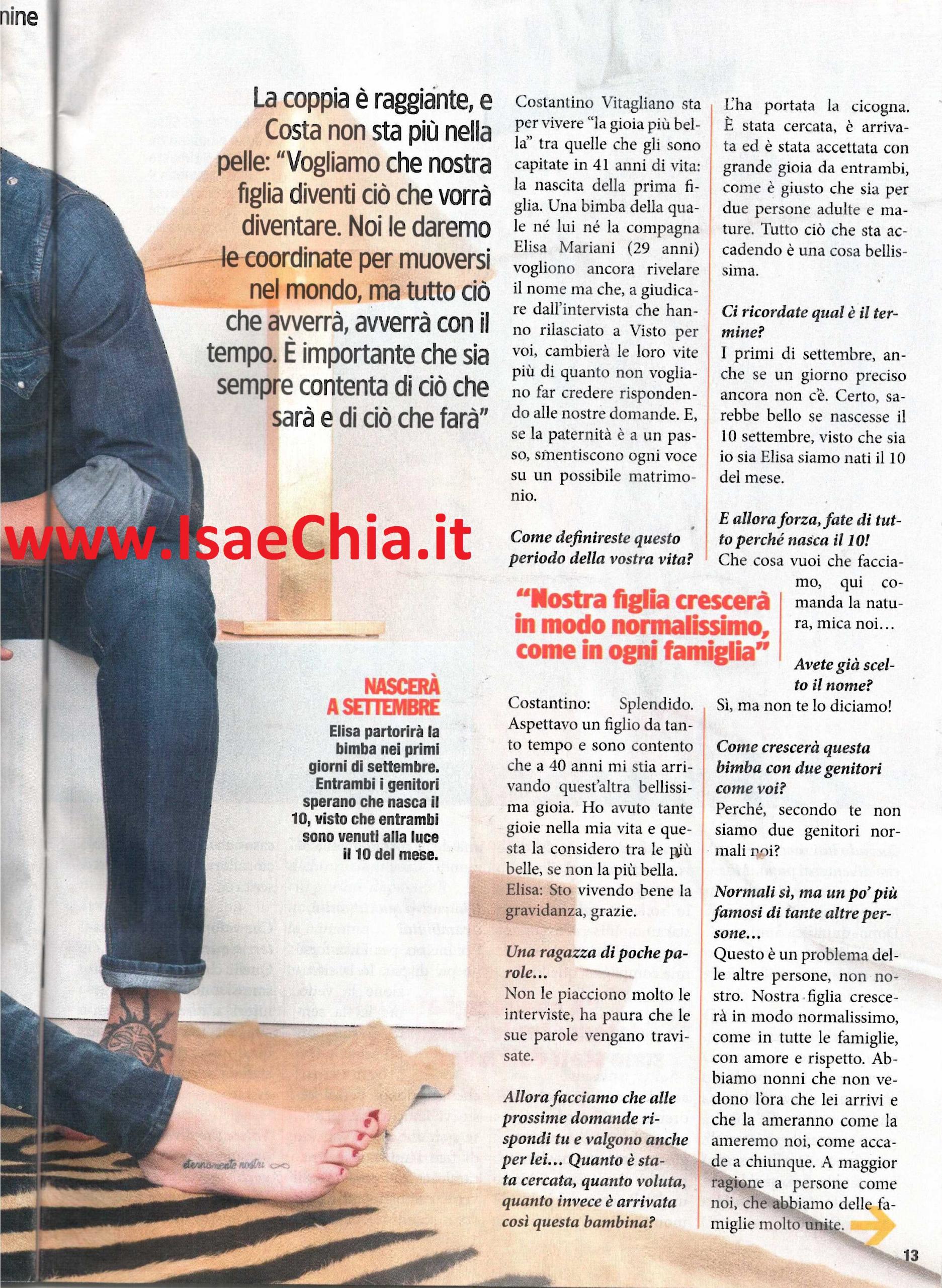 L’ex tronista Costantino Vitagliano sta vivendo “la cosa più bella che gli sia mai capitata in 41 anni di vita“, e lo sta facendo insieme alla sua compagna Elisa Mariani: tra poco, infatti, diventerà papà. “E’ un periodo splendido. Aspettavo questo figlio da tanto tempo e sono contento che a 40 anni sia arrivata questa gioia. Ho avuto tante gioie nella mia vita, ma questa la considero la più bella. Questa bambina è stata cercata ed è stata accettata da entrambi, come è giusto che sia tra due persone adulte e mature. Il termine è per i primi di settembre e sarebbe bello se nascesse il 10, dato che sia io che Elisa siamo nati il giorno 10. Il nome l’abbiamo scelto, ma non lo diciamo!“. Quando gli si chiede come crede che crescerà con dei genitori noti e non ‘normali’ come gli altri, Costa risponde: “Questo è un problema delle altre persone, non nostro. Nostra figlia crescerà in modo normalissimo, come in tutte le famiglie, con amore e rispetto. Abbiamo nonni che non vedono l’ora che arrivi e l’ameranno come la ameremo noi, come accade a chiunque. A maggior ragione a persone come noi, che abbiamo famiglie molto unite. Io sono sempre io, Elisa è sempre Elisa, quello che accadrà o cambierà lo vedremo col tempo. Per il momento mi godo il momento, la pancia che cresce giorno per giorno. La quotidianità per me non è cambiata, per Elisa sì e io la vedo: lei la sente, il suo corpo sente le trasformazioni e lei ha smesso di fare l’indossatrice, naturalmente. Ecco, il vero cambiamento forse arriverà quando avremo la piccola in braccio e allora sarà il caso di risentirci! Le trasmetteremo quello che ci hanno trasmesso i nostri genitori: amore, affetto, senso della famiglia. Vogliamo che diventi ciò che vorrà lei. Noi le daremo le coordinate per muoversi nel mondo, ma i ragazzi di oggi crescono diversamente da me, che non mi sento così vecchio“. Quando gli si chiede se è vero che si sposeranno e se Maria De Filippi l’ha chiamato per fargli gli auguri, risponde: “Dopo quindici anni non saprei cosa rispondere. Io non mi aspetto che mi chiami lei, così come non mi aspetto che mi chiamino altre persone. Spero mi chiamino solo le persone che stanno davvero al mio fianco. Quello è sempre stato lavoro; quel lavoro è finito, quindi passiamo ad altro, per favore. Il matrimonio? Quando siamo stati ospiti da Barbara D’Urso a Pomeriggio 5, loro hanno pronunciato questa parola, noi mai. Per ora ci godiamo questo bellissimo momento. Il fatto è che le persone ascoltano quello che dicono gli altri e non quello che diciamo noi! Un altro figlio? Pensiamo a questo adesso! Il corpo della mia compagna diventa sempre più bello, abbiamo iniziato il corso pre-parto e io cerco di non mancare mai. E’ la mia prima figlia! Sono contento che sia una femmina, anche se so già che me le farà pagare tutte. Spero che sarà attaccata al padre, come dicono tutti, ma poi verso i 14-15 anni si staccherà, magari per il primo fidanzato. Meglio non pensarci, sta già accadendo tutto così velocemente! Più che proteggerla, non avrò problemi a mostrarla. Non voglio nascondere niente, non ho mai nascosto niente e penso di essere una persona trasparente. Non mi vergognerò di portare mia figlia da nessuna parte, sarò orgoglioso di portarla ovunque. Se sarà bella come la mamma, perché nasconderla? Se vorrà seguire la mia strada, vedremo. L’importante è che non le facciano male con gli insulti, come hanno fatto con me”.