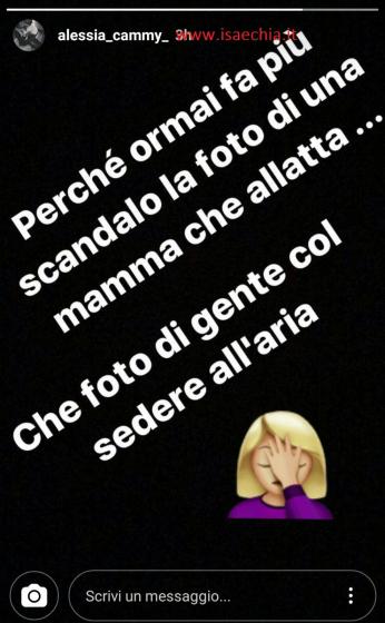 L’ex corteggiatrice non ha mandato giù le critiche e come sempre senza peli sulla lingua, ha voluto rispondere per le rime. Tramite una Instagram Stories, infatti, ha desiderato far sapere il suo pensiero: “Perché ormai fa più scandalo la foto di una mamma che allatta… che foto di gente col sedere all’aria“…