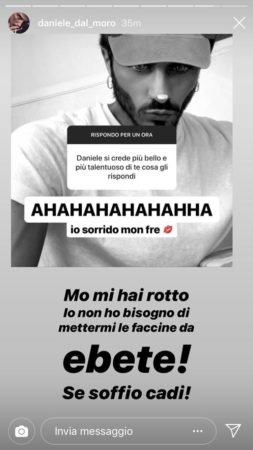 In occasione del gioco delle domande e delle risposte di Instagram, il graphic designer ne ha approfittato per lanciare delle eloquenti stilettate all’imprenditore veronese asserendo prima che ‘le dirette (che fanno spesso sia Daniele, sia Erica Piamonte, ndr) dato che sono cose che fanno tutti non fanno per lui’, e poi ridendo all’ennesima allusione su Dal Moro: