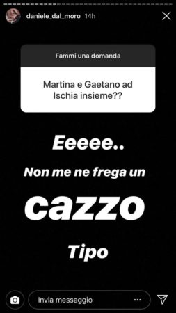 Nonostante la lontananza quindi i due ex gieffini continuano a sentirsi, anche se non ci è dato sapere se si rivedranno a breve, dato che peraltro Martina sta trascorrendo questi ultimi giorni d’estate ad Ischia in compagnia dell’ex gieffina Guendalina Canessa ed altri amici, tra i quali ci sarebbe anche dovuto essere un altro ex concorrente del Gf, Gaetano Arena, che ha invece rimandato all’ultimo la partenza. Come i più attenti ricorderanno a Gaetano non dispiaceva affatto la Nasoni all’inizio del Gf e a Daniele non è mai andato troppo a genio il graphic designer, proprio per questo a chi gli ha chiesto cosa ne pensasse di un’eventuale reunion della sua ex con Arena sull’isola del Gonfo di Napoli Dal Moro ha prontamente – e anche un po’ nervosamente – risposto: