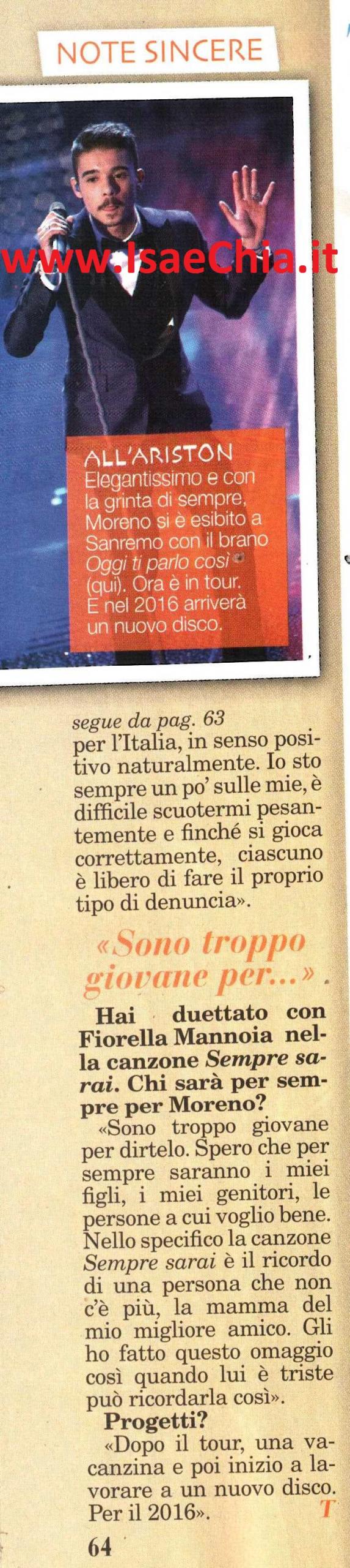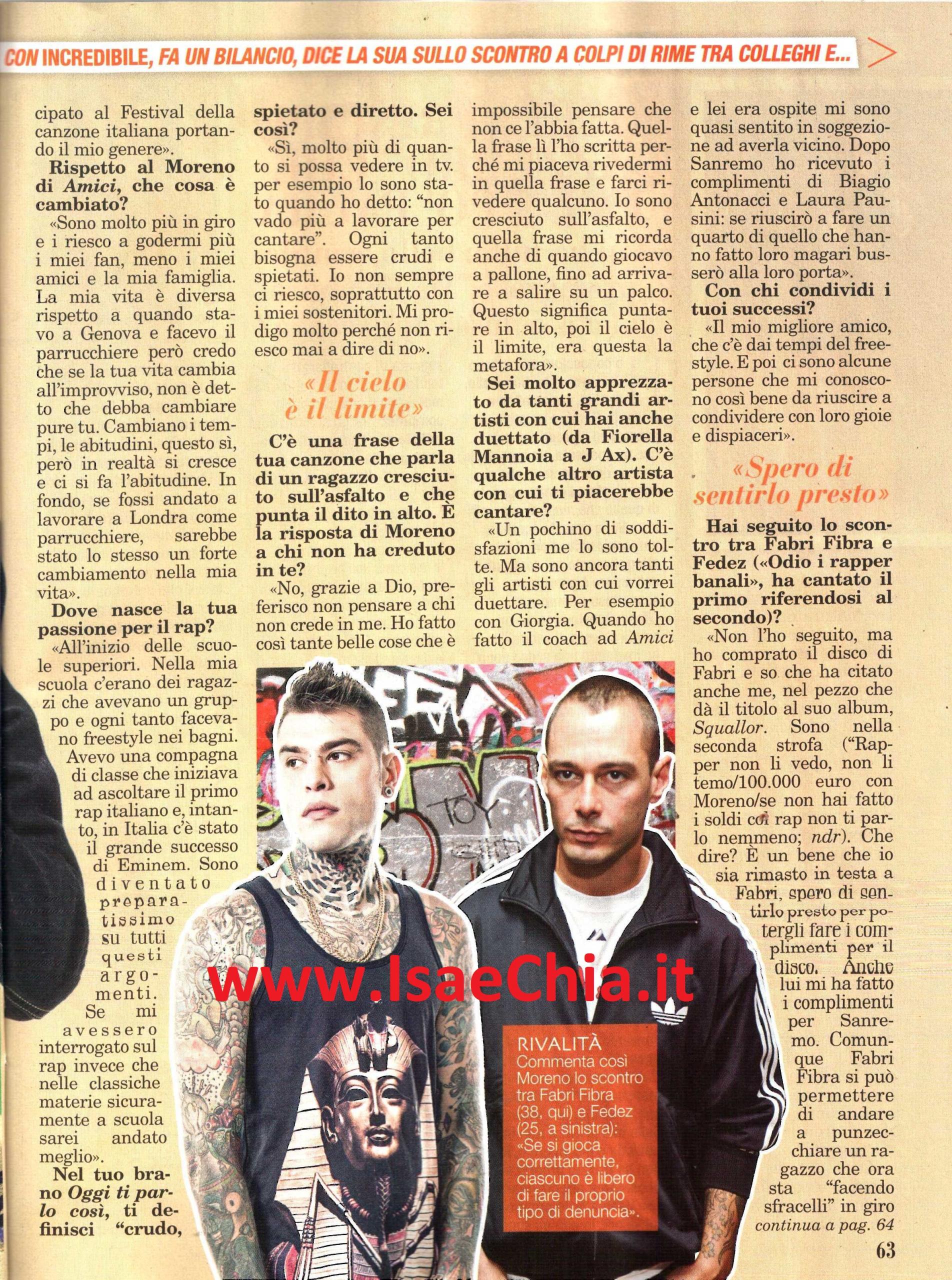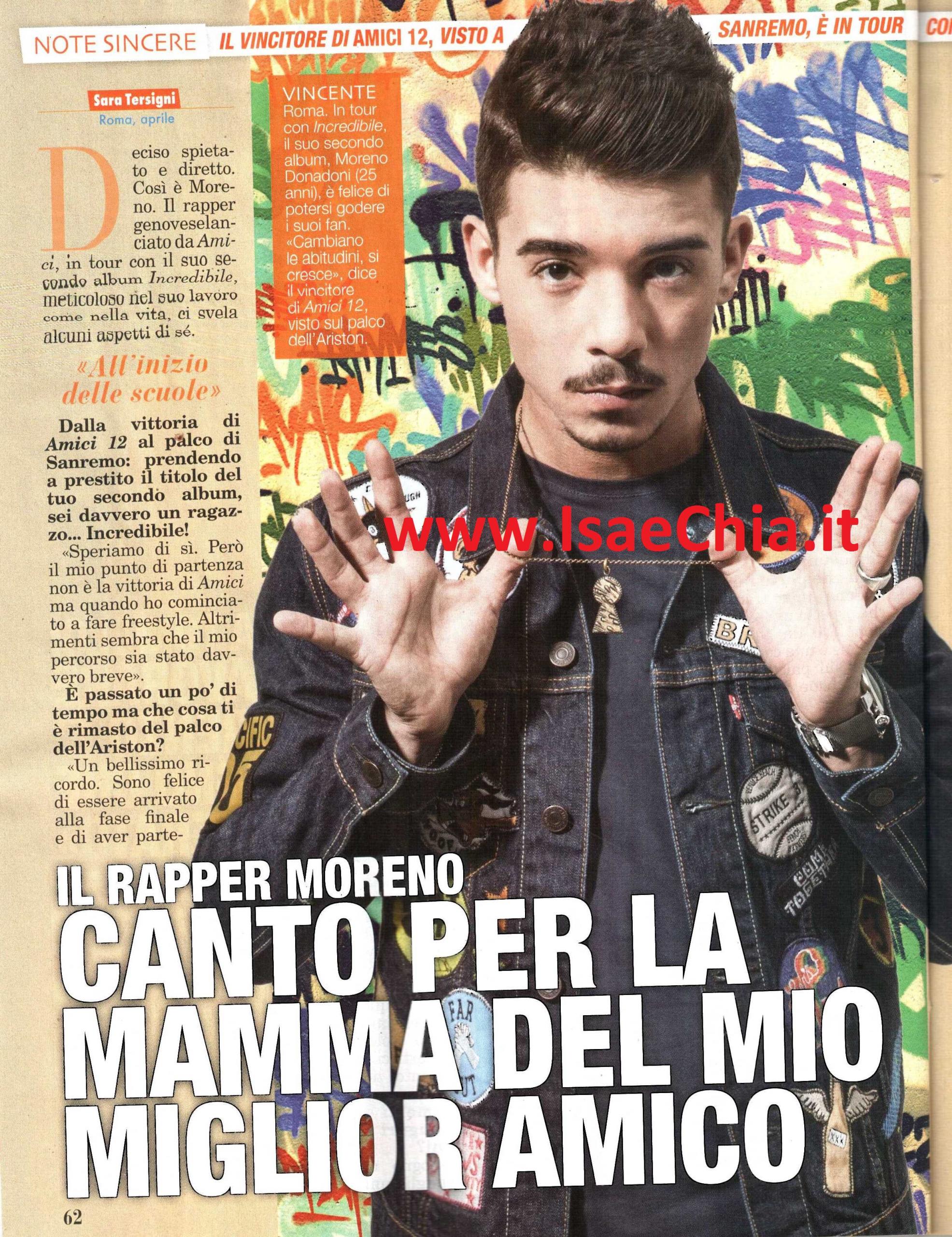 Dalla vittoria di Amici 12 al palco del Festival di Sanremo: il rapper Moreno Donadoni si è rivelato proprio come il titolo del suo secondo album: Incredibile. “Speriamo di sì! Il mio punto di partenza però non è Amici, ma quando ho iniziato a fare freestyle. Altrimenti sembra che il mio percorso sia stato davvero breve. Del palco dell’Ariston mi è rimasto un bellissimo ricordo. Sono felice di essere arrivato alla fase finale e di aver portato il mio genere a Sanremo. La mia vita è diversa rispetto a quando vivevo a Genova e facevo il parrucchiere, però credo che se la tua vita cambia all’improvviso, non è detto che debba cambiare pure tu. In fondo, se fossi andato a Londra a lavorare come parrucchiere, sarebbe stato lo stesso un forte cambiamento nella mia vita. La mia passione per il rap nasce all’inizio delle scuole superiori. Nella mia scuola c’erano dei ragazzi che avevano un gruppo e ogni tanto facevano freestyle nei bagni. Avevo una compagna di classe che iniziava ad ascoltare il primo rap italiano e intanto in Italia c’è stato il grande successo di Eminem. Sono diventato preparatissimo su tutti questi argomenti: se mi avessero interrogato sul rap anziché sulle classiche materie, sicuramente a scuola sarei andato meglio!“. Nel suo brano sanremese Oggi ti parlo così, lui si definisce “crudo, spietato, diretto”. Quando gli si chiede se è davvero così, Moreno risponde: “Sì, molto più di quanto si possa vedere in tv, per esempio lo sono stato quando mi sono detto: ‘Non vado più a lavorare per cantare’. Ogni tanto bisogna essere crudi e spietati, ma non sempre ci riesco, soprattutto con i miei sostenitori. Preferisco non pensare a chi non crede in me, ho fatto così tante belle cose che è impossibile pensare che non ce l’abbia fatta. Sono cresciuto sull’asfalto e sono arrivato a salire su un palco“. Quando gli si fa notare, invece, che è apprezzato da grandi artisti e ha duettato con nomi come J Ax e Fiorella Mannoia e gli si chiede con chi gli piacerebbe collaborare, rivela: “Un pochino di soddisfazioni me le sono tolte. Ma sono ancora tanti gli artisti con cui vorrei duettare, per esempio Giorgia. Quando l’ho avuta vicino ad Amici mi sentivo quasi in soggezione. Dopo Sanremo ho ricevuto i complimenti di Laura Pausini e Biagio Antonacci. Se riuscirò a fare un quarto di quello che hanno fatto loro, magari busserò alla loro porta. La canzone Sempre sarai, in cui ho duettato con la Mannoia, è il ricordo di una persona che non c’è più, la mamma del mio migliore amico. Gli ho fatto quest’omaggio, così quando lui è triste, può ricordarla così“. Quando gli si chiede, invece, se ha seguito lo scontro tra i suoi colleghi Fabri Fibra e Fedez, nato quando il primo ha cantato ‘Odio i rapper banali’ riferendosi al secondo, l’ex coach di Amici risponde: “Non l’ho seguito, ma ho comprato il disco di Fabri e so che ha citato anche me: ‘Rapper non li vedo, non li temo. 100.000 euro con Moreno; se non hai fatto i soldi col rap non ti parlo nemmeno’. Che dire? E’ un bene che sia rimasto nella sua testa, spero di sentirlo presto per fargli i complimenti per il disco. Anche lui mi ha fatto i complimenti per Sanremo. Comunque, Fabri si può permettere di andare a punzecchiare un ragazzo che ora sta ‘facendo sfracelli’ in giro, in senso positivo. Io sto sempre un po’ sulle mie, è difficile scuotermi e finché si gioca correttamente, ciascuno è libero di fare il proprio tipo di denuncia“.