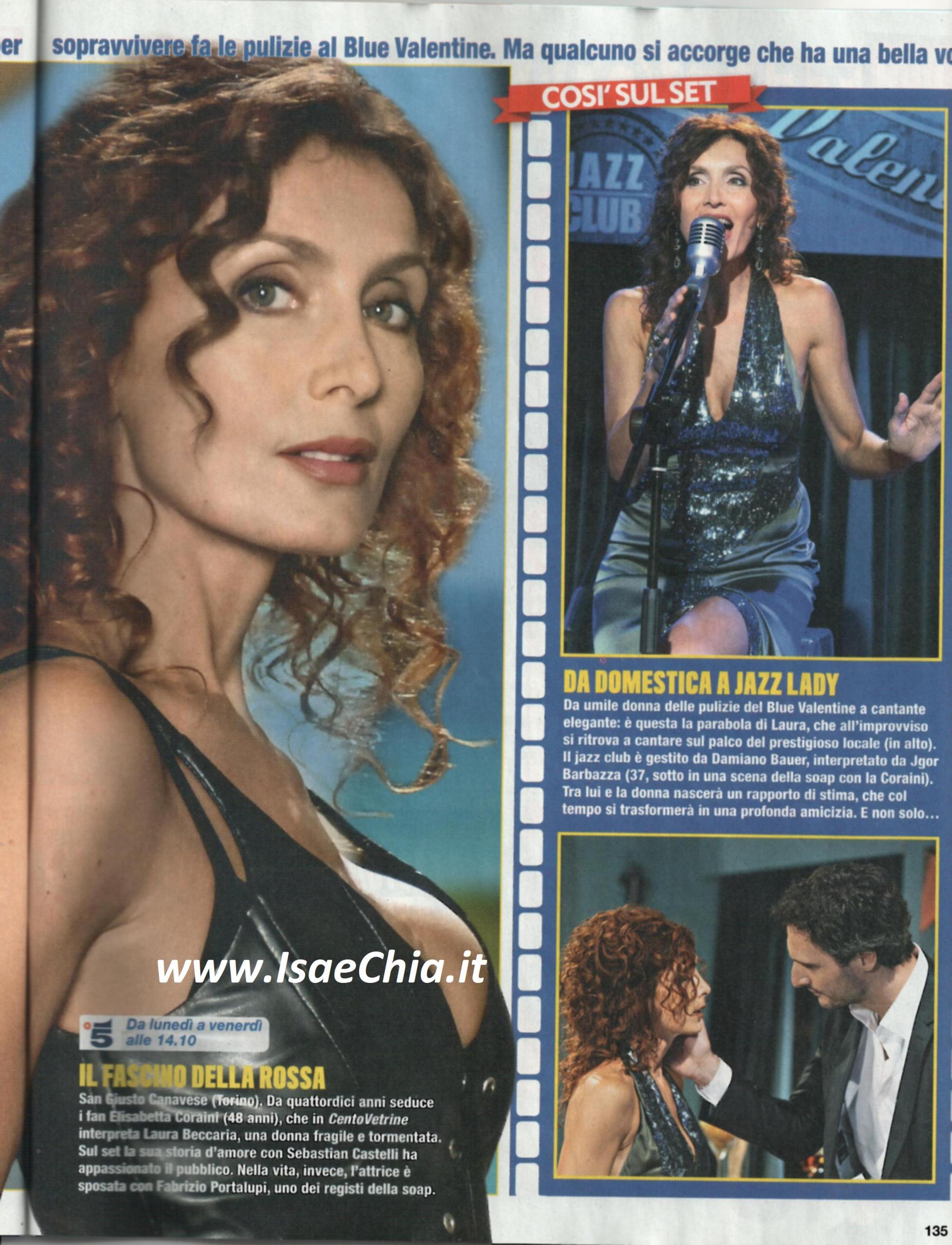 Elisabetta Coraini è uno dei volti storici della soap Centovetrine, in cui interpreta Laura Beccaria. In una delle ultime puntate, il suo personaggio prende in mano un microfono e canta un pezzo jazz, sfoderando una bellissima voce, tutta naturale, perché la Coraini, in realtà, ha studiato canto negli Stati Uniti: “Io canto nella vita, e mi sono divertita a farlo anche nella soap. Mi ha dato tanti stimoli e dopo 14 anni che interpreto lo stesso personaggio, ne avevo bisogno. Ho finalmente potuto esibirmi e portare sullo schermo qualcosa che mi rappresenta davvero. Nella soap interpreto un repertorio jazz, ma nella vita faccio rock nei locali torinesi e ho un repertorio basato su Lou Reed, rivisitato a modo mio. Ero giovanissima quando facevo la corista per Dori Ghezzi. Poi ho vissuto a Los Angeles: lì ho studiato canto e mi è servito parecchio. Mio marito Fabrizio Portalupi, oltre ad essere uno dei registi di Centovetrine, lui è anche musicista e incoraggia molto la mia carriera nel canto. Il mio sogno, però, è che qualcuno scrivesse un pezzo per me e fare un tour per portare uno show fatto di musica, arte e ospiti”. Infine, quando le si chiede qualche indiscrezione sulle prossime puntate, risponde: “Purtroppo Laura e Sebastian Castelli non torneranno insieme: questo rapporto, nel bene o nel male, ha segnato la loro vita. Damiano, uno dei gestori del locale dove Laura canta, la ammira molto e subisce il suo fascino. All’inizio sono solo confidenti, poi faranno crescere questa grande amicizia…”