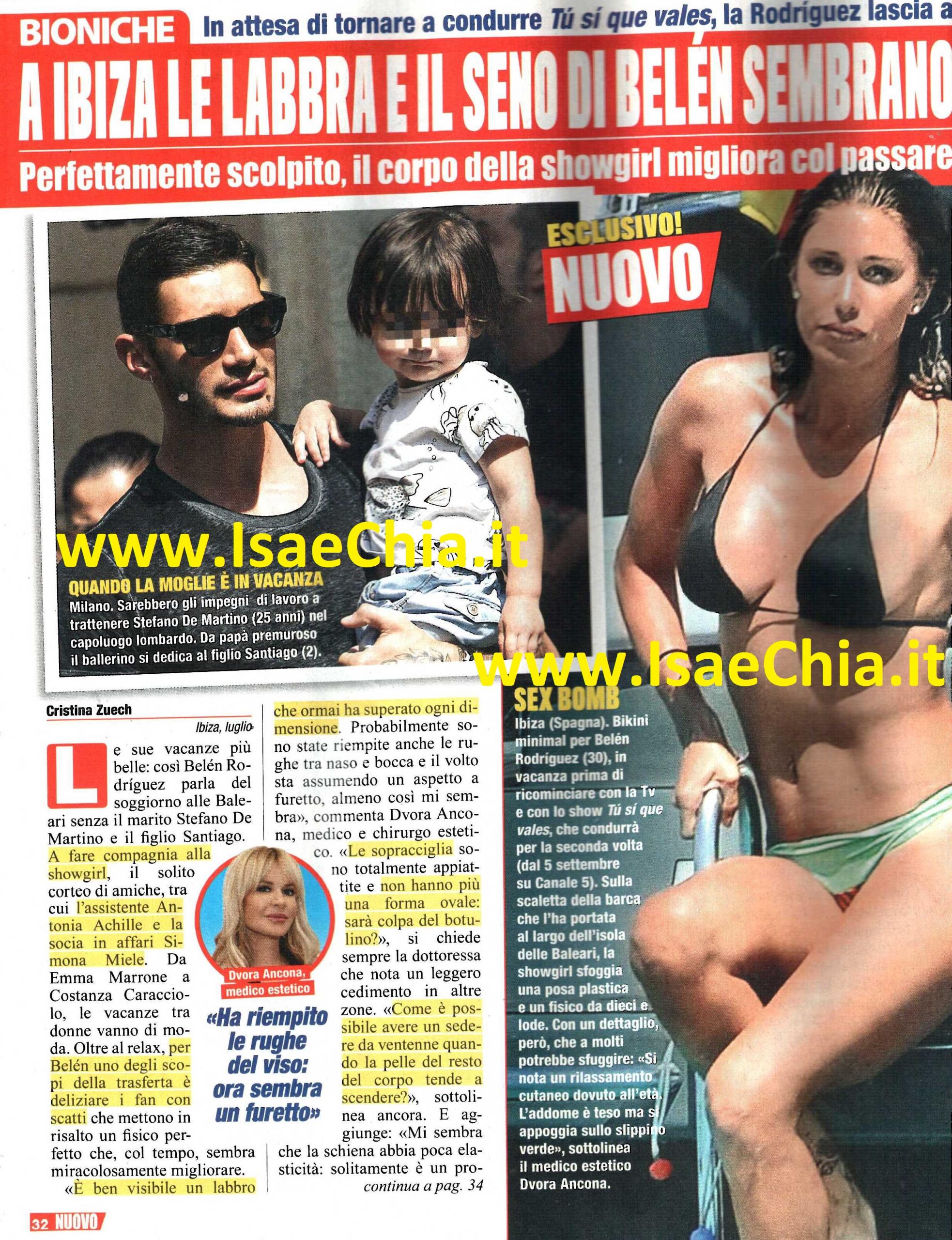 Ancora una volta, è lei la regina del gossip dell’estate: Belén Rodriguez. Anche adesso che è felicemente sposata con il suo Stefano De Martino, la showgirl di origini argentine continua a far parlare di sé mostrando le sue forme bombastiche sulle spiagge delle Baleari. Negli scorsi giorni, Belén ha postato sui social una foto con il suo lato B scolpito ben in vista, ricevendo tanti commenti positivi, ma anche tante critiche, ma lei si è giustificata dicendo che si allena tanto e che quindi è giusto mostrare il suo fisico (QUI la sua intervista); poi è stata paragonata con la sua imitatrice, Virginia Raffaele, e con le sue pose da sirenetta ha vinto la sfida a mani basse (QUI il post). Adesso, invece, in una vacanza tutta al femminile con l’assistente Antonia Achille e la socia in affari Simona Miele sulle spiagge di Ibiza, oltre al sedere perfetto come sempre, ha mostrato un seno più esplosivo del solito, che strizza nel suo striminzito bikini nero. E non solo! Anche le labbra sembrano ancora più carnose del solito. Che sia un effetto dell’esposizione prolungata al sole e all’acqua di mare? “E’ ben visibile un labbro che ha superato ogni dimensione. Probabilmente sono state riempite anche le rughe tra naso e bocca e il volto sta assumendo l’aspetto di un furetto, almeno così mi sembra” commenta Dvora Ancona, medico e chirurgo estetico. “Com’è possibile avere un sedere da ventenne quando il resto della pelle tende a scendere? Mi sembra che la schiena abbia poca elasticità: solitamente è un problema dovuto ad una dieta ultrarapida o all’età che avanza. E attenzione: mi pare che il collo stia cedendo. Ti consiglio di lavorare sul ringiovanimento, anziché sul riempimento della pelle!” aggiunge lei, confermando che anche il seno sembra più gonfio. Finito qui? No. Belén ne ha fatta un’altra: tra i giorni di vacanza con le amiche, vissuti come se fosse single, l’ex naufraga dell’Isola dei famosi ha presenziato alla festa per il 42esimo compleanno di Bobo Vieri. Il calciatore, già nel 2011, aveva scatenato la gelosia di Fabrizio Corona, all’epoca fidanzato di Belén. Ai presenti, chiaramente, non è sfuggito il feeling tra il festeggiato e l’invitata, che hanno trascorso gran parte della serata insieme. Non sarà geloso il suo Stefano?