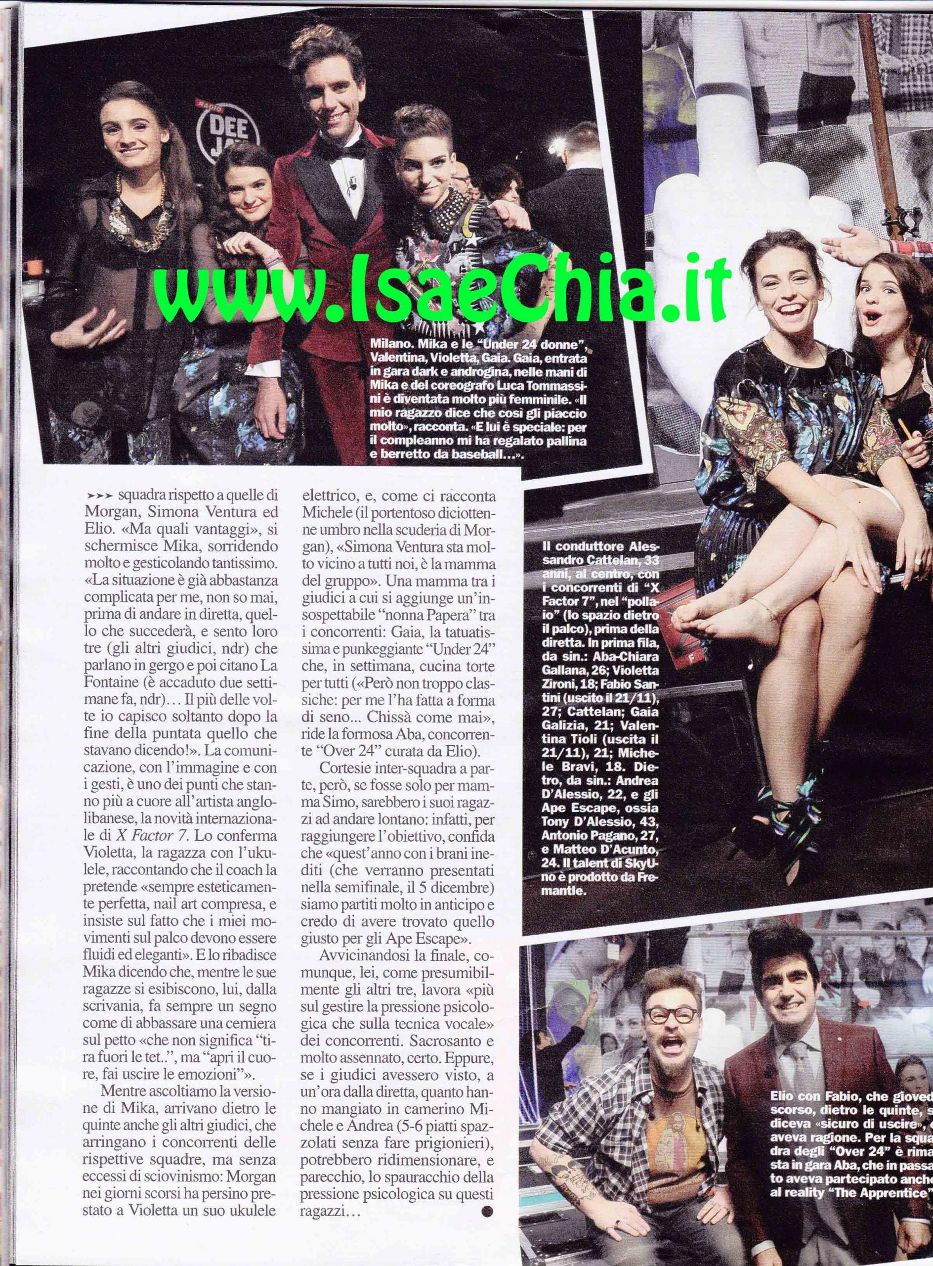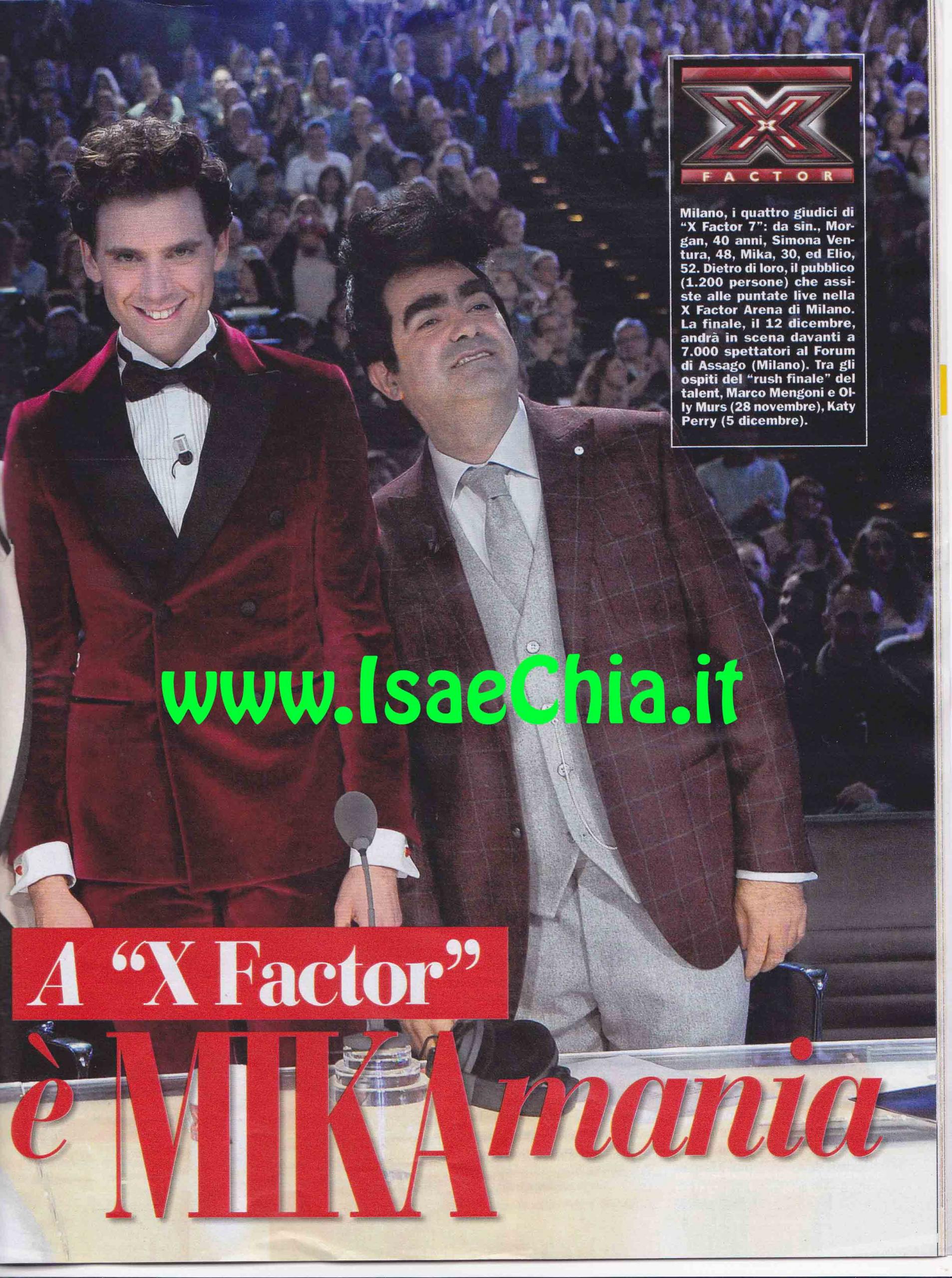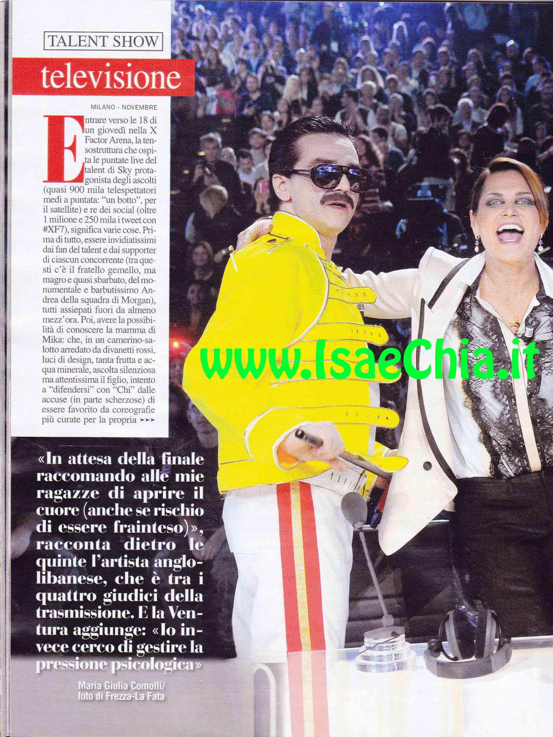 Mika, la new entry in qualità di giudice ad X Factor è stato accusato di essere favorito da coreografie più curate per la propria squadra e si difende: “Ma quali vantaggi. La situazione è già abbastanza complicata per me, non so mai, prima di andare in diretta, quello che succederà e sento loro (i giudici ndr) che parlano in gergo e poi citano La Fontaine… Il più delle volte io capisco soltanto dopo la fine della puntata quello che stavano dicendo!”. La comunicazione con i gesti e con l’immagine sta molto a cuore all’artista anglo-libanese e lo conferma Violetta, una delle sue concorrenti: “Sempre esteticamente perfetta, nail art compresa, e insiste sul fatto che i miei movimenti sul palco devono essere fluidi ed eleganti”. E lo ribadisce Mika dicendo che, mentre le sue ragazze si esibiscono, lui dalla scrivania fa sempre un segno di come abbassare una cerniera sul petto: “che non significa tirare fuori le te***, ma apri il cuore, fai uscire le emozioni”. Michele della squadra di Simona Ventura, invece, dice di lei: “Sta molto vicino a tutti noi, è la mamma del gruppo”. Secondo lei, sarebbero i suoi ragazzi ad andare lontano: “Quest’anno con i brani inediti siamo partiti molto in anticipo e credo di aver trovato quello giusto per gli Ape Escape”. Avvicinandosi la finale, comunque, lei lavora molto “più sul gestire la pressione psicologica che sulla tecnica vocale” dei concorrenti”.