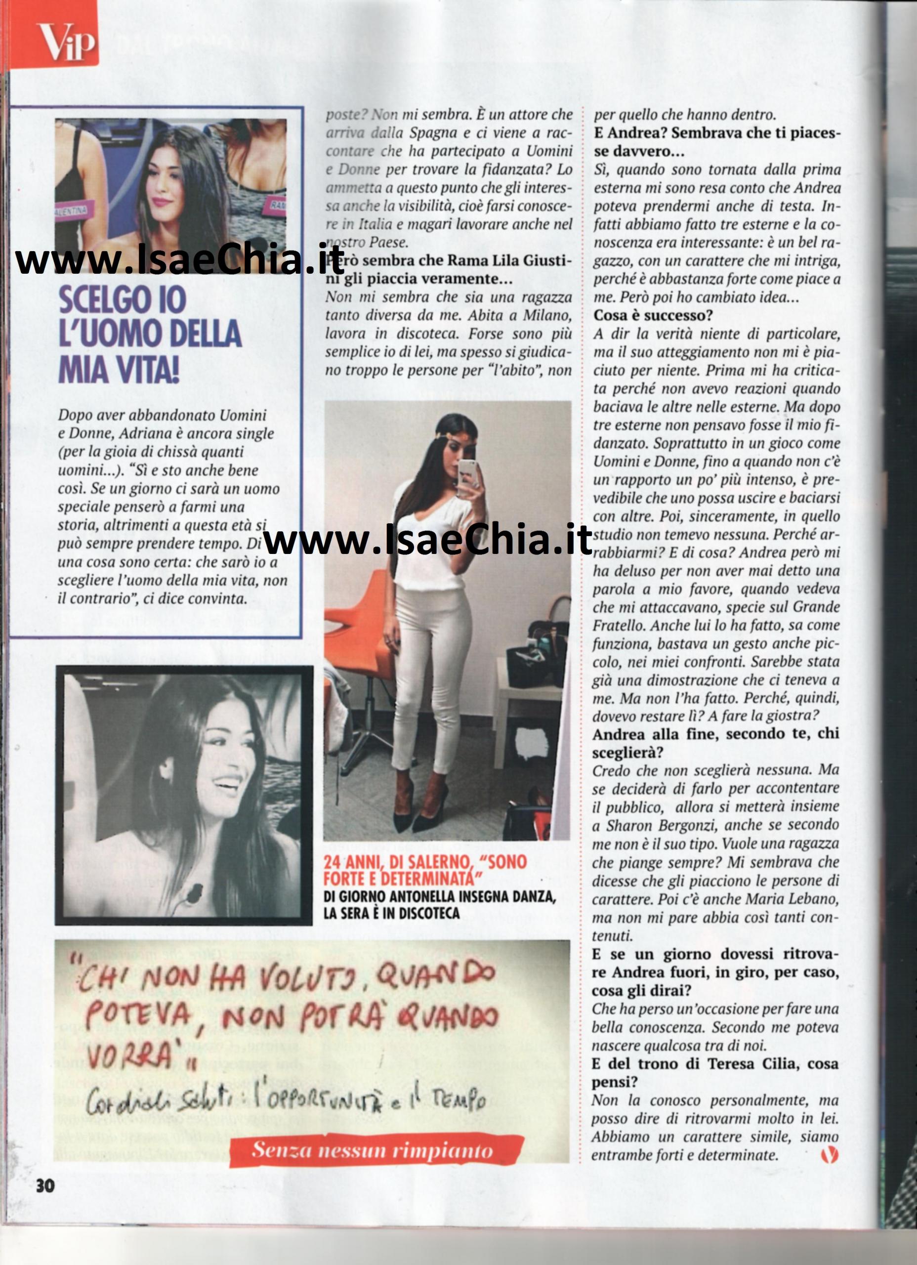 Sembrava aver colpito i tronisti di quest’edizione di Uomini e donne, ma in realtà non è stato così: Adriana Peluso, dopo aver dovuto abbandonare il Grande fratello dopo poche settimane, ha dovuto accettare la stessa sorte anche a Uomini e donne. Adesso, intervistata, spiega i motivi per cui è uscita dal programma: “Nella vita non sono una corteggiatrice, è l’uomo che deve fare il primo passo” dice lei. “Mi sono eliminata perché non sopportavo più le critiche che mi buttavano addosso. Andrea Cerioli non ha mai preso le mie difese. La ragazza che due anni fa ha partecipato al Grande fratello, oggi ha le idee molto chiare e se potesse tornare indietro non parteciperebbe allo show di Maria De Filippi: “Di sicuro non accetterei di tornare a corteggiare nessuno e non so nemmeno se accetterei il trono. E dire che prima sognavo di essere tronista! Non ho ripensamenti: con Jonás Berami non era scattato nulla, e di Andrea non mi è piaciuto il comportamento in alcune occasioni: lì in studio a scaldare la sedia come fanno altre, no. Jonás è stato incoerente nell’eliminarmi: quando siamo stati in esterna, siamo stati bene, ma tornati in studio, mi ha detto che non gli piacevano i miei atteggiamenti, le mie “cose da vip”. Oltre che incoerente, mi è sembrato forzato, perché ha seguito ciò che diceva il pubblico, che contestava tutto ciò che dicevo. Mi contestavano che avessi partecipato al GF, ma non capisco che fastidio potesse dare a Jonás: lui fa l’impiegato alle poste? Non mi sembra! Ammetta che gli interessa acquisire più visibilità in Italia e poter lavorare!”. Quando le si fa notare che però il bell’attore spagnolo sembra davvero interessato a Rama Lila Giustini, lei risponde: “Non mi sembra una ragazza molto diversa da me: abita a Milano, lavora in discoteca. Forse io sono più semplice di lei, ma si giudicano le persone per “l’abito”. Andrea mi piaceva davvero: dopo la prima esterna ho capito che poteva prendermi anche di testa. Dopo tre esterne ho pensato che fosse un bel ragazzo, interessante, forte come piace a me. Poi, però, ho cambiato idea. Prima mi ha criticato perché non avevo reazioni quando baciava altre in esterna: dopo tre esterne non pensavo fosse il mio fidanzato! E poi in quello studio non temevo nessuna. Perché arrabbiarmi? Andrea non ha mai detto una parola in mio favore quando mi attaccavano per il Grande fratello, eppure anche lui l’ha fatto. Bastava un piccolo gesto nei miei confronti, ma non l’ha fatto. Perché rimanere lì? A fare la giostra? Credo che alla fine non sceglierà nessuna. Ma se deciderà di farlo per accontentare il pubblico, sceglierà Sharon Bergonzi. Vuole una ragazza che piange sempre? Mi sembrava ne volesse una con carattere. Se dovessi rincontrarlo, gli direi che ha perso un’occasione”. Infine, la bella salernitana conclude commentando l’altra tronista, Teresa Cilia: “Non la conosco personalmente, ma mi ritrovo molto in lei. Abbiamo un carattere simile, siamo entrambe forti e determinate!”.