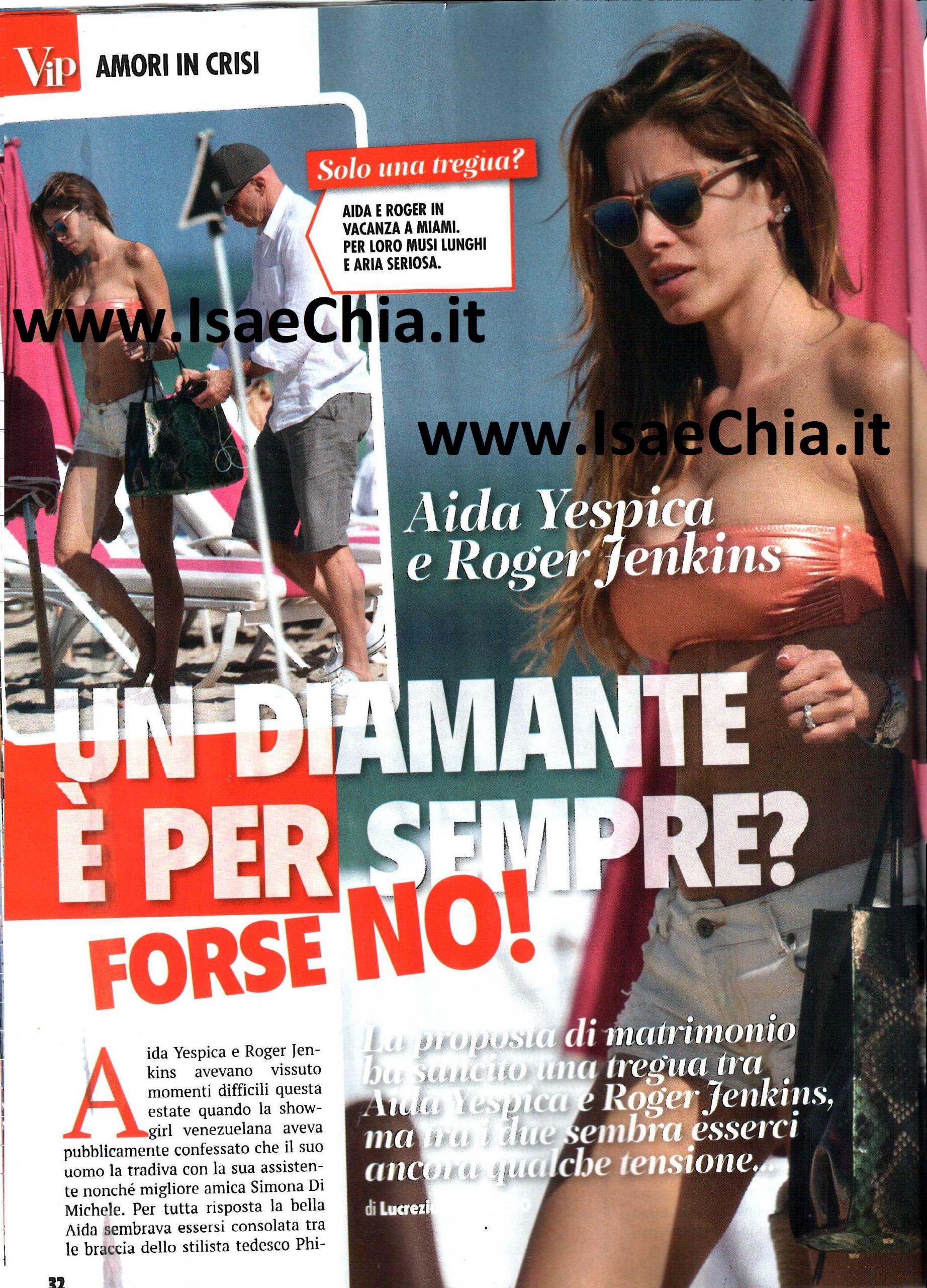 Non sembra proprio riuscire a trovare una stabilità in amore la bellissima Aida Yespica. Recentemente, infatti, l’ex naufraga aveva pubblicamente confessato che il suo uomo, Roger Jenkins, la tradiva con la sua amica Simona Di Michele. Di tutta risposta, la showgirl venezuelana si era consolata tra le braccia dello stilista tedesco Philipp Plein. Ma pare che la guerra sia durata poco: Jenkins, infatti, sarebbe tornato pentito all’ovile con uno splendido dono per la sua amata: un anello di fidanzamento. Ecco le foto di Aida, tanto per cambiare in vacanza al mare a Miami, in costume da bagno, shorts e…tanto di brillocco! I due non sembrano affiatati, ma piuttosto tesi e Aida è distratta sempre dal suo cellulare. Le nozze sono state annunciate, ma la verità è che un anello non basta per arrivarci!