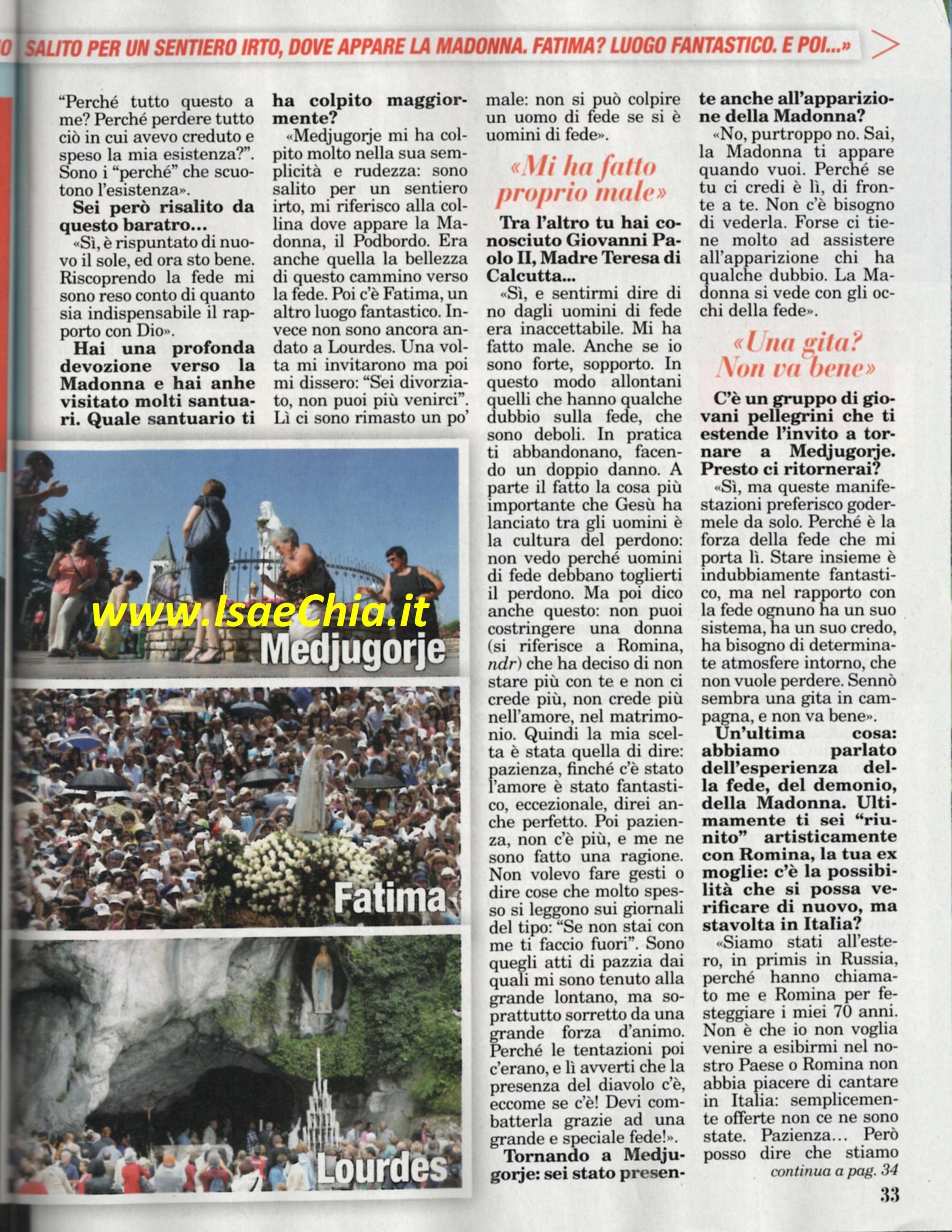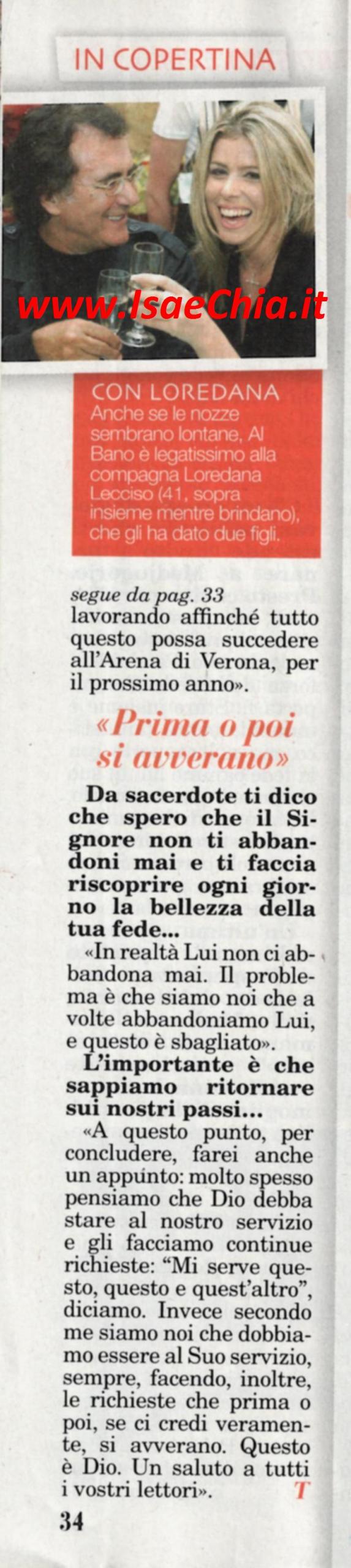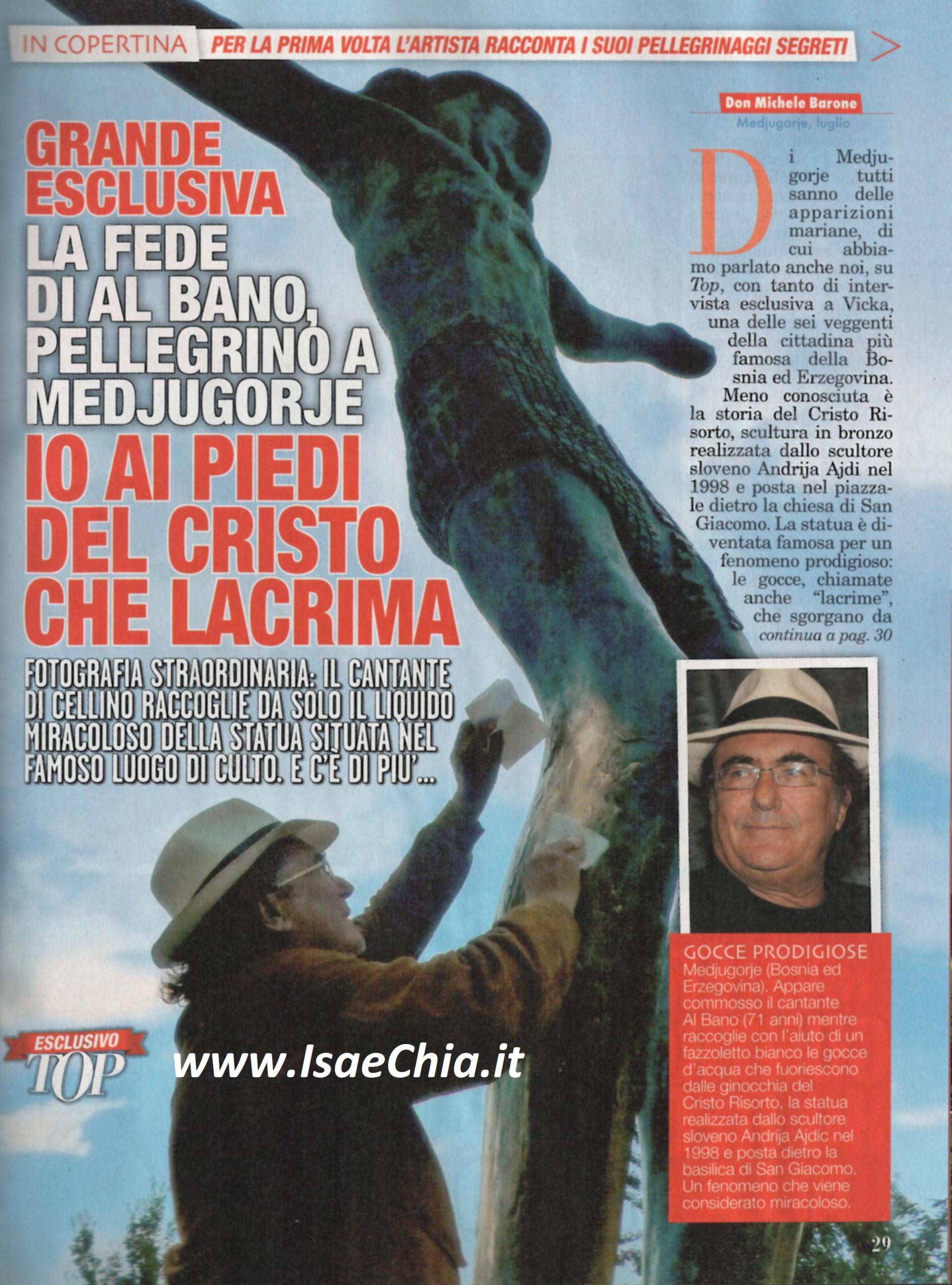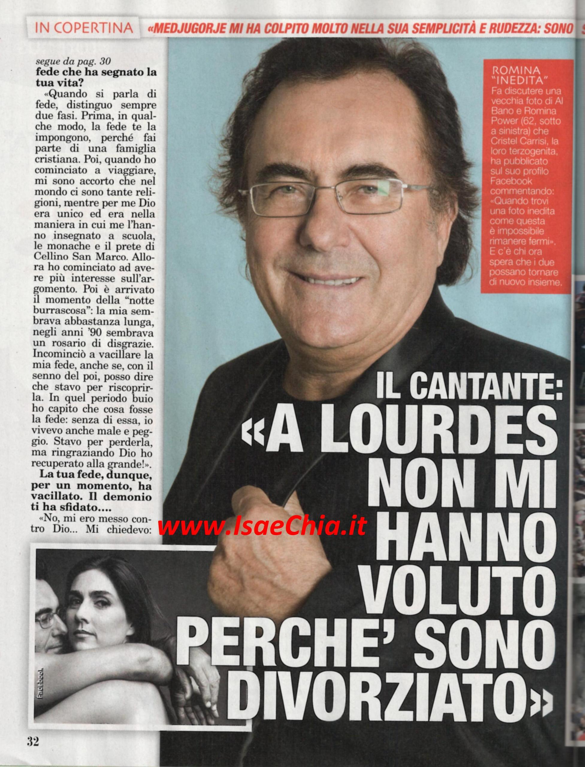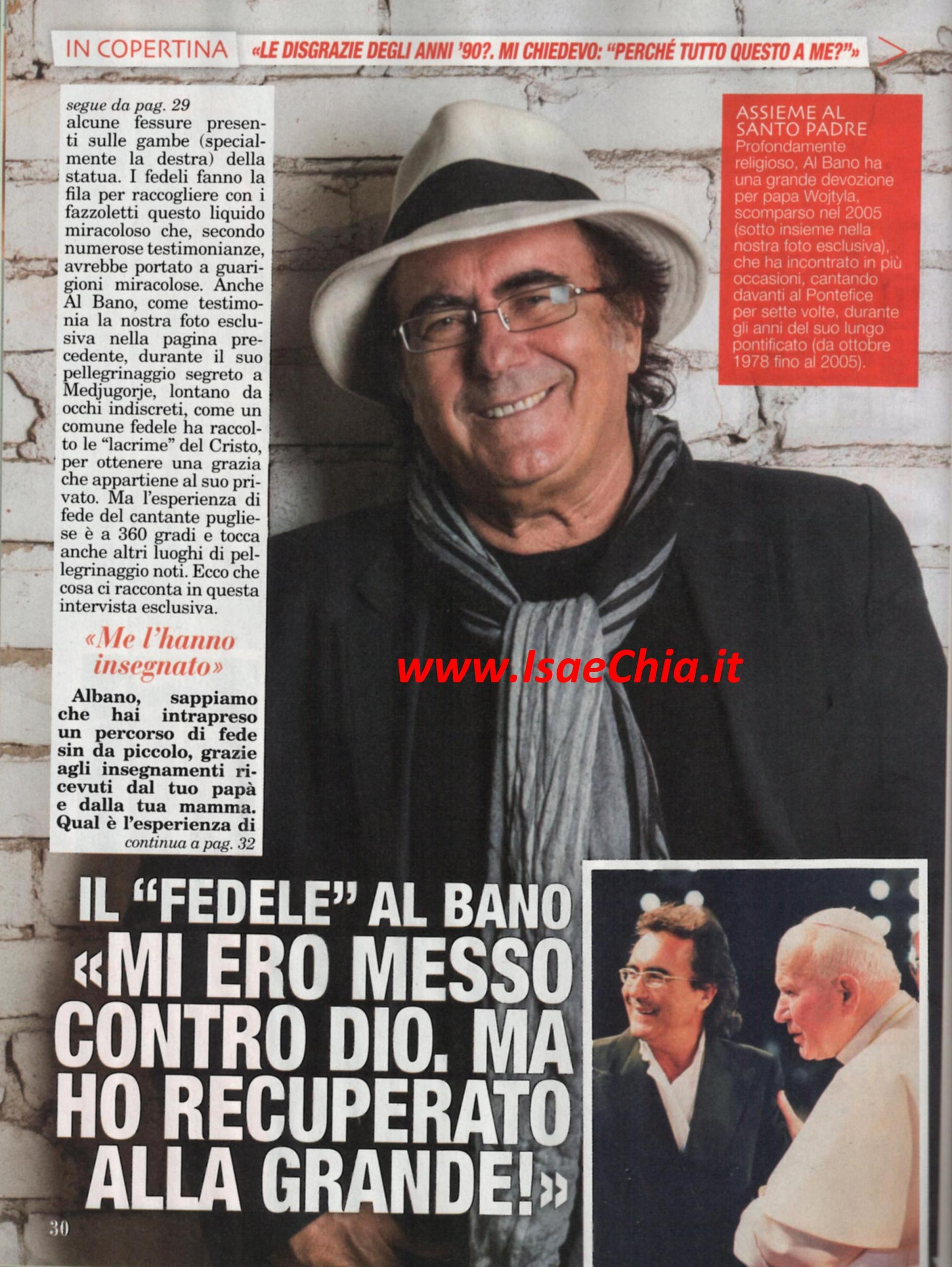 Il cantante Al Bano racconta a Top il suo pellegrinaggio al santuario di Medjugorje e il suo lungo percorso di fede: “Quando si parla di fede io parlo sempre di due fasi: la prima, in cui ti viene imposta dai tuoi genitori, e una seconda. Quando ho cominciato a viaggiare, mi sono accorto che esistevano tante religioni, anche se Dio è uno solo, e ho cominciato a provare interesse per queste. Poi è arrivata la lunga notte burrascosa: negli anni ’90 il mio sembrava un rosario di disgrazie. Incominciò a vacillare anche la mia fede, anche se col senno di poi, so che iniziavo a riscoprirla. Mi ero messo contro Dio, mi chiedevo: “Perché tutto questo a me? Perché perdere tutto ciò in cui avevo creduto e per cui avevo speso la mia esistenza?”. Ora però ho recuperato la mia fede. Il santuario di Medjugorje mi ha colpito per la sua semplicità e rudezza: sono salito lungo un sentiero irto, ma è anche questo il bello del cammino della fede. A Lourdes mi hanno invitato una volta, ma poi mi dissero “Sei divorziato, non puoi più venire”. Lì ci sono rimasto male: non si può colpire un uomo di fede se si è uomini di fede. Io ho conosciuto Papa Giovanni Paolo II e Madre Teresa di Calcutta e sentirmi dire di no da altri uomini di fede è inaccettabile, ma in questo modo ho allontanato coloro che preferiscono abbandonarti anziché perdonarti, come insegna Gesù. E poi non posso costringere una donna, in questo caso Romina Power, ad amarmi, a credere in un matrimonio in cui non crede più. Purtroppo a Medjugorje non ho assistito all’apparizione della Madonna, ma io penso che la Madonna ti appare quando vuoi e chi ci tiene all’apparizione ha dei dubbi nella propria fede”. Infine, quando gli si chiede se c’è la possibilità di una reunion artistica con Romina anche in Italia, l’ex naufrago risponde: “Non è che io non abbia piacere o non voglia esibirmi di nuovo con lei in Italia, semplicemente offerte non ce ne sono state. Pazienza! Però stiamo lavorando perché possa succedere all’Arena di Verona, il prossimo anno!”