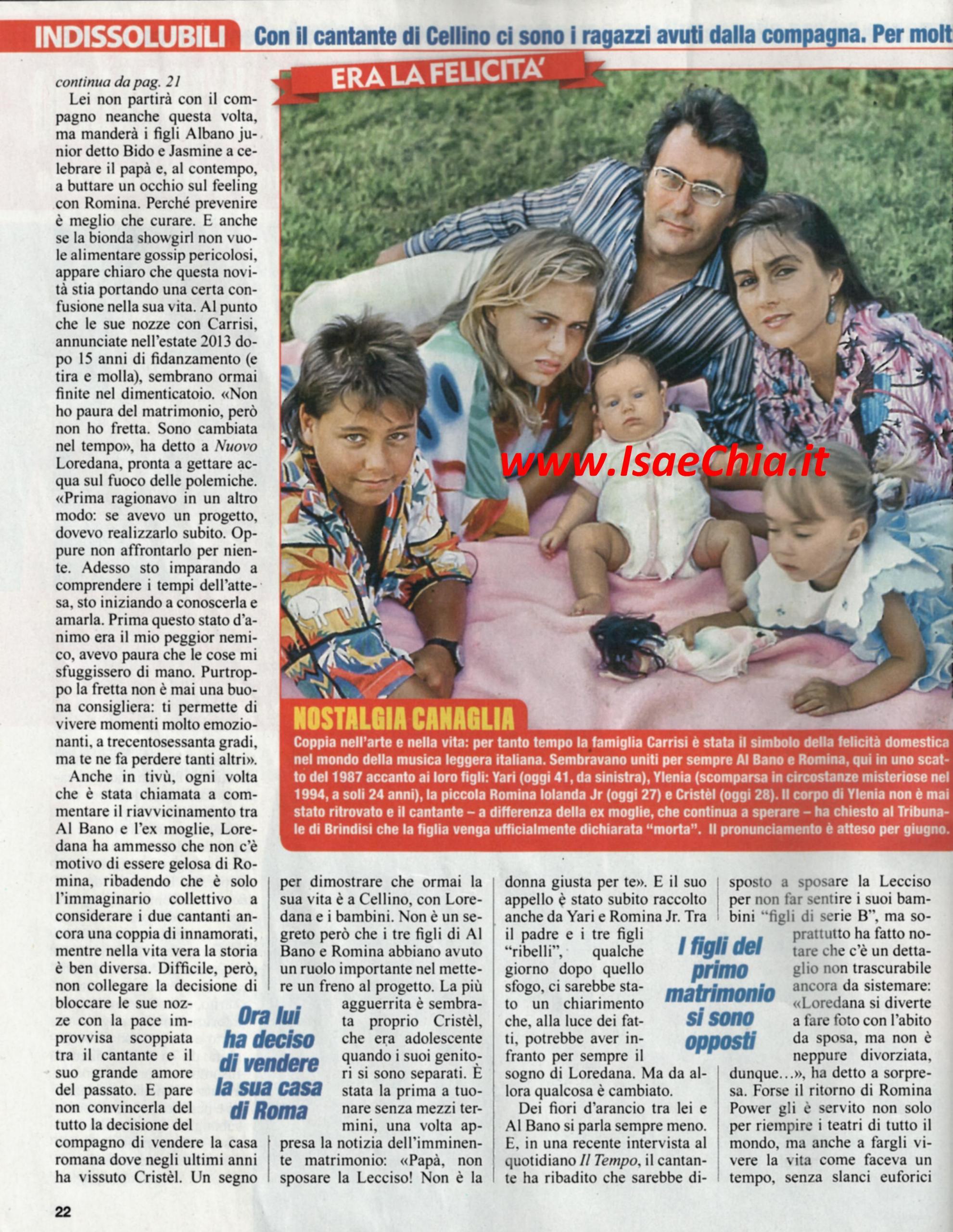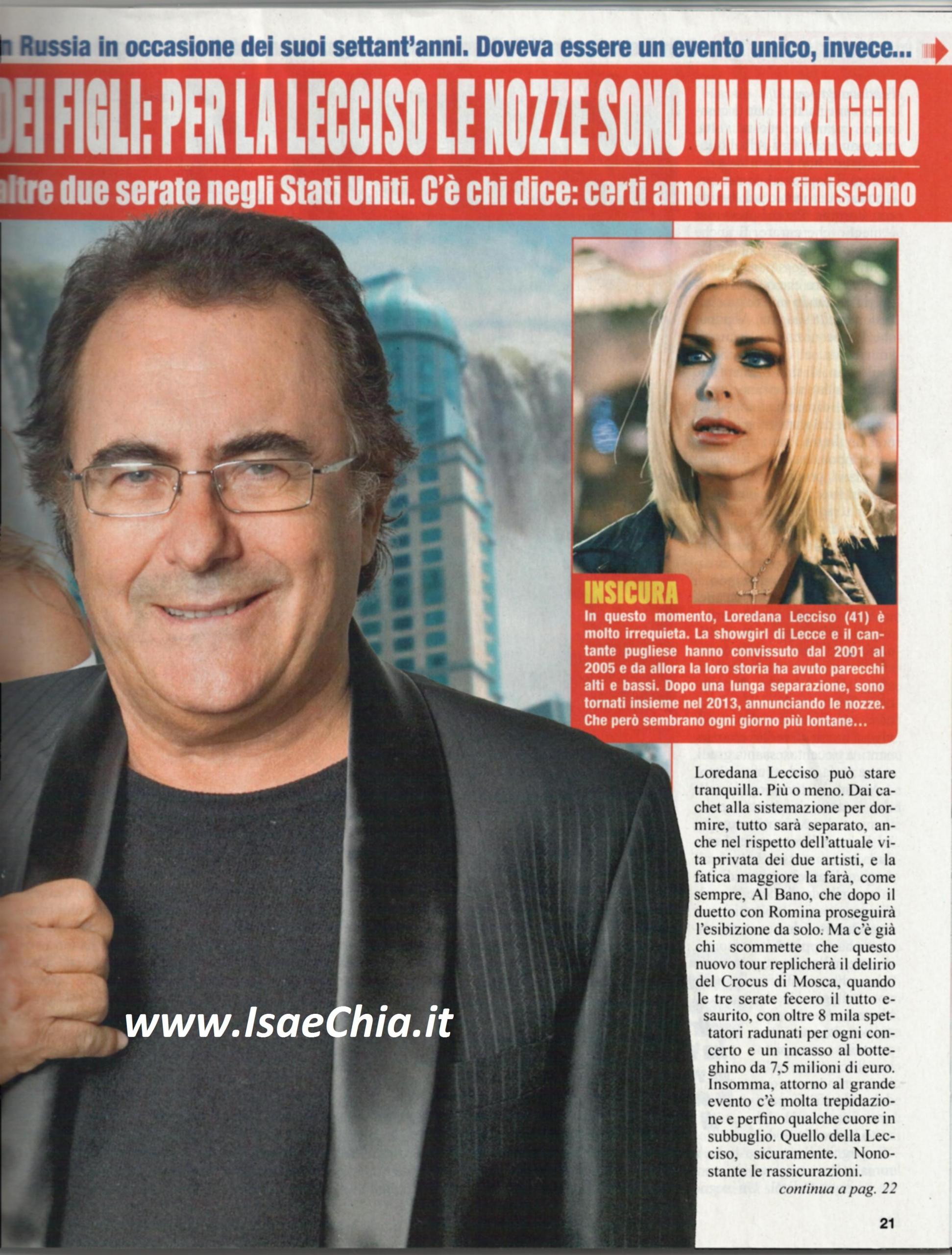 Dopo il successo del loro concerto a Mosca, con un incasso al botteghino da 7,5 milioni di euro, Al Bano e Romina Power sono tornati a cantare in occasione il 3 e il 4 maggio in un resort tra Stati Uniti e Canada. Loredana Lecciso, attuale compagna di lui, però, può stare tranquilla: dal cachet alla sistemazione nell’albergo è tutto separato per i due cantanti. Nemmeno stavolta la Lecciso prenderà parte al concerto, ma manderà i figli, Bido e Jasmin a dare un occhio sul feeling tra il padre e l’ex moglie. Pare, infatti, che il ritorno della coppia Al bano e Romina stia portando un po’ di trambusto nella vita della Lecciso. Le nozze, annunciate per il 2013 dopo 15 anni di fidanzamento fatti di tira e molla, sono slittate a data da destinarsi. “Non ho paura del matrimonio, però non ho nemmeno fretta. Prima ragionavo diversamente: se avevo un progetto, dovevo metterlo in atto subito. Adesso sto imparando a comprendere i tempi dell’attesa, a conoscerla, ad amarla, mentre prima questo stato d’animo era il mio peggior nemico” ha dichiarato lei. Anche se lei non si dichiara gelosa, è difficile non credere che non ci sia alcun nesso con il rinvio delle nozze. Inoltre, pare che Romina non sia d’accordo con la decisione di Al Bano di vendere la casa di Roma dove viveva la figlia Cristèl. Quest’ultima infatti, era particolarmente contraria alle nozze tra il padre e Lory, esclamando “Non è la donna giusta per te”. Ma la scelta di sposarla sembra dettata dalla volontà che i figli avuti da lei non siano “di serie B”. Come finirà?