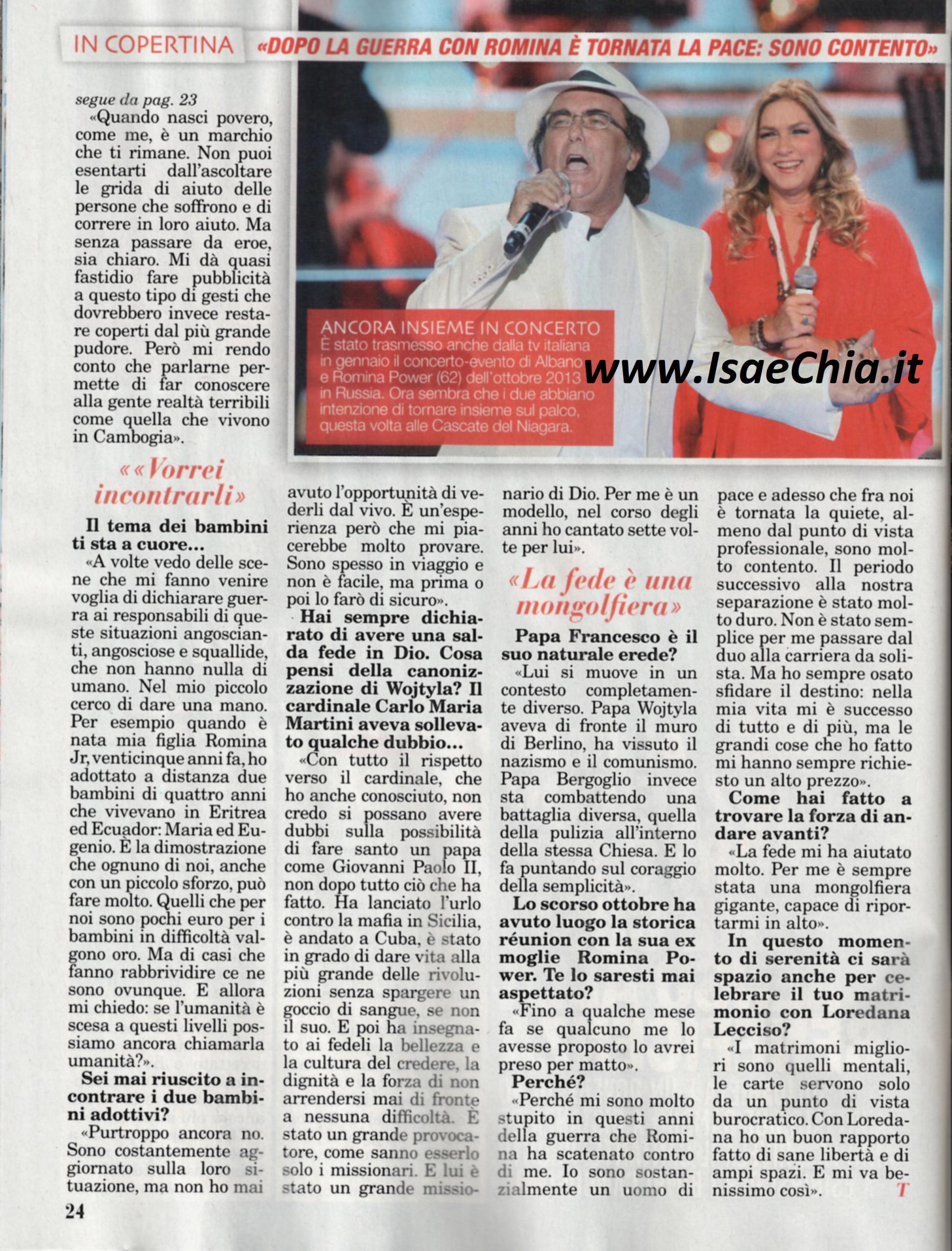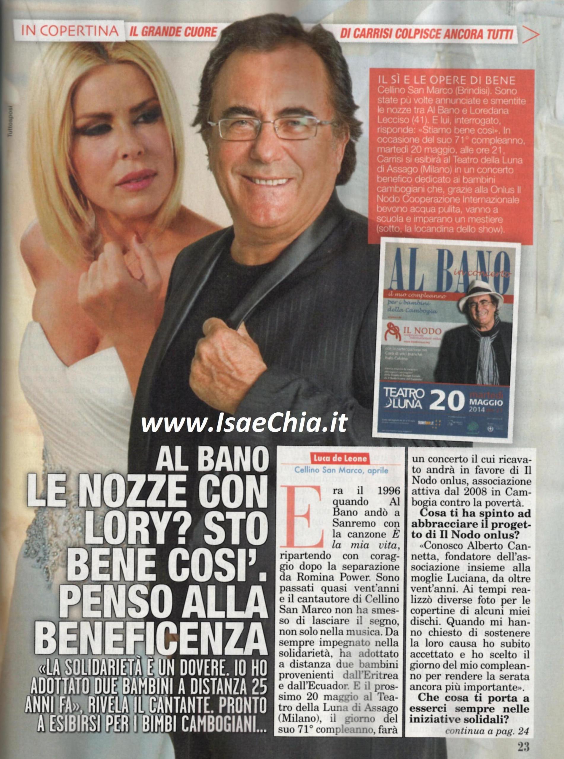 Ultimamente il cantante Al Bano aveva dichiarato di voler sposare Loredana Lecciso, con la quale è tornato dopo un lungo periodo di separazione. Poi lei aveva rivelato che non tutti erano pronti ad accettare questo passo e che per lei era come se fossero già sposati. Adesso l’ex naufrago fa un altro passo indietro: “I matrimoni migliori sono quelli mentali, le carte servono solo da un punto di vista burocratico. Con Loredana ho un buon rapporto, fatto di sane libertà e di ampi spazi. E mi va bene così”. Contemporaneamente, ci è stato un riavvicinamento con l’ex moglie Romina Power, che ha duettato con lui in Russia in occasione del concerto alla sua carriera: “Fino a qualche mese fa, se me lo avesse proposto qualcuno l’avrei preso per matto. Mi sono stupito per questi anni della guerra che Romina ha scatenato contro di me. Io sono sostanzialmente un uomo di pace e ora che tra noi è tornata la quiete, almeno dal punto di vista professionale, sono contento. Il periodo successivo alla nostra separazione è stato molto duro. Ma ho sempre sfidato il destino e le grandi cose che ho fatto hanno sempre richiesto un alto prezzo”. Nel frattempo, Al Bano si dedica a altri progetti di beneficenza: “Quando nasci povero come me, non puoi esentarti dall’ascoltare le grida di chi soffre e di correre in loro aiuto. Ho adottato a distanza due bambini che vivevano in Eritrea e in Ecuador: ognuno di noi, anche con un piccolo sforzo, può fare molto. Purtroppo non sono mai riuscito ad incontrarli, ma sono sempre aggiornato sulla loro situazione. Ma sono sempre in viaggio e prima o poi lo farò di sicuro: è un’esperienza che prima o poi vorrei provare”.
