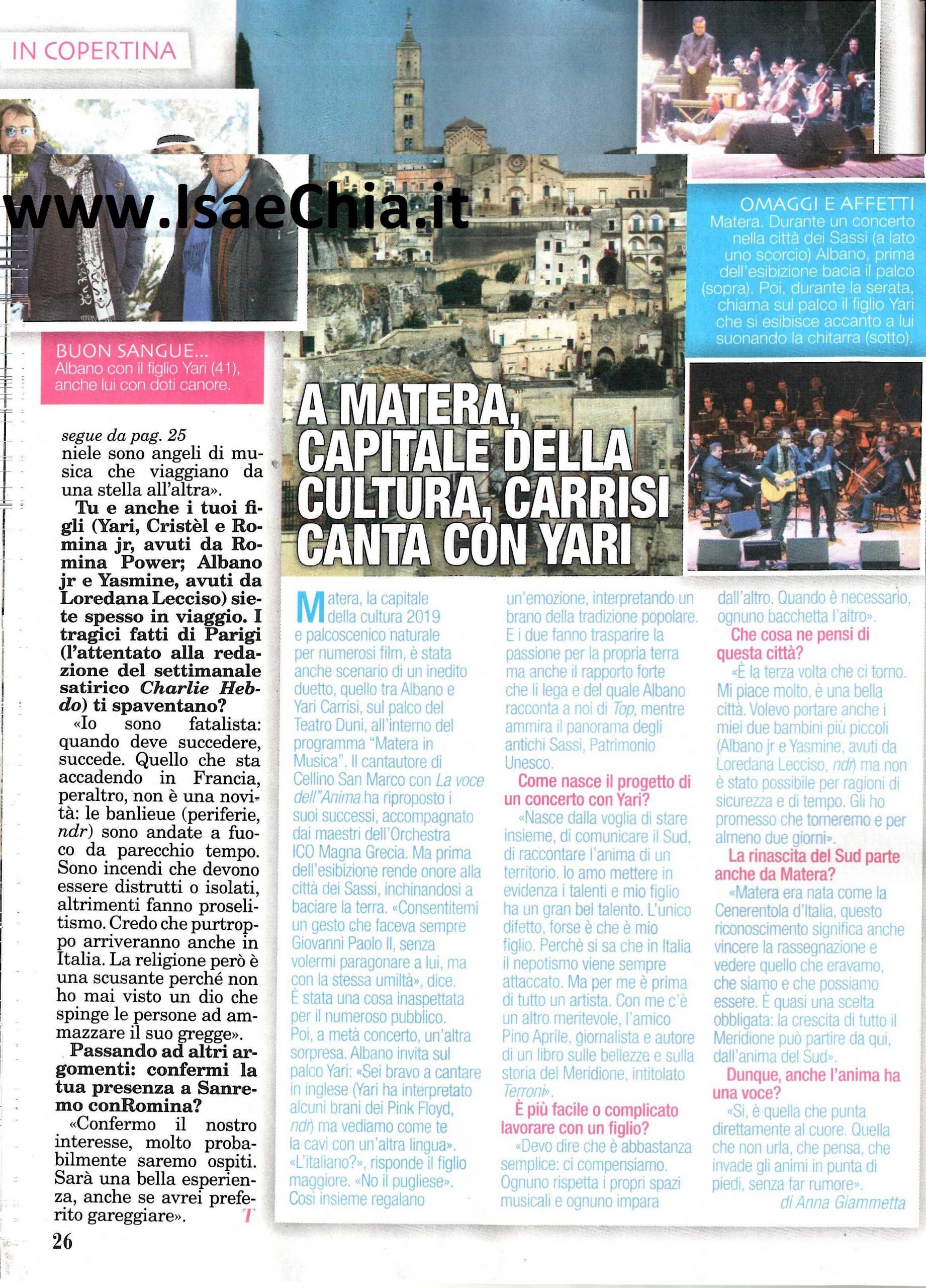 Il cantante Al Bano ha recentemente pubblicato un libro di ricette, La cucina del sole. Le mie ricette del cuore, che unisce i suoi tre grandi amori: sua mamma Jolanda, la sua terra e la cucina. “Finora avevo scritto su argomenti come la religione e le esperienze della mia vita. Ho voluto dare spazio anche a questa mia passione che è la cucina: adoro creare piatti, ma non per averlo imparato dagli altri. Ho girato il mondo in lungo e in largo e ho scoperto il piacere di sperimentare ciò che ho visto in giro per il Pianeta. Mia madre, invece, rappresenta per me la storia della cucina. Da lei ho appreso molti trucchi, ma in realtà ho preso confidenza con i fornelli quando sono andato a vivere da solo a Milano. Ho fatto anche tanti mestieri, tra cui il cameriere e il pizzaiolo e molte cose imparate le ho portate con me. Mia madre è ed è stata una compagna di viaggio straordinaria. Ha 93 anni e l’altra sera è venuta a Taranto per vedere un mio spettacolo! A un certo punto la gente si è accorta della sua presenza ed ha iniziato ad osannarla! Dopo l’operazione che ha subito, adesso sta bene. Da mesi era in cura per un fantomatico virus che i medici non riuscivano ad eliminare. Una sera la vedevo strana e decisi di rimanere a dormire al suo fianco. Intorno alle due di notte, sento il letto tremare e capisco che sta malissimo. La portiamo in ospedale e scopriamo dei calcoli renali mai diagnosticati e andati in putrefazione! Il mio istinto le ha salvato la vita“. Quando gli si chiede cosa ha provato alla notizia di due grandi nomi della musica italiana, Pino Daniele e Mango, risponde: “Tutti noi artisti facciamo questo lavoro con il cuore e, a lungo andare, il cuore ne soffre. Mango e Pino Daniele sono angeli della musica che viaggiano da una stella all’altra“. Sui recenti tragici eventi di Parigi (l’attentato terroristico alla redazione del settimanale satirico Charlie Hebdo), invece, l’ex naufrago commenta: “Io sono fatalista, quando deve succedere, succede. Quello che sta accadendo, peraltro, non è nuovo: la periferia è in fuoco da parecchio tempo. Purtroppo temo che arriveranno anche in Italia. La religione è una scusante: non ho mai visto un dio che spinge le persone ad ammazzare il suo gregge“. Infine, quando gli si chiede della presenza al Festival di Sanremo con la sua ex moglie Romina Power, che è stata confermata proprio ieri (QUI per leggere l’articolo), aveva risposto: “Confermo il nostro interesse. Probabilmente saremo ospiti. Sarà una bella esperienza, anche se avrei preferito gareggiare!“
