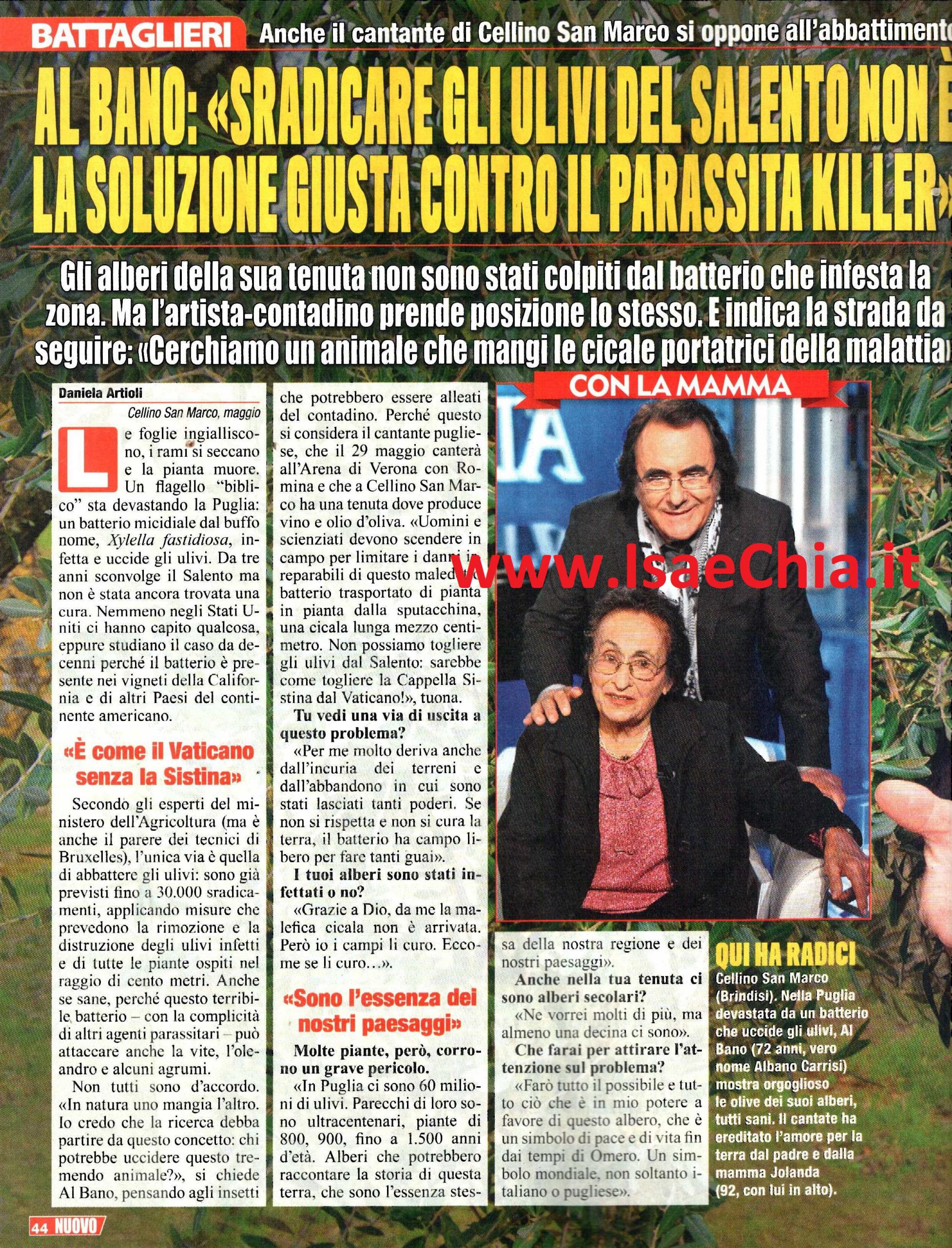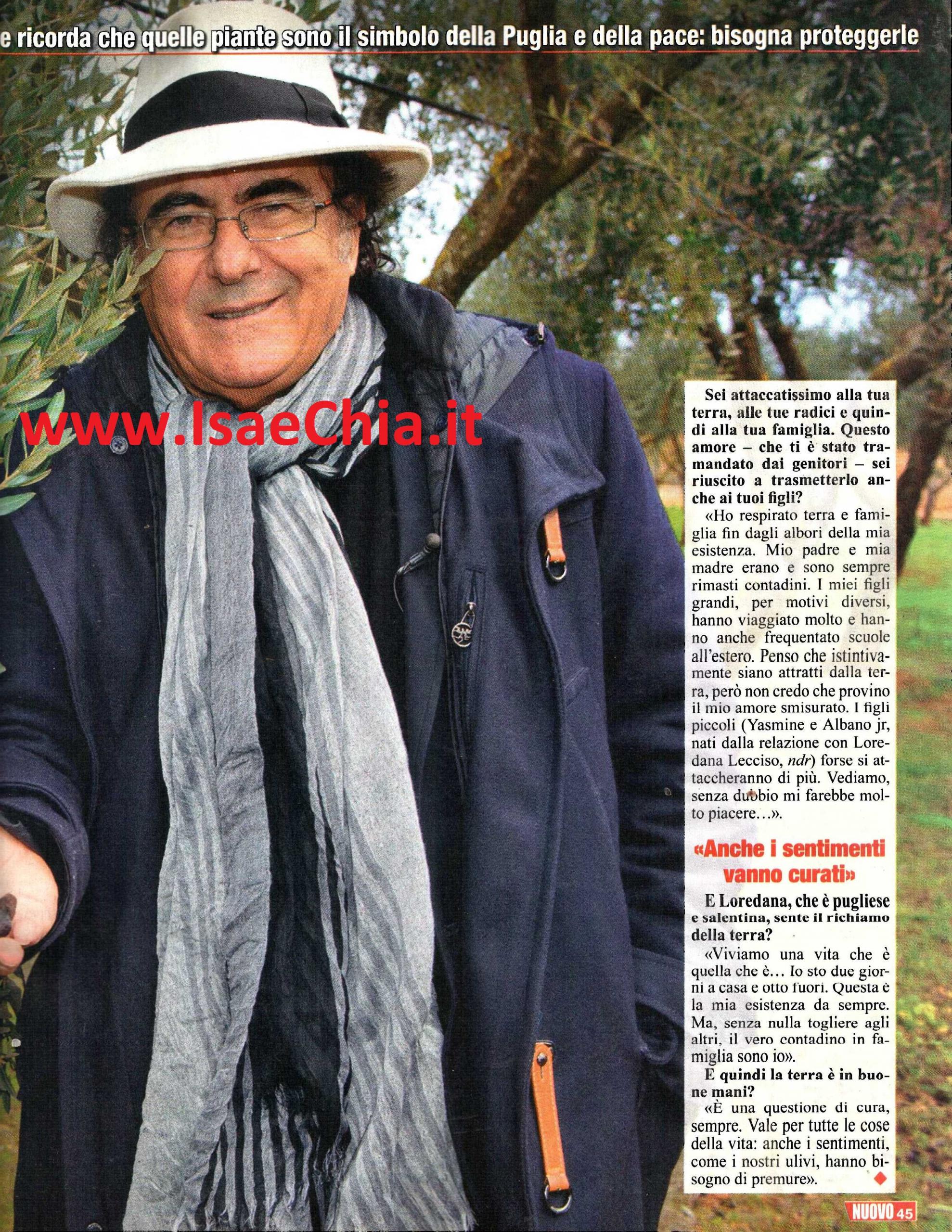 Il batterio Xylella fastidiosa sta devastando la Puglia da tre anni, distruggendo i famosi ulivi salentini. Secondo gli esperti del Ministero dell’Agricoltura, l’unica via è quella di abbattere 30.000 ulivi e tutte le piante nel raggio di 100 metri, anche se sane. Ma non tutti sono d’accordo con questa politica: “In natura uno mangia l’altro, io credo che la ricerca debba partire da questo concetto: chi potrebbe uccidere questo tremendo animale?” si chiede il cantante Al Bano, rappresentante della Puglia in tutto il mondo. “Uomini e scienziati devono scendere in campo per limitare i danni irreparabili di questo batterio. Non possiamo togliere gli ulivi dal Salento, sarebbe come togliere la Cappella Sistina al Vaticano! Per me molto deriva dall’incuria dei terreni e dall’abbandono in cui sono stati lasciati tanti poderi. Se non si rispetta e non si cura la terra, il batterio ha campo libero. Grazie a Dio, nella mia tenuta la cicala che trasporta il batterio non è mai arrivata. Però io i campi li curo, eccome, e nella mia tenuta ho una decina di alberi secolari. Farò tutto il possibile e tutto ciò che è in mio potere a favore di questo albero, un simbolo di pace dai tempi di Omero, un simbolo mondiale, non solo italiano o pugliese“. Anche stavolta, quindi, il cantante ed ex naufrago dell‘Isola dei famosi ha dimostrato l’attaccamento per la sua terra. Quando gli si chiede se è riuscito a tramandare questo suo amore anche ai suoi figli, risponde: “Ho respirato terra e famiglia fin dagli albori della mia esistenza. Mio padre e mia madre erano contadini,. I miei figli grandi hanno viaggiato molto e hanno anche frequentato le scuole all’estero. Penso che istintivamente siano attratti dalla terra, però non credo che provino il mio amore smisurato. I figli piccoli, Jasmine e Albano Jr, avuti da Loredana Lecciso, forse si attaccheranno di più e senza dubbio mi farebbe molto piacere. Io sto due giorni a casa e otto fuori, questa è la mia esistenza da sempre. Ma, senza nulla togliere agli altri, il vero contadino in famiglia sono io! E’ una questione di cura, sempre. Vale per tutte le cose della vita: anche i sentimenti, come gli ulivi, hanno bisogno di premure“.