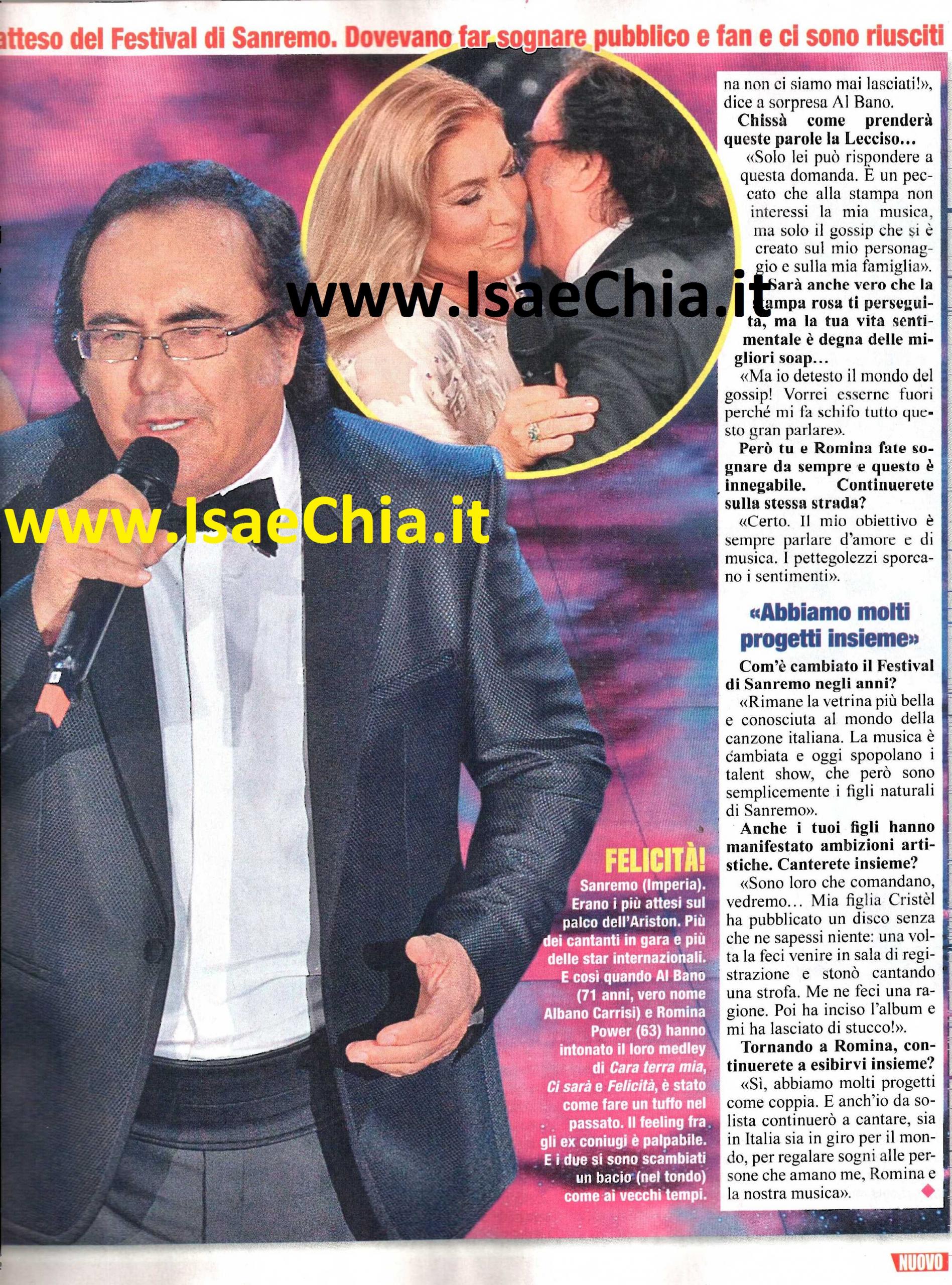 Il teatro dell’Ariston è stato il luogo del ritrovamento per Al Bano e Romina Power, che dopo alcuni concerti all’estero che hanno segnato la loro re-union, sono tornati insieme per la prima volta per il pubblico italiano in occasione del 65° Festival di Sanremo. Quando è stato richiesto loro un bacio, come ai vecchi tempi, i due si sono trovati in imbarazzo e il cantante pugliese ha subito ironizzato: “Ho un senso di pudore eccezionale. E poi, ogni volta che le davo un bacio, nasceva un figlio!“, ma alla fine si sono scambiati un timido bacio. “E’ unico, più diventa grande, più gli aumenta la voce” ha detto lei dell’ex marito. Adesso, intervistato, l’ex naufrago ha commentato: “Ma perché si parla sempre di ritorno? Io e Romina non ci siamo mai lasciati“. E a queste parole sorge spontanea la domanda ‘Come prenderà queste dichiarazioni Loredana Lecciso?’, alla quale lui risponde: “Solo lei può rispondere a questa domanda. E’ un peccato che alla stampa non interessi la mia musica, ma solo il gossip che si è creato sul mio personaggio e sulla mia famiglia. Io detesto il mondo del gossip, vorrei esserne fuori perché mi fa schifo questo gran parlare. L’obiettivo mio e di Romina è continuare a parlare d’amore e di musica. I pettegolezzi sporcano i sentimenti. Abbiamo molti progetti come coppia e anche da solista continuerò a cantare, sia in Italia che per il mondo, per regalare sogni alle persone che amano, me, Romina e la nostra musica“. Infine conclude parlando di come è cambiato Sanremo: “Rimane la vetrina più bella e conosciuta per la musica italiana. Oggi spopolano i talent show, che però sono semplicemente i figli naturali di Sanremo!“.