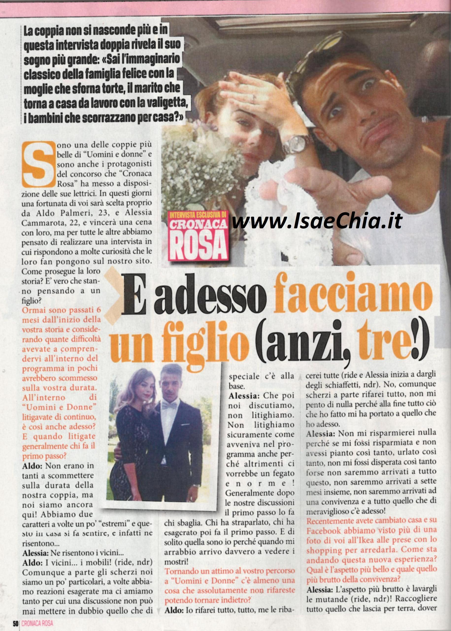 La nostra Isabella Benanti, per noi semplicemente Isa, ha intervistato Aldo Palmeri e Alessia Cammarota per il mensile Cronaca rosa, che ha lanciato un contest per i fan che desiderano vincere una cena con la coppia. Ma qual è il loro bilancio a sei mesi dalla scelta a Uomini e donne? “Non erano in tanti a scommetterci, ma siamo ancora qui. Abbiamo due caratteri un po’ estremi e questo si fa sentire. Ne risentono i nostri mobili e i nostri vicini! A volte abbiamo reazioni particolari, un po’ esagerate, ma ci amiamo tanto e per una discussione non si può mettere in dubbio ciò che di speciale c’è alla base. Noi discutiamo, non litighiamo come nel programma, altrimenti ci vorrebbe un fegato enorme! Generalmente nelle nostre discussioni, il primo passo lo fa chi ha straparlato”. Quando gli si chiede cosa farebbero se potessero tornare indietro, l’ex tronista risponde: “Io rifarei tutto, me le ribacerei tutte (e lei gli dà degli schiaffetti). Non mi pento di nulla perché mi ha portato a quello che ho adesso”. E lo stesso dice l’ex corteggiatrice: “Non mi risparmierei nulla, perché se non avessi urlato e pianto così tanto, forse non saremmo arrivati a tutto questo e non saremmo arrivati a una convivenza”. E a proposito, Alessia confessa: “Mi sento una casalinga disperata: cucinare, lavare, stirare, raccogliere la roba che lascia in giro…Ma il lato positivo è dormire con il mio fidanzato accanto”. Aldo conferma: “Sì, è bellissimo dormire insieme. Per me lati negativi non ce ne sono, se non che non posso andare via quando litighiamo, perché devo tornare a casa e affrontare il problema! Quando siamo lontani, ad esempio quando torno in Sicilia dai miei, non facciamo che scriverci e quando arrivo le scrivo ‘Già mi manchi’.” dice lui.