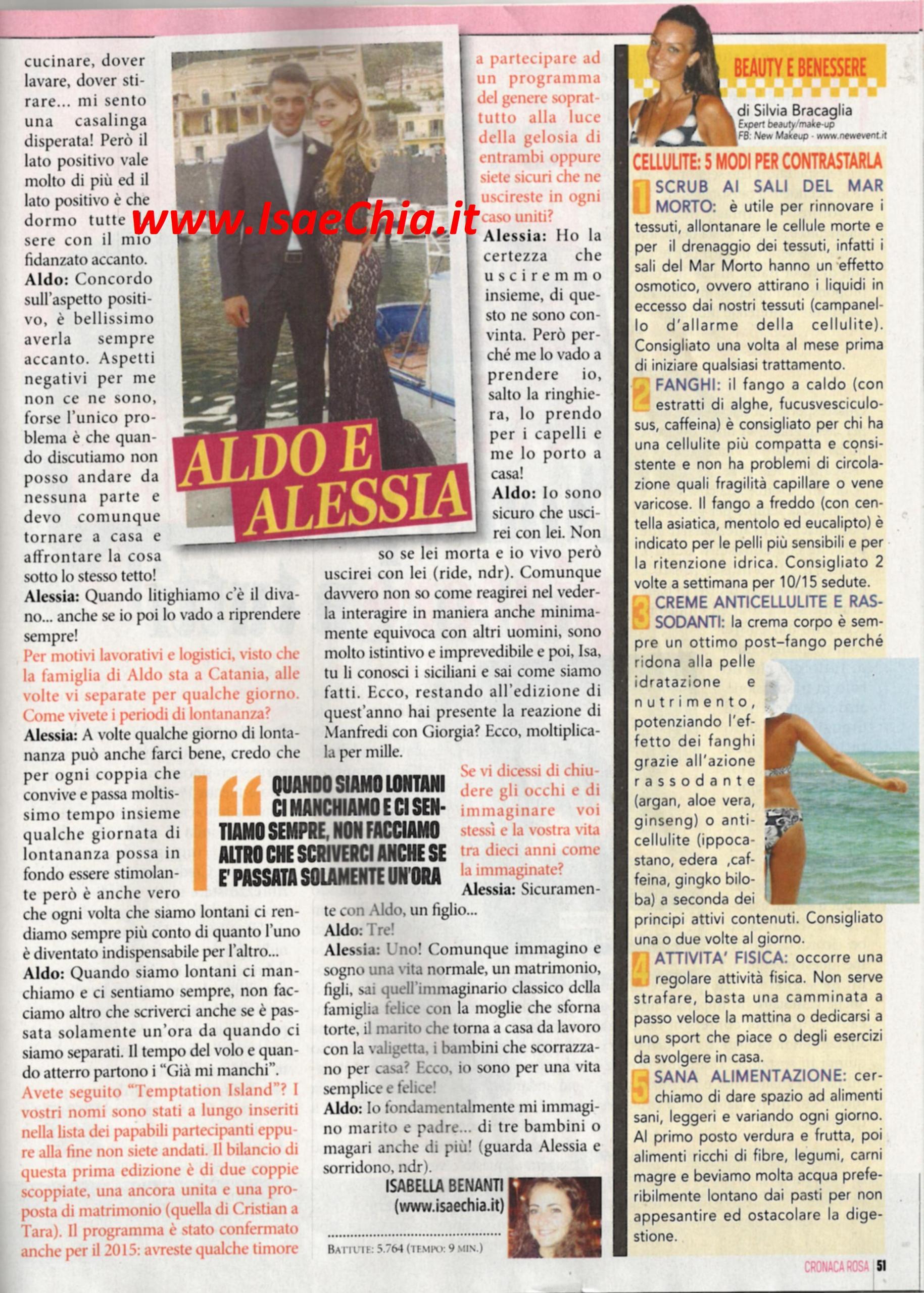Il programma Temptation Island, che ha visto tra i protagonisti anche altre coppie uscite da Uomini e donne, è stato confermato anche per l’anno prossimo. Quando si chiede loro se hanno timore di partecipare o sarebbero sicuri di uscire insieme, Alessia risponde: “Ho la certezza che usciremmo insieme, però perché me lo vado a riprendere io, salto la ringhiera e lo prendo per i capelli!”, mentre Aldo dice: “Non so se lei morta e io vivo, ma uscirei con lei. Non so come reagirei a vederla interagire in modo anche un po’ equivoco con altri uomini, sono istintivo e imprevedibile, si sa come siamo noi siciliani. Avete presente la reazione di Manfredi Ferlicchia con Giorgia Lucini? Ecco, moltiplicata per mille!”. Infine, quando Isa chiede come si immaginano tra dieci anni, lei risponde: “Sicuramente con Aldo, un figlio…” e lui interviene: “Tre!”. “La famiglia felice in cui lei sforna torte, il marito torna a casa con la valigetta e i bambini scorrazzano per casa”. “Padre di tre bambini, o magari anche di più!” conclude Aldo.