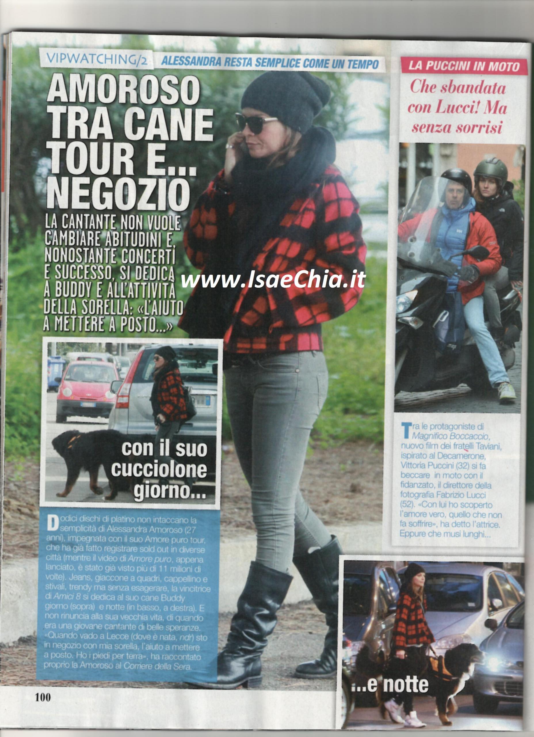 Dodici dischi di platino non intaccano la semplicità di Alessandra Amoroso, al momento impegnata col suo Amore puro Tour, che ha già registrato il sold-out in diverse città. Eccola, infatti, con jeans, giaccone a quadri, cappellino e stivali, trendy ma senza esagerare, in giro con il suo cagnolone Buddy, che fa una passeggiata. “Quando vado nella mia città natale, Lecce, sto in negozio con mia sorella e l’aiuto a mettere a posto” ha dichiarato lei, dimostrando di avere sempre i piedi per terra.