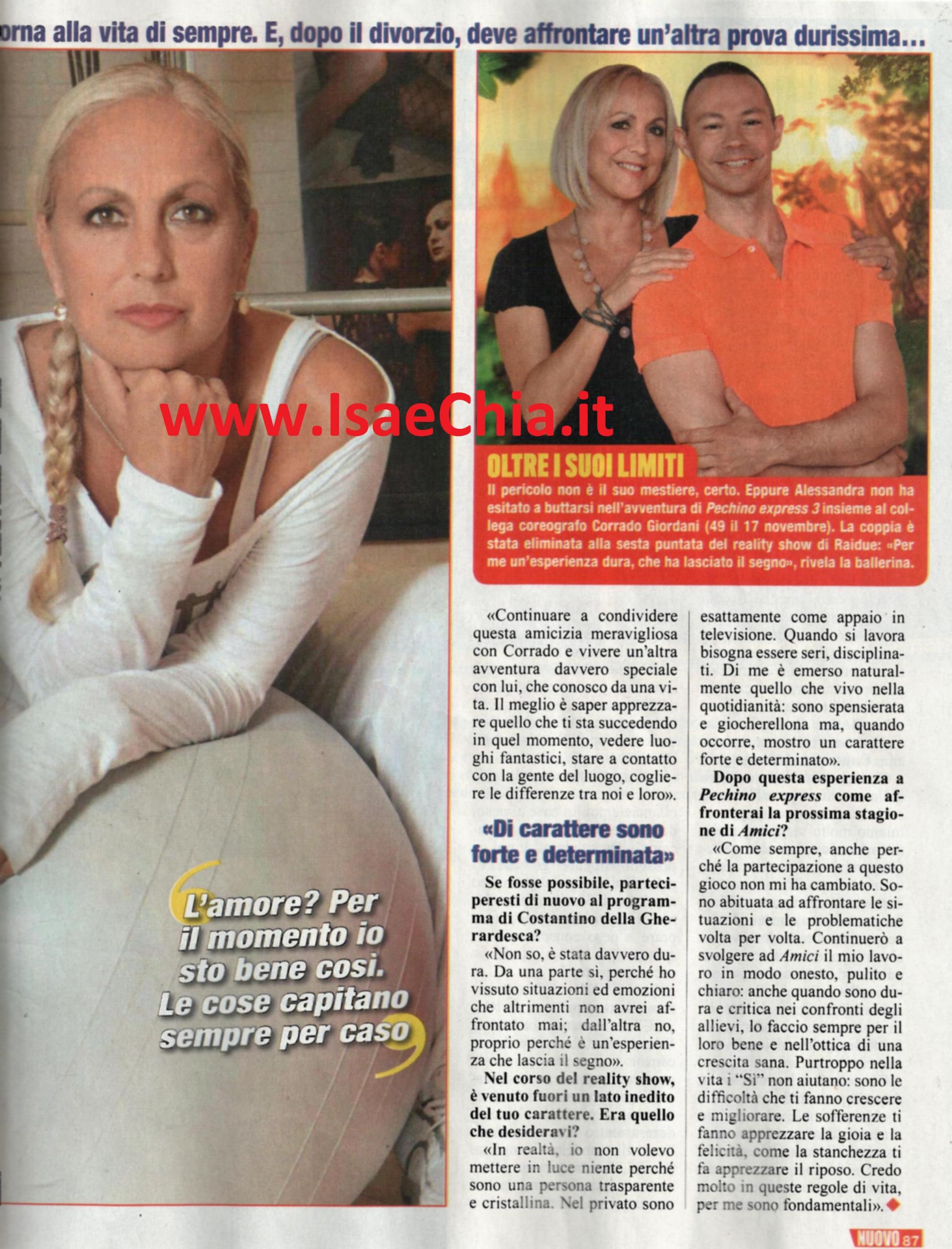 La storica insegnante di danza di Amici Alessandra Celentano ha stupito il pubblico mettendosi in gioco in un adventure game come Pechino Express, in cui era in coppia con l’amico coreografo Corrado Giordani. Ma nella vita privata, Alessandra non sta vivendo un periodo facile: dopo il divorzio dal marito Angelo Trementozzi, infatti, rivela: “Mia madre è malata di Alzheimer, quindi mi dedico molto a lei. Non ne parlo volentieri perché so che le darebbe fastidio. Gran parte del mio tempo libero è per la famiglia, anche perché con il lavoro ho ritmi davvero serrati e preferisco dedicarmi ai miei cari e ai miei quattro cani. L’amore? Ora sto bene così. E poi le cose accadono. Non sono mai andata alla ricerca di qualcosa in particolare, ma ho sempre vissuto, e sto vivendo, ciò che mi è capitato per caso”. Quando le si fa notare che ora che lei è single, le sue cugine Rosita e Rosalinda, figlie del cantante Adriano Celentano, sono fidanzate (mentre prima era il contrario), nota: “Loro sono come sorelle per me, ci confidiamo tutto e ridiamo delle cose. Cerchiamo sempre di cogliere il bello delle situazioni e nei momenti più tragici facciamo sempre una battuta”. Similmente, parlando di Pechino Express, ha dichiarato: “L’importante non è vincere, ma saper cogliere il meglio. Il meglio per me è stato continuare a condividere questa amicizia con Corrado e condividere con lui anche quest’esperienza davvero speciale con lui, che conosco da una vita. Il meglio è apprezzare ciò che ti sta succedendo in quel momento, vedere luoghi fantastici, stare a contatto con la gente del posto, viverne la differenza con noi. E’ stata davvero dura, ma da una parte lo rifarei: ho vissuto situazioni ed emozioni che altrimenti non avrei affrontato mai. Nel privato sono esattamente come appaio in televisione; quando si lavora si deve essere seri, disciplinati, qui è emerso quello che sono nella quotidianità: sono spensierata e giocherellona, ma quando è necessario, forte e determinata. Affronterò la prossima stagione di Amici come sempre, continuerò a svolgere il mio lavoro in modo onesto, pulito e chiaro: quando sono critica nei confronti degli allievi, lo faccio per il loro bene. Nella vita i “sì” non aiutano, sono le difficoltà che fanno crescere e migliorare. Le sofferenze ti fanno apprezzare le felicità, così come la stanchezza ti fa apprezzare il riposo”.