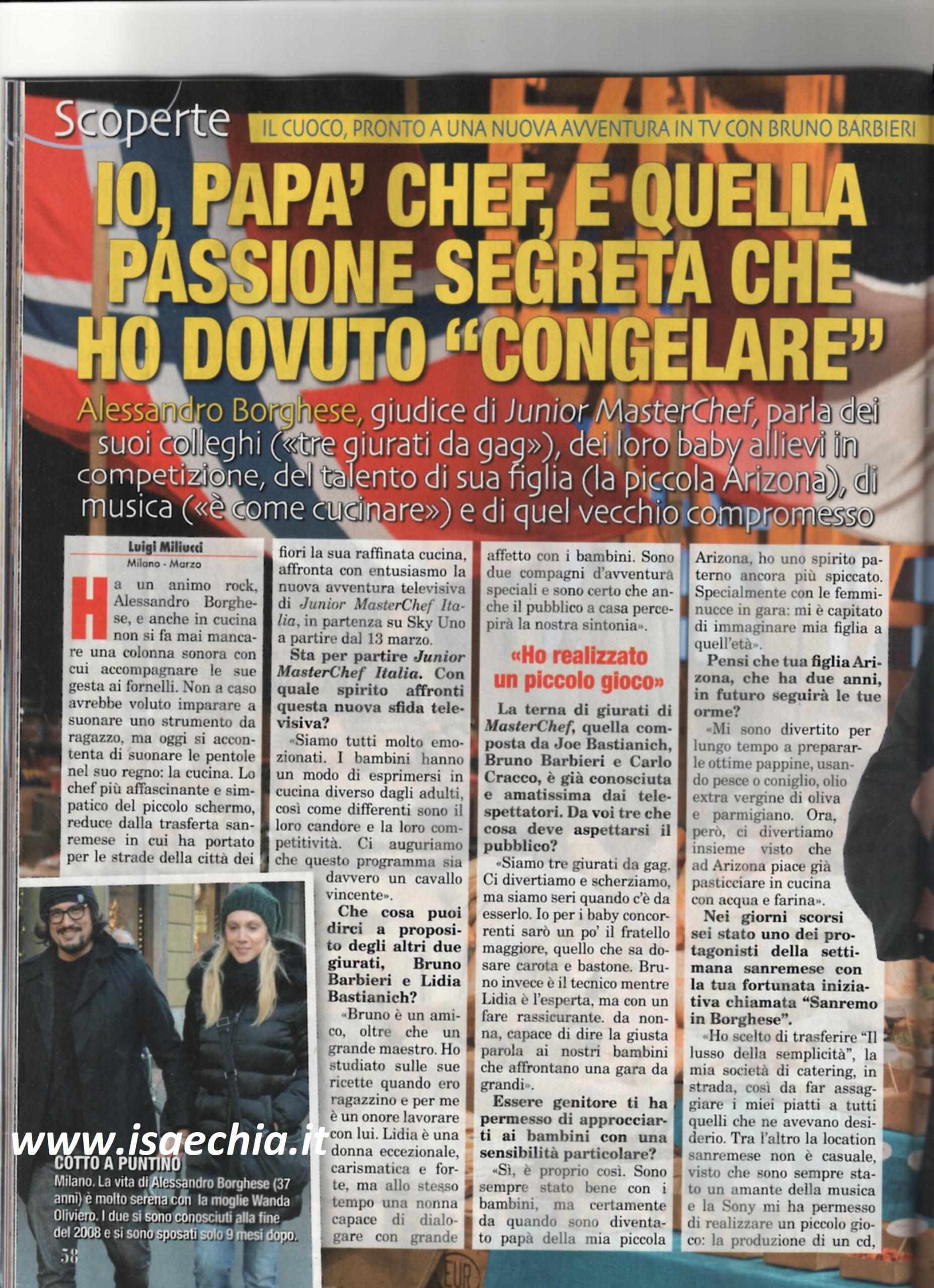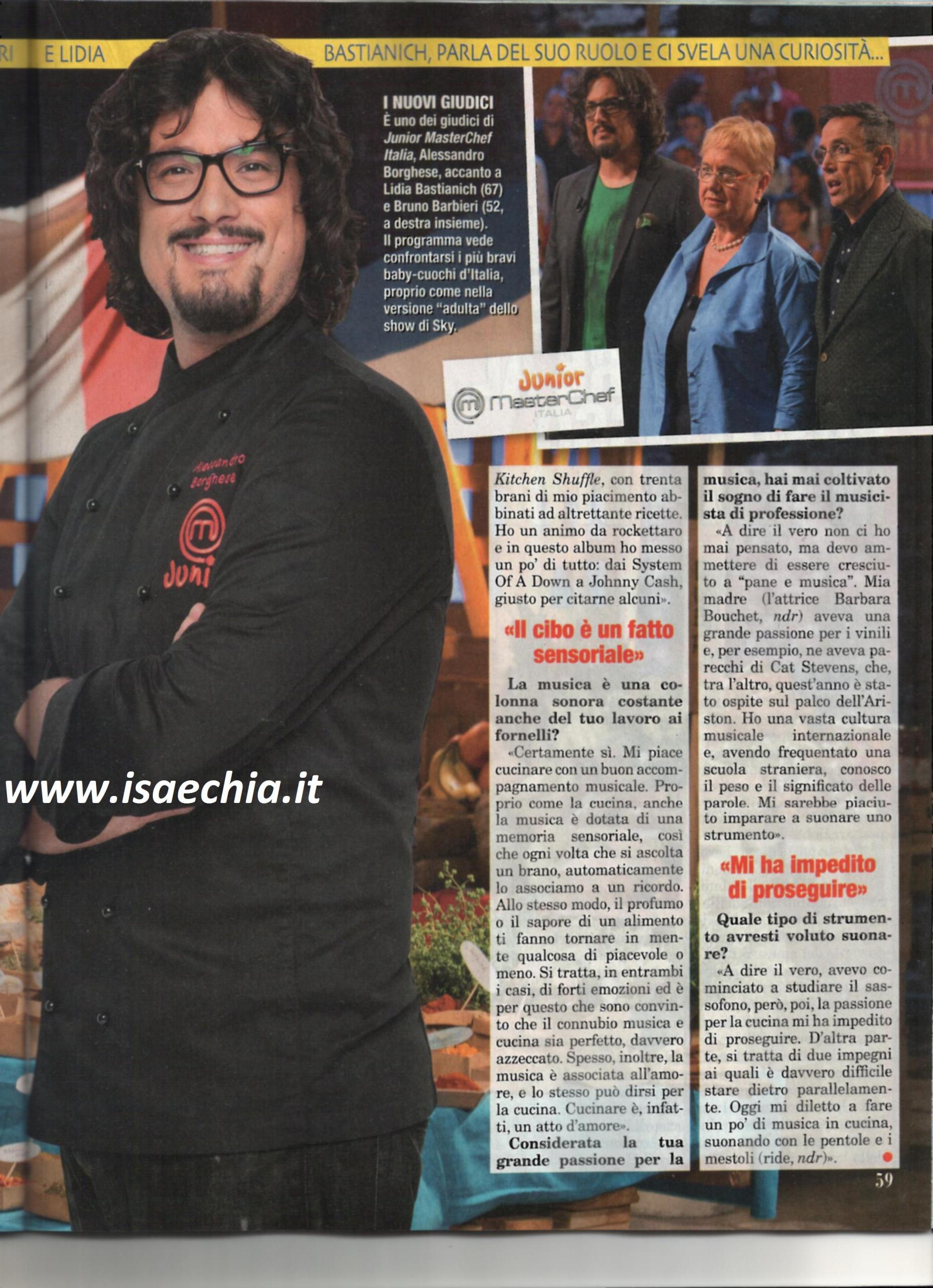 Lo chef Alessandro Borghese è pronto per partire il prossimo 13 marzo con Junior MasterChef Italia: “Siamo tutti molto emozionati. I bambini hanno un modo di esprimersi in cucina diverso da quello degli adulti, così come sono diversi il candore e la competitività. Gli altri due giurati sono Bruno Barbieri e Lidia Bastianich. Il primo è un maestro: ho studiato sulle sue ricette e per me è un onore. La seconda è eccezionale e carismatica, una nonna capace di dialogare con grande affetto coi bambini. Siamo tre giurati da gag, ci divertiamo e scherziamo, ma siamo seri quando ce n’è bisogno”. Quando gli si chiede se il fatto di essere genitore lo ha aiutato nell’approccio con i bambini, ha risposto: “Sono sempre stato bene con i bambini, ma da quando sono diventato papà della mia piccola Arizona, ho uno spirito paterno ancora più spiccato, soprattutto con le femminucce in gara: mi è capitato di immaginare mia figlia a quell’età. Mi sono divertito a prepararle pappine, mentre ora ci divertiamo insieme, perché le piace pasticciare acqua e farina”. Infine, parla del suo rapporto con la musica: “Con la mia iniziativa Sanremo in Borghese, ho trasferito la mia società di catering in strada e la location sanremese non è casuale: sono sempre stato amante della musica. La Sony mi ha permesso di produrre un cd con 30 brani associati ad altrettante ricette. Sono cresciuto a “pane e musica”: mia madre, Barbara Bouchet, amava i vinili e ne aveva molti di Cat Stevens, che è stato proprio ospite al Festival. Avevo cominciato a suonare il sassofono, ma poi la passione per la cucina mi ha impedito di continuare: sono due impegni a cui è difficile stare dietro parallelamente”.