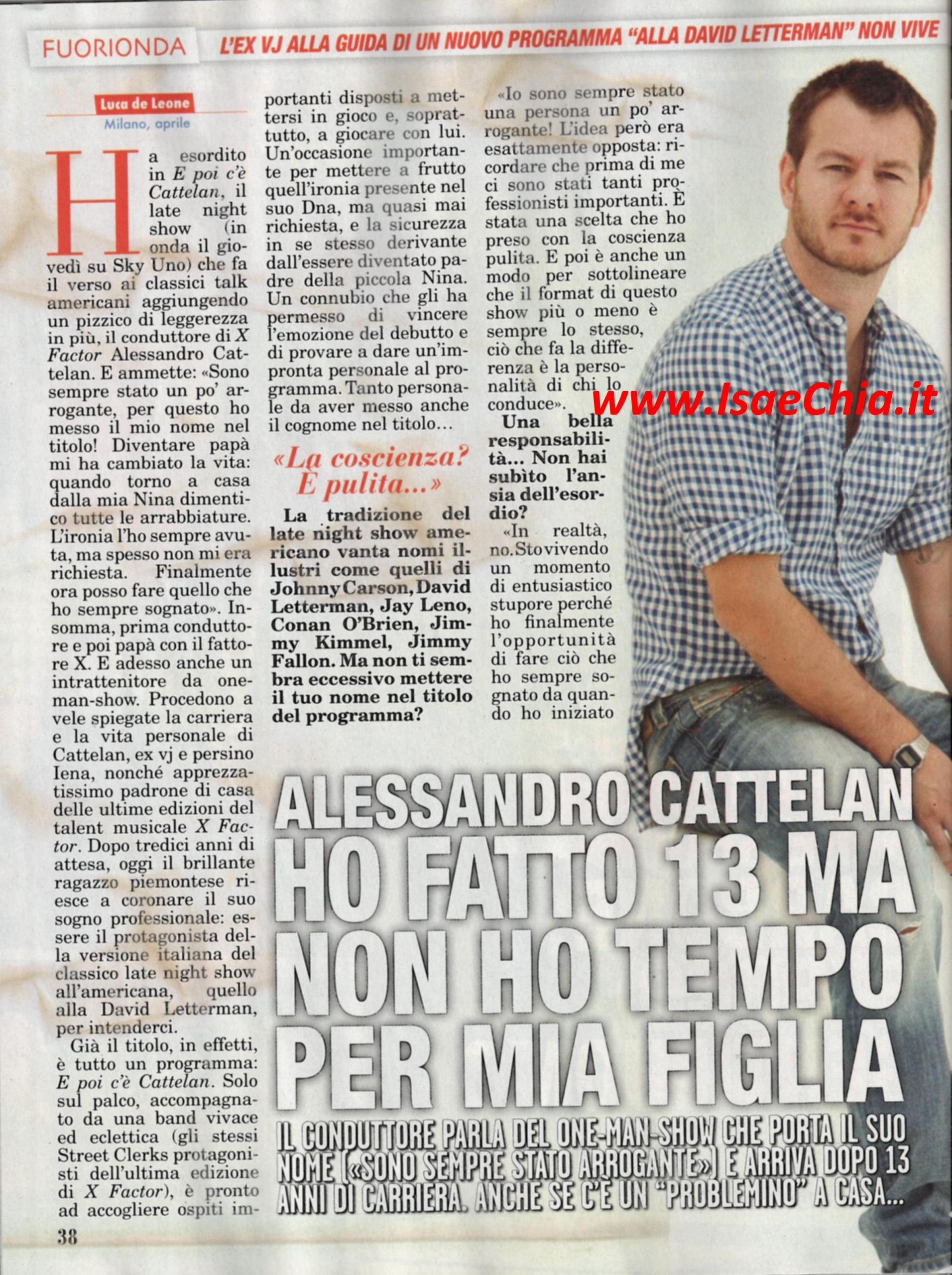 Il conduttore di X Factor Alessandro Cattelan ha esordito su Sky Uno con E poi c’è Cattelan, un talk-show tutto suo: “Sono sempre stato un po’ arrogante, per questo ho messo il mio nome nel titolo! Ho fatto come i grandi nomi della tradizione americana, sottolineando che il format è sempre lo stesso, ma ciò che fa la differenza è la personalità di chi lo conduce. L’ironia l’ho sempre avuta, ma spesso non mi era richiesta. Ora posso fare quello che ho sempre sognato! Sto vivendo un momento di entusiastico stupore perché di fare quello che volevo fare da quando ho esordito, 13 anni fa. E’ un tipo di programma che guardo e studio da anni: ci fosse un quiz, vincerei di sicuro su questo argomento. Lavorare in un talent così importante come X Factor mi ha fatto crescere e fare esperienza. Mi ha consentito di conquistarmi la fiducia dei produttori del programma, del pubblico e degli ospiti”. Quando gli si chiede se è maturato anche grazie alla paternità, spiega: “In questo momento, in realtà, mi sta creando qualche problema in più, perché essendo a lungo impegnato con le prove, non ho tempo per stare con mia figlia Nina. Poi, però, quando torno a casa, sono felice, anche dopo una giornata in cui mi sono arrabbiato tantissimo”. Infine, parlando dei suoi ospiti, spiega: “Sono cristallino e spiego loro che non cerco di estorcere loro la frase che il giorno dopo sarà sui giornali. Voglio metterli a loro agio e far sì che possano giocare con me, dando vita a spassose performance. Mi sono divertito molto a giocare ai mimi con Ambra Angiolini e con Edoardo Leo, ma anche a sfidare ai rigori un idolo come Javier Zanetti“.