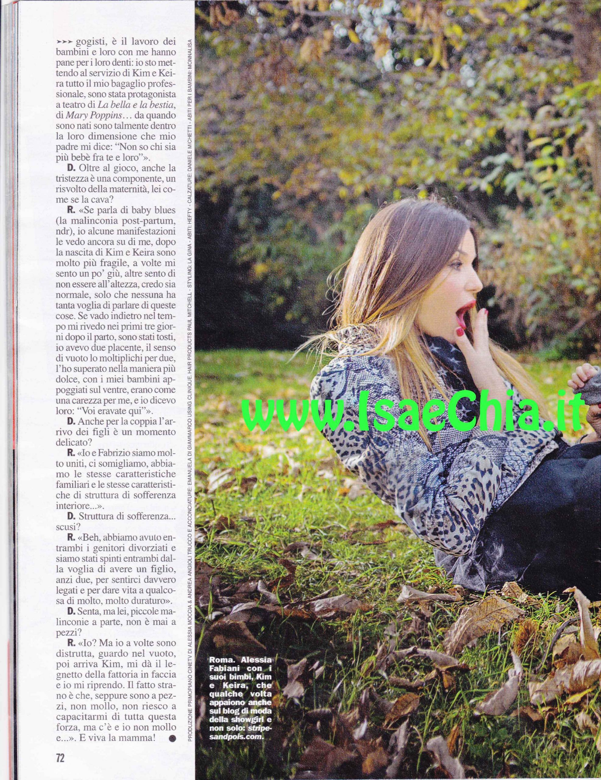 E’ passato da molto tempo da quando la showgirl Alessia Fabiani sedeva tra i primissimi “troni” di Uomini e donne. Adesso, infatti, è mamma a tempo pieno di due gemelli: “Quando mi hanno detto che erano due gemelli, mi è preso un colpo! Il mio compagno Fabrizio Cherubini, invece, era felicissimo. Oggi, ci guardiamo negli occhi e ci diciamo: “Perché proprio a noi?” scherza lei. “Da quando ci sono Keira e Kim mi commuovo per un nonnulla. Adesso è vita. Tutto quello che c’è stato prima è come se non mi appartenesse veramente. Diciamo che ho vissuto una vita da adolescente e in un attimo sono diventata la donna con la vita che ho sempre sognato. Ho lavorato tanto, in tv, con pubblicità e nella moda, e ho voluto prolungare quel periodo spensierato, quella sorta di “bolla”. Poi non so, c’è stata una scintilla, qualcosa che mi ha fatto desiderare un bambino. Il primo, purtroppo, l’ho perso un anno prima di Kim e Keira, con un aborto spontaneo. E il Signore mi ha restituito quel bambino mai nato con gli interessi!”. Quando le si chiede se pensa al terzo figlio, risponde: “In questo momento mi sembrerebbe pazzesco, anche se scopro la predisposizione per l’essere mamma ogni giorno di più. Dopo la nascita dei piccoli, mi sento più fragile, a volte un po’ giù, credo di non essere all’altezza, ma credo sia normale. Io e Fabrizio siamo molto uniti, abbiamo le stesse caratteristiche di struttura e sofferenza interiore: abbiamo avuto entrambi genitori divorziati e siamo stati spinti dalla voglia di avere un figlio per dare vita a qualcosa di molto duraturo. Io a volte sono a pezzi, ma poi arriva Kim, mi dà il legnetto della fattoria in faccia e mi riprendo. Non mollo e non riesco a capacitarmi di tutta questa forza!”