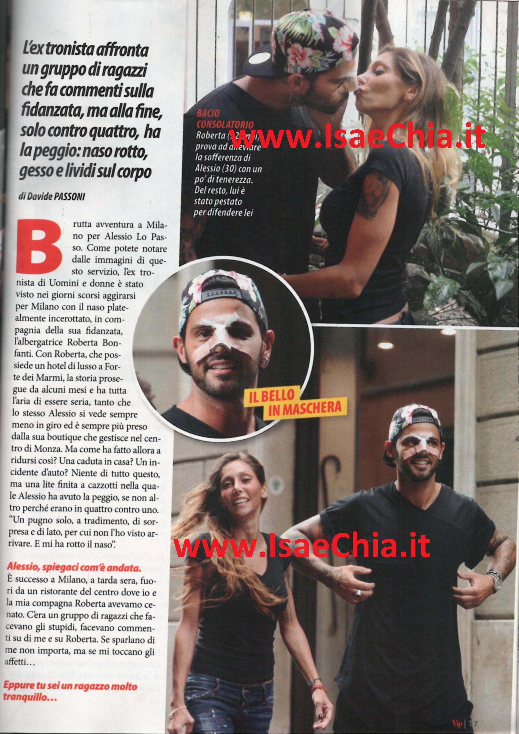 Brutta avventura per l’ex tronista Alessio Lo Passo, che, come si può vedere da queste foto, ha il naso incerottato: “Un pugno solo, di sorpresa e dal lato, per cui non l’ho visto, mi ha colpito e mi ha rotto il naso” spiega lui. “E’ successo a Milano, fuori da un ristorante dove io e la mia compagna Roberta Bonfanti avevamo cenato. C’era un gruppo di ragazzi che facevano gli stupidi, con commenti su me e Roberta. Se sparlano di me non mi importa, ma se mi toccano gli affetti…Ho affrontato a muso duro uno di loro, quello che faceva più il cretino. Poi sono arrivati gli altri, non dei ragazzini, ma uomini come me, sui 30-32 anni. Mi è arrivato questo pugno da lato, da codardi: non l’ho nemmeno visto partire. Dritto su naso e zigomo: il naso si è rotto, lo zigomo ci è mancato poco. Appena hanno visto del sangue, come conigli sono scappati tutti. Io dovevo farmi medicare, ma non c’era nessuno, nessun testimone. Infatti non ho nemmeno sporto denuncia, sarebbe stata contro ignoti; ho preferito farmi medicare al pronto soccorso. Un mese di prognosi, una specie di tutore di gesso e cerotti. Attendiamo che si riassorbano i lividi. Purtroppo ho dovuto trascurare il mio negozio che ho aperto a Monza. Ora sono da solo a gestirlo e l’ho chiuso per un po’ perché non potevo presentarmi ai clienti in quelle condizioni. Poi la gente chiede, è curiosa, e non puoi far finta di niente. Infatti non mi sono fatto pubblicità: non ho pubblicato niente sui miei profili social per non alimentare il gossip: non mi sembrava il caso”.