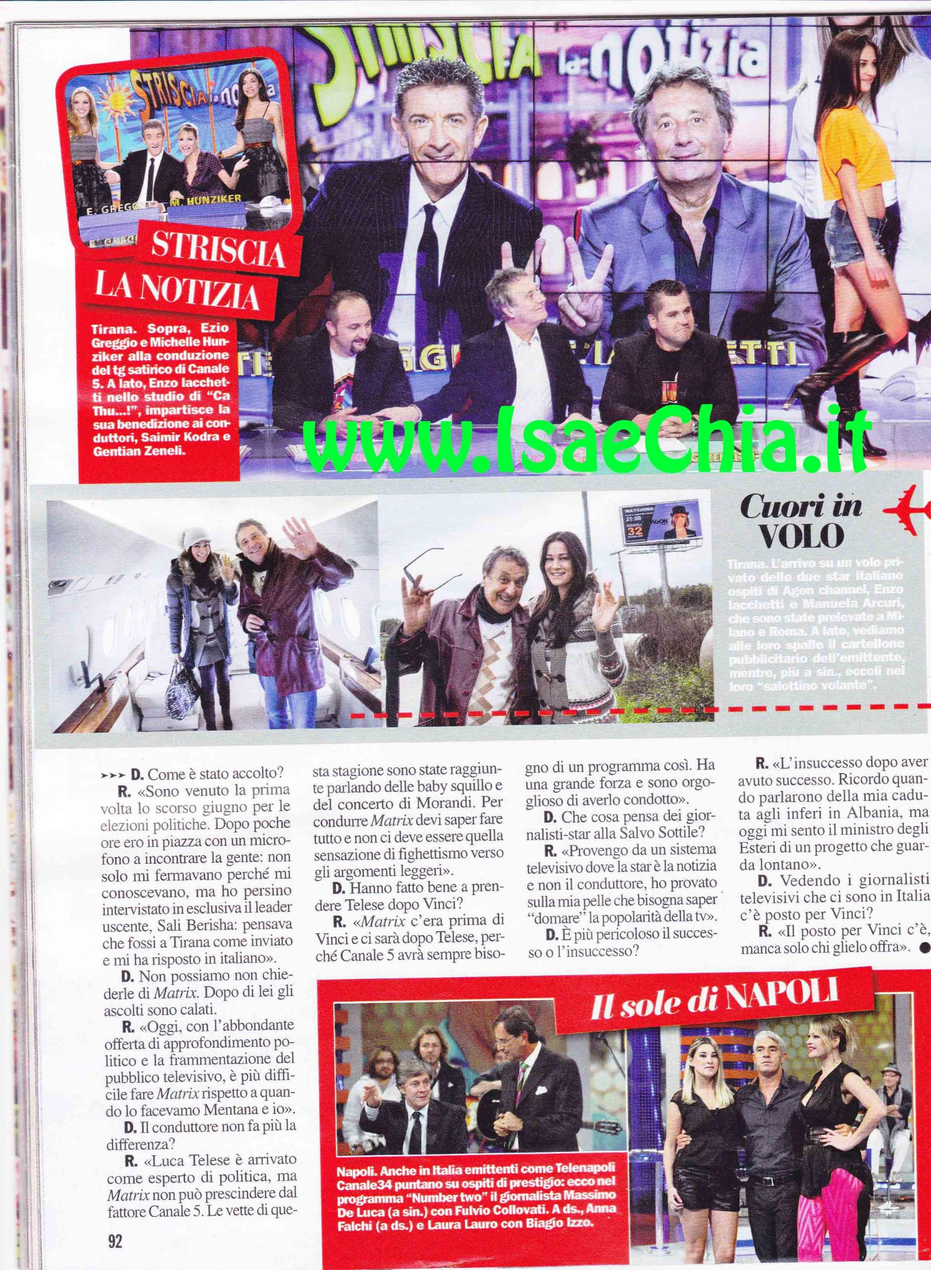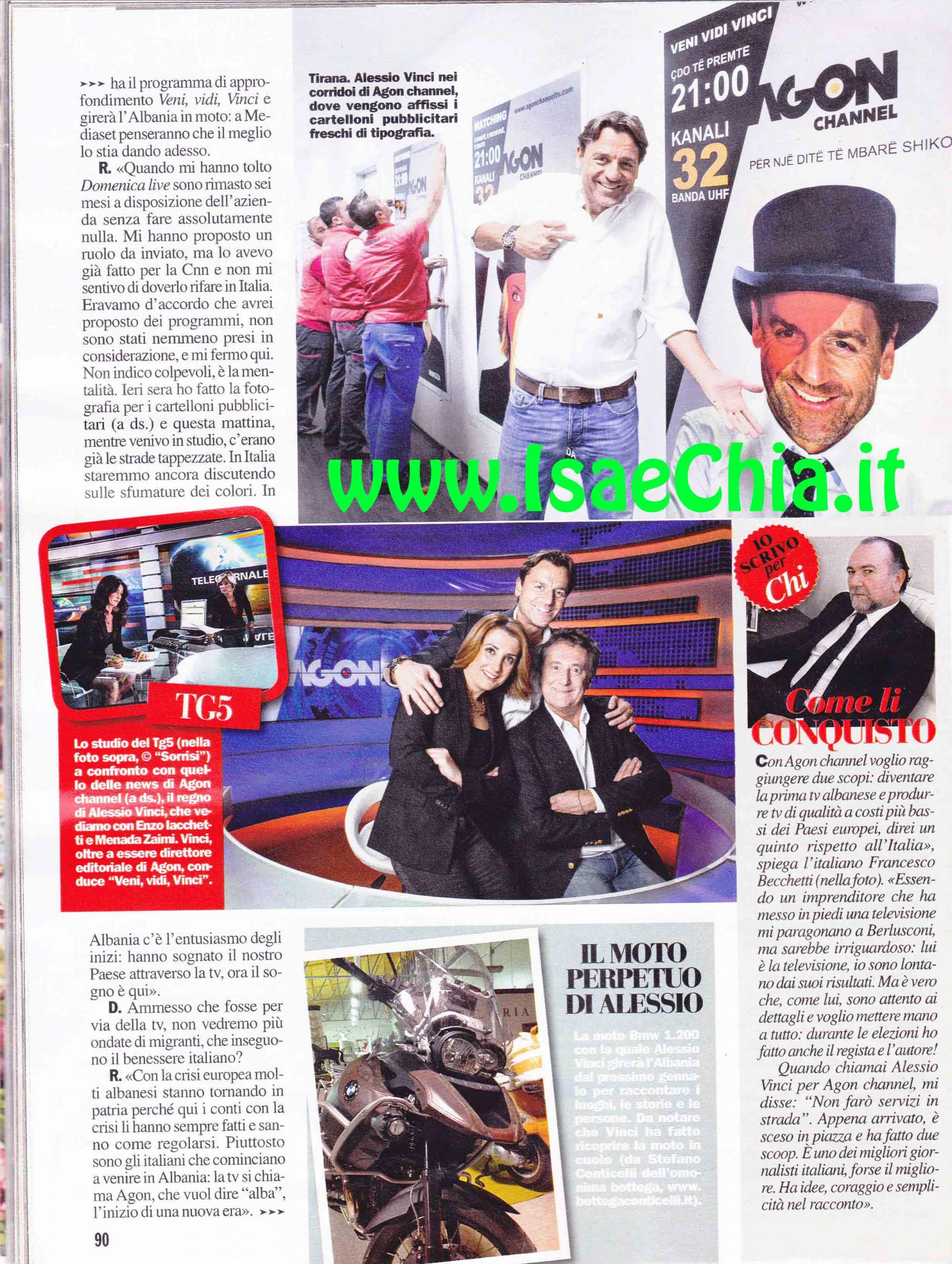 Per tanti anni in Albania hanno guardato la nostra tv. Poi è arrivato un imprenditore e ha detto “Perché non possono avere una tv come la nostra tv italiana ma con i loro volti e la loro lingua?”. Ecco che è nata Agon Channel, di cui l’ex conduttore di Matrix Alessio Vinci è diventato direttore. C’è Ezio Greggio alla conduzione di Striscia e Manuela Arcuri che si fa intervistare dal Fabio Fazio albanese. “Manca solo Barbara D’Urso: quella originale è talmente brava che se parlasse anche la lingua sarebbe peretta. Lo ha dimostrato venendo qui a esplorare il lato umano dei candidati alle elezioni” commenta Vinci. “Ci sono 150 persone che lavorano 12 ore al giorno per portare gli stessi standard qualitativi italiani. Quando Mediaset mi ha tolto Domenica Live sono rimasto sei mesi a disposizione senza fare nulla. Avevo proposto dei programmi ma non sono stati nemmeno presi in considerazione. Ora avrò il programma Veni, vidi, Vinci e girerò l’Albania in moto. Con la crisi europea molti albanesi stanno tornando in Patria, perché sanno farsi i conti. Piuttosto sono gli italiani a venire in Albania: la mia tv si chiama Agon, che significa “alba”, l’inizio di nuova era. Mi hanno accolto bene qui: ho intervistato il leader politico uscente in occasione delle elezioni e mi ha risposto in italiano. Fare Matrix ora in Italia è più difficile di quando lo facevamo io o Enrico Mentana, ma è un programma di cui Canale 5 avrà sempre bisogno e sono orgoglioso di averlo fatto”. Infine, quando gli si chiede se, guardando ai giornalisti in Italia, c’è ancora posto per lui, risponde: “Il posto per Vinci c’è, manca solo chi glielo offra!”