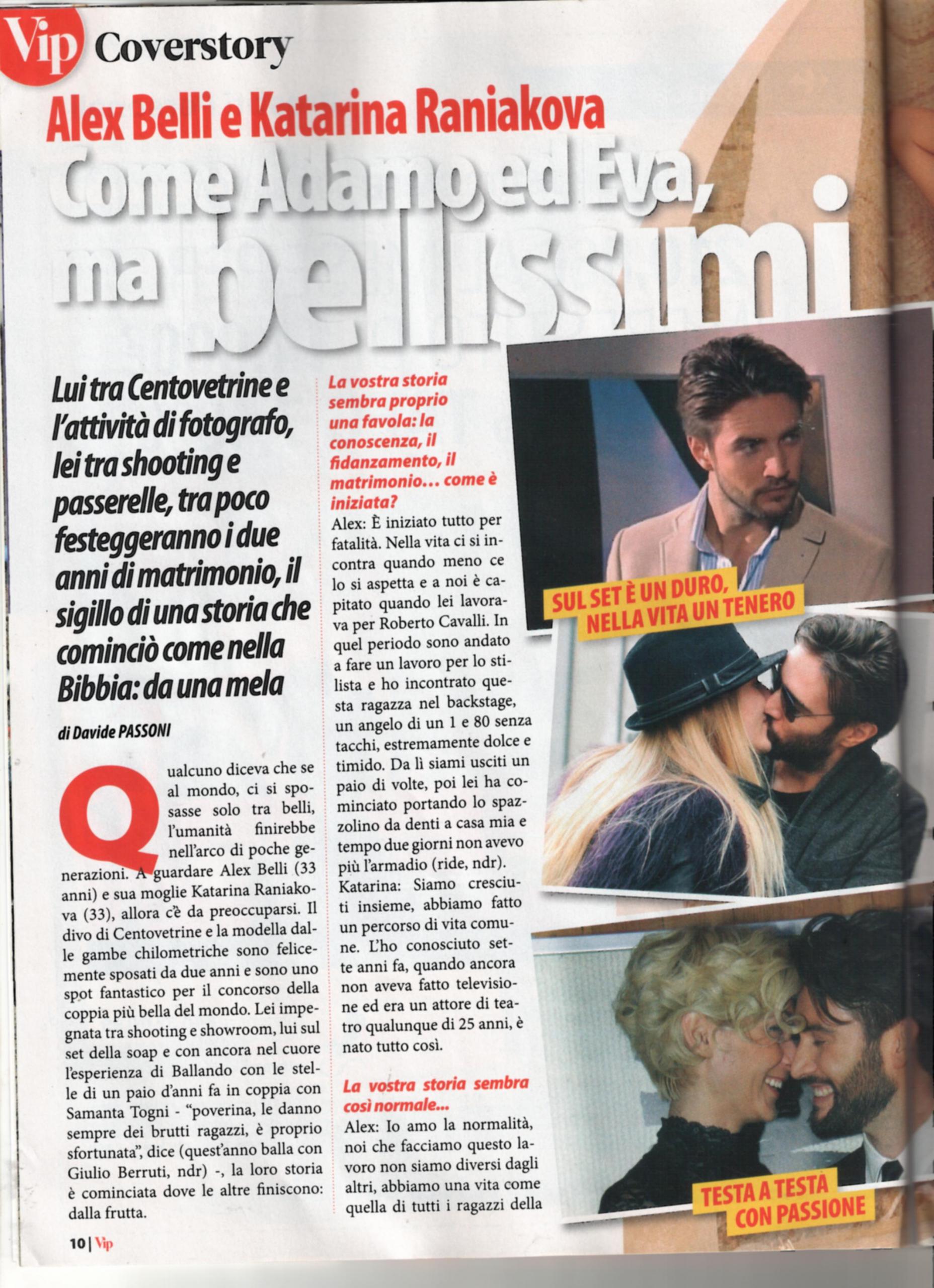 Il bellissimo attore di Centovetrine Alex Belli, che due anni fa era tra i concorrenti di Ballando con le stelle, vive una storia da favola con sua moglie, la modella di origine slovacca Katarina Raniakova. “E’ iniziato tutto per casualità; lei lavorava per Roberto Cavalli e la incontrai nel backstage. Un angelo di un metro e 80 senza tacchi, estremamente dolce e timido. Non sapevo come farle avere il mio numero, così ho deciso di farlo in modo originale. A tutte le ragazze arrivava della frutta, così le feci arrivare metà mela con su la prima parte del mio numero e l’invito a venire prendere il resto del numero nel mio camerino. Dopo mezz’ora me la ritrovo lì. Nel nostro caso abbiamo fatto il contrario: non è stata Eva ad attirare Adamo con la mela, ma il contrario! Da lì siamo usciti un paio di volte, finché lei non ha portato lo spazzolino a casa mia e poi tempo due giorni e non avevo più l’armadio!” dice lui. “L’ho conosciuto sette anni fa, siamo cresciuti insieme: lui era ancora un attore di teatro di 25 anni. Il primo giorno a casa sua gli ho conosciuto il risotto alla milanese con l’ossobuco. Io sono più italiana di tante altre!”. Insomma, una coppia normalissima…: “Io amo la normalità. Anche se facciamo questo lavoro, facciamo tutte le cose dei ragazzi della nostra età”. Dopo aver svelato il loro segreto per far durare una storia (“Mai essere scontati, sorprendersi sempre e avere un progetto condiviso”), parlano di progetti futuri: “Vedo benissimo dei figli con lei. Nella mia famiglia eravamo in quattro fratelli! Ma ora siamo impegnatissimi e non abbiamo ancora avuto l’occasione, ma sicuramente è tra i nostri obiettivi. Anche perché vorrei mandare avanti la specie” scherza l’attore. “Mia madre ha inseguito la femminuccia per anni, mentre per me maschietto o femminuccia non conta, purché sia sano. Di sicuro tifiamo perché siano tanti!”. Quando gli si chiede se sta seguendo anche quest’edizione di Ballando, risponde: “Per me è stata un’esperienza stupenda. La prima volta che la incontrai, dissi a Milly Carlucci che ero un palo, ma lei disse ‘Perfetto, stiamo cercando proprio questo’. Lì non impari a ballare, ma dei passi basi e delle coreografie e ho faticato come una bestia. E poi è tutto in diretta, che per chi ha lavorato per il teatro significa adrenalina per il contatto col pubblico”. Katarina rivela: “Io facevo la criticona, gli dicevo dove sbagliava e come mai non fosse riuscito a fare alcuni passi. Ma è proprio quello il bello, vedere uno che non ha mai ballato migliorare di puntata in puntata.