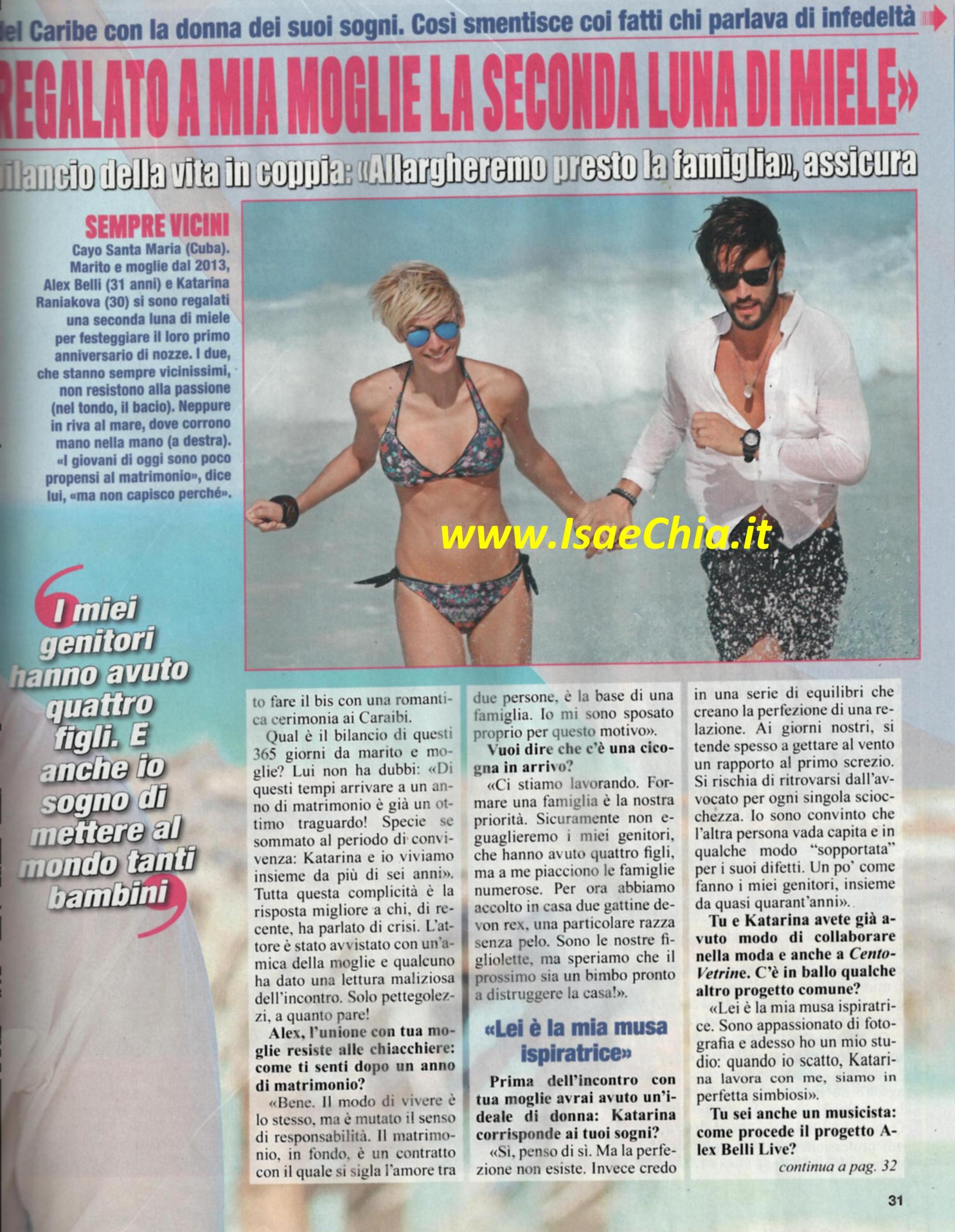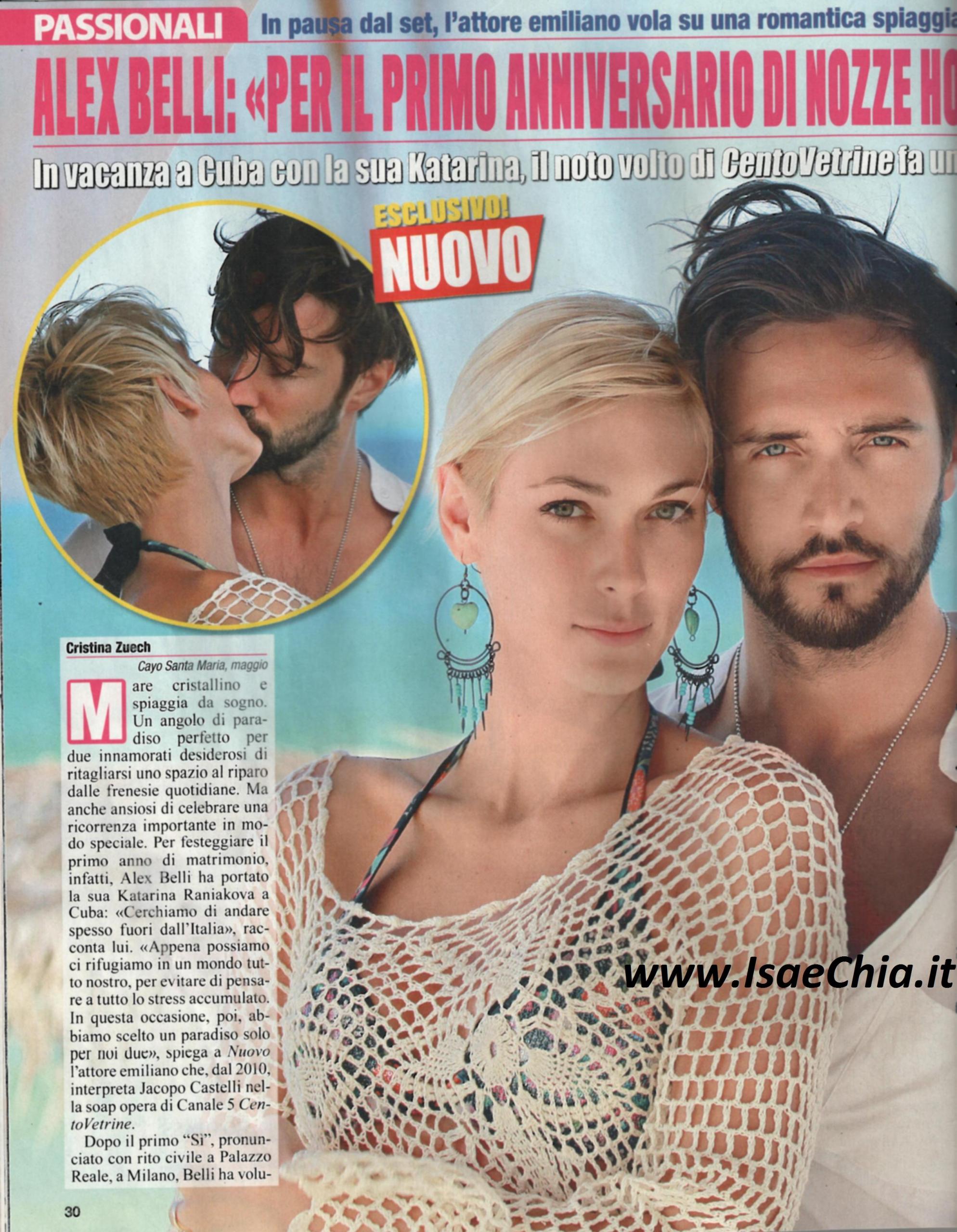 Per festeggiare il primo anniversario di matrimonio, l’attore di Alex Belli ha regalato a sua moglie Katarina Raniakova una vacanza a Cuba: “Appena possiamo, scappiamo fuori dall’Italia e ci rifugiamo in un mondo tutto nostro, per evitare lo stress. Di questi tempi arrivare a un anno di matrimonio è tanto: oggi si tende a buttare via un rapporto anche solo per uno screzio, a ritrovarsi dall’avvocato per una sciocchezza, mentre io credo che l’altro vada amato e “sopportato” per i suoi difetti. In realtà vivevamo insieme da sei anni. Il modo di vivere è lo stesso, ma è mutato il senso di responsabilità. Il matrimonio è un contratto con cui si sigla l’amore e io mi sono sposato per questo. A un figlio ci stiamo lavorando: formare una famiglia è la nostra priorità. Per ora abbiamo accolto in casa due gattine! Katarina è la mia musa ispiratrice: sono appassionato di fotografia e ora ho uno studio tutto mio. Quando io scatto, Katarina lavora con me, siamo in perfetta simbiosi. Inoltre, ho una band, la Alex Belli Live e faremo delle serate quest’estate. Ora che registro Centovetrine non potrei proprio dedicarmi ad altri progetti come attore, ma quando le registrazioni finiranno, a novembre, farò altro. Vacanza? Solo a fine agosto: dobbiamo prima ristrutturare casa!”