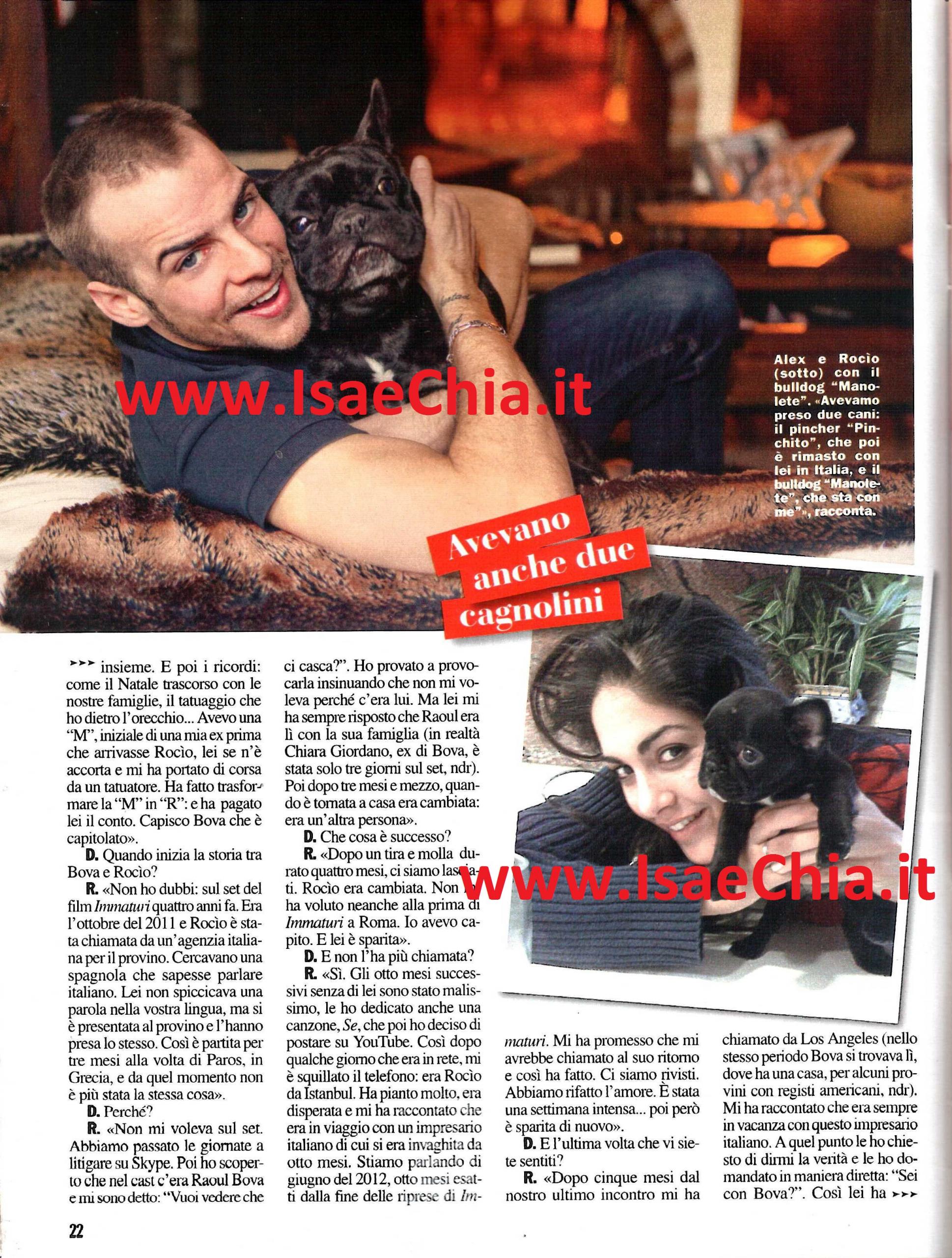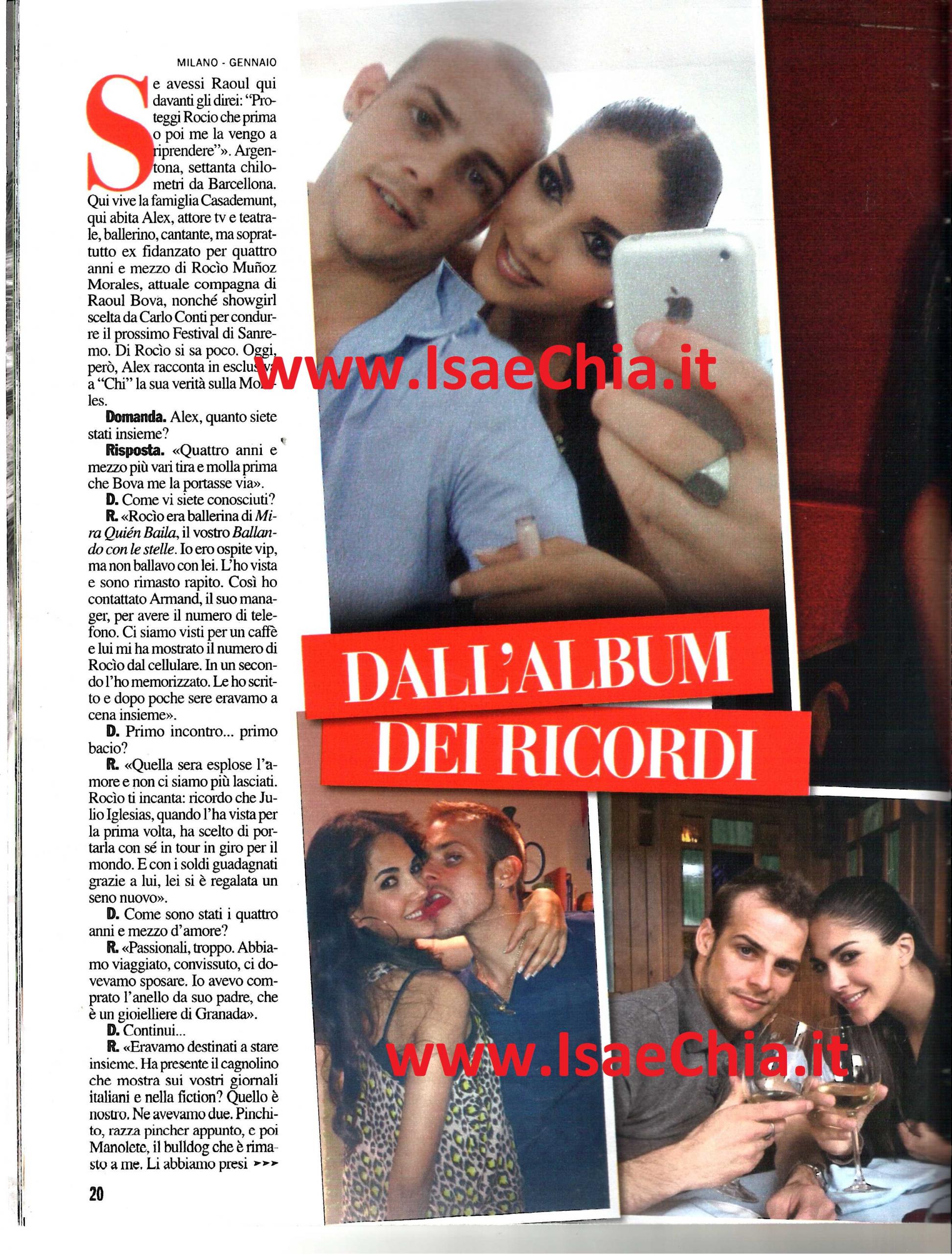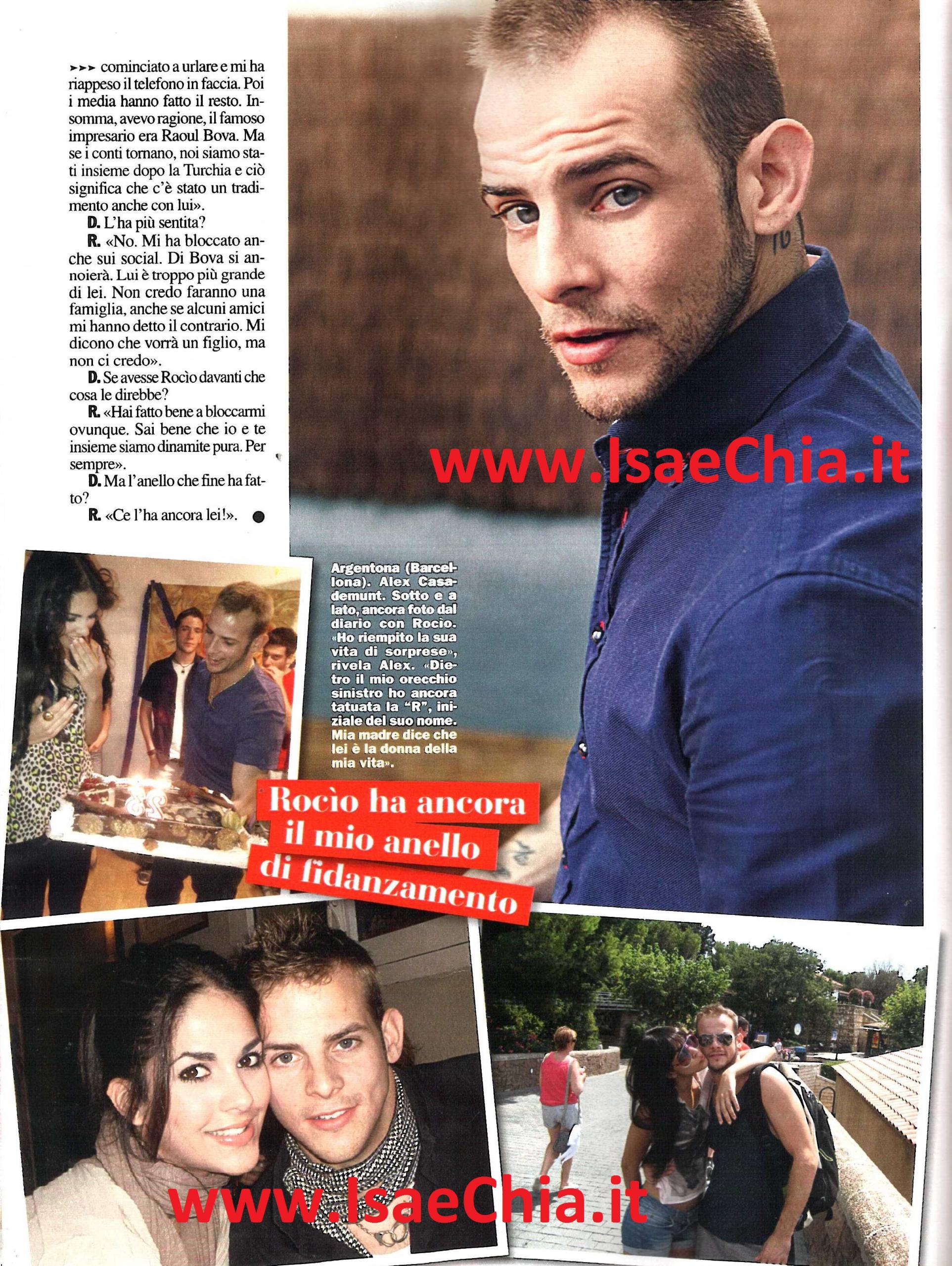 Sul palco del Festival di Sanremo 2015 ci sarà, insieme ad Emma Marrone ed Arisa e al conduttore Carlo Conti, anche l’attrice e modella spagnola Rocío Munoz Morales, nota ormai al pubblico italiano per la sua relazione con Raoul Bova. Tutti, infatti, sappiamo che subito dopo il divorzio dalla moglie Chiara Giordano, l’attore romano si è fidanzato con la bella spagnola. Ma forse non tutti sanno che quando Raoul e Rocío si sono conosciuti, sul set del film Immaturi, anche lei era fidanzata. Oggi parla proprio il suo ex, Alex Casademunt, attore, ballerino e cantante: “Siamo stati insieme quattro anni e mezzo prima che Raoul me la portasse via. Lei era concorrente di Mira quién baila, il vostro Ballando con le stelle; l’ho vista e sono rimasto colpito. Ho contattato il suo manager per avere il suo numero di telefono; l’ho chiamata e dopo poche sere eravamo a cena insieme. Rocío ti incanta: Julio Iglesias, quando l’ha vista per la prima volta, ha scelto di portarla in tour con sé per il mondo. E lei, con i soldi guadagnati, si è regalata un seno nuovo. I nostri anni d’amore sono stati passionali, troppo. Abbiamo viaggiato, convissuto, ci dovevamo sposare. Le avevo comprato l’anello da suo padre, che è un gioielliere di Granada. Eravamo destinati a stare insieme. Avete presente il cagnolino che mostra sui giornali e nelle fiction? Quello è il nostro. E poi i tatuaggi: avevo una M dietro l’orecchio che era l’iniziale di una mia ex. Lei me l’ha fatta trasformare in R e ha pagato lei il conto. Capisco che Bova è capitolato!“. Quando gli si chiede quando è iniziata, secondo lui, tra lei e Bova, Alex risponde: “Non ho dubbi, sul set di Immaturi: Rocío era stata chiamata per un provino e la presero anche se non parlava italiano. Così è partita per il set, in Grecia, ma da allora non è stata più la stessa cosa: non mi ha voluto sul set, abbiamo passato le giornate a litigare su Skype. Poi ho scoperto che sul set c’era Raoul Bova e mi sono detto: ‘Vuoi vedere che ci casca?’. Ho provato a provocarla insinuando che non mi voleva perché c’era lui, ma lei rispondeva che lui era lì con la famiglia. In realtà sua moglie è stata solo 3 giorni sul set. Quando è tornata, dopo un tira e molla di alcuni mesi, ci siamo lasciati. Non mi ha voluto nemmeno alla prima di Immaturi. Io avevo capito, lei era sparita. Gli otto mesi successivi sono stato malissimo, le ho dedicato anche una canzone su Youtube. Così dopo qualche giorno, mi ha chiamato. Ha pianto molto, era disperata e mi ha spiegato che era in viaggio con un impresario italiano di cui si era invaghita da otto mesi. Era giugno del 2012, a otto mesi esatti dalle riprese di Immaturi. Mi ha promesso che mi avrebbe chiamato al suo ritorno e così ha fatto. Ci siamo rivisti, abbiamo fatto l’amore, è stata una settimana intensa, poi è sparita di nuovo. Dopo cinque mesi, mi ha chiamato da Los Angeles (nello stesso periodo in cui Bova era lì, dove ha casa, per alcuni provini). Mi ha raccontato che era sempre in vacanza con quest’impresario italiano. Io le ho chiesto di dirmi la verità e se era Raoul Bova e lei ha cominciato ad urlare e mi ha riappeso il telefono in faccia. Poi i media hanno fatto il resto. Insomma, avevo ragione: il famoso impresario era Bova. Ma se i conti tornano, dato che siamo stati insieme dopo la Turchia, quindi c’è stato il tradimento anche verso di lui. Non l’ho più sentita, mi ha bloccato anche sui social. Di Bova si annoierà: lui è troppo più grande. Non credo faranno una famiglia, anche se degli amici mi hanno detto che lei lo vorrà. Se la vedessi, le direi che ha fatto bene a bloccarmi ovunque: io e lei siamo dinamite pura, per sempre! L’anello di fidanzamento? Ce l’ha ancora lei!“