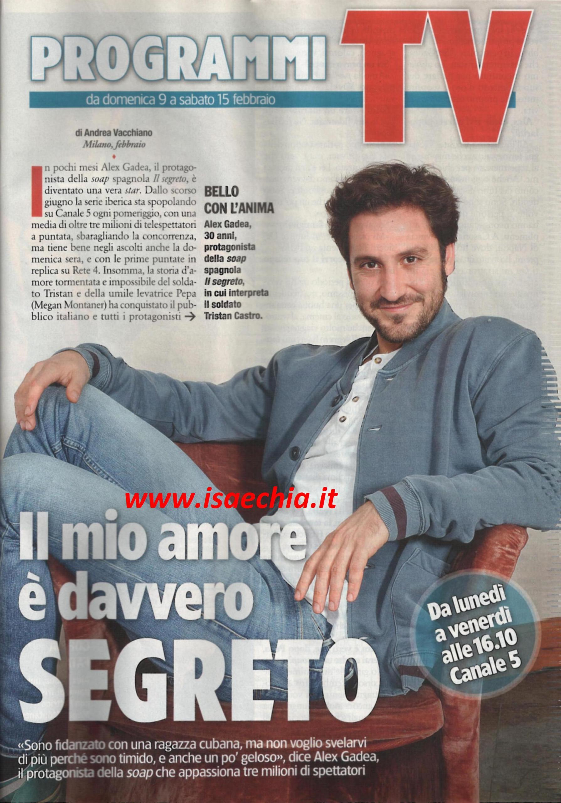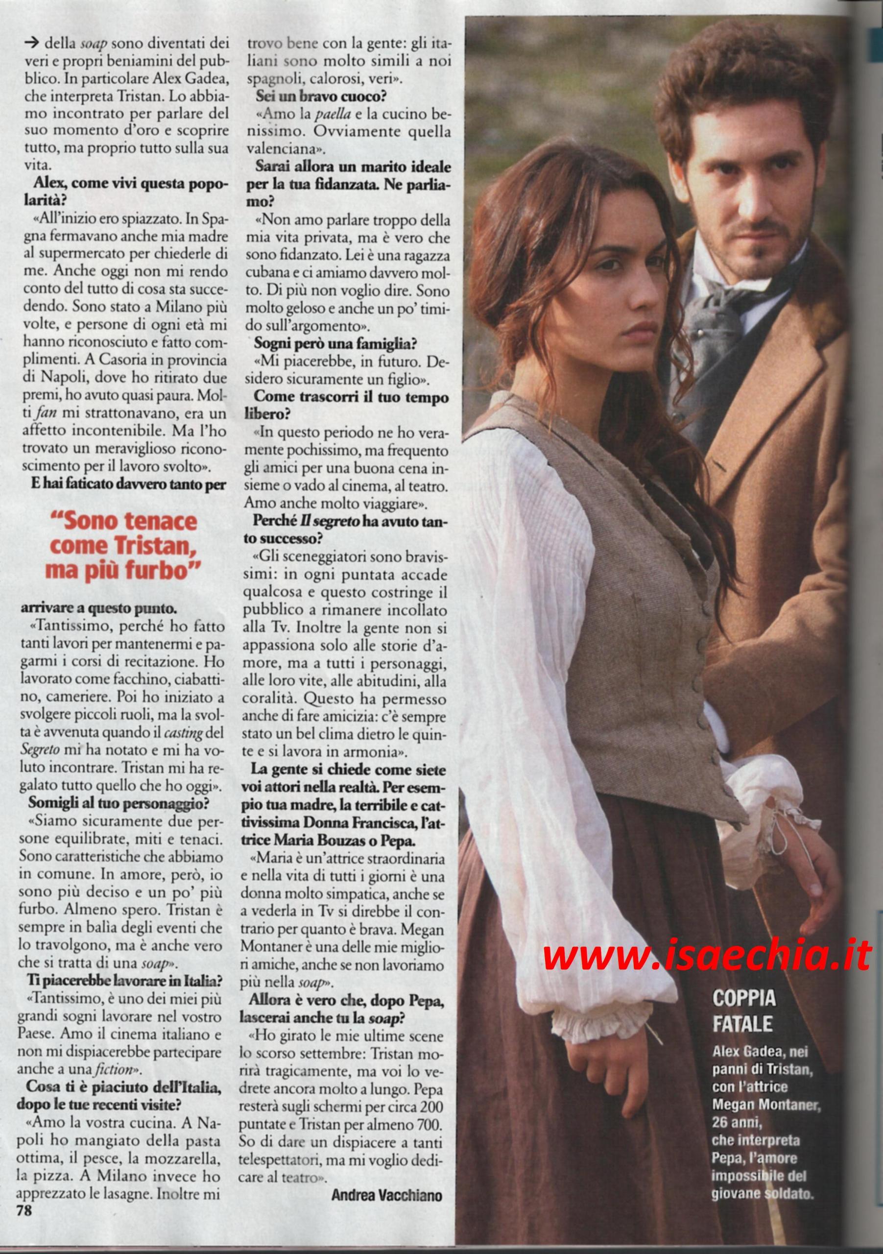 In pochi mesi Alex Gadea, che interpreta Tristan nella fiction spagnola Il segreto, è diventato una star: “All’inizio ero spiazzato. La gente fermava mia mamma al supermercato e ancora oggi non mi rendo conto di cosa sta succedendo. Sono stato a Milano più volte e mi hanno riconosciuto e fatto i complimenti. A Casoria, vicino Napoli, ho ritirato due premi e la gente mi strattonava: ho avuto quasi paura. Ho fatto tanti lavori per studiare recitazione: facchino, ciabattino, cameriere. Poi ho svolto dei piccoli ruoli, ma la svolta è avvenuta col casting per Il segreto. Io e Tristan siamo due persone miti e tenaci, ma io in amore sono più furbo e deciso. Tristan è sempre in balìa degli eventi, ma è anche vero che si tratta di una soap. Uno dei miei più grandi sogni è venire a lavorare in Italia. Amo la vostra cucina!”. Quando gli si chiede della sua fidanzata, risponde: “Non amo parlare troppo della mia vita privata, ma è vero che sono fidanzato. Lei è una ragazza cubana, e ci amiamo davvero molto, ma non voglio dire di più. Mi piacerebbe una famiglia un futuro e desidero un figlio”. Infine, rivela qualcosa sul futuro della soap: “Ho girato le ultime scene. Tristan morirà tragicamente, ma voi lo vedrete ancora a lungo: Pepa rimane per 200 puntate, Tristan per 700. Gli sceneggiatori sono bravissimi, riescono a tenere incollato il pubblico. Maria Bouzas, che interpreta mia madre Donna Francisca è una donna molto simpatica; Megan Montaner, che interpreta Pepa, è una delle mie migliori amiche”.