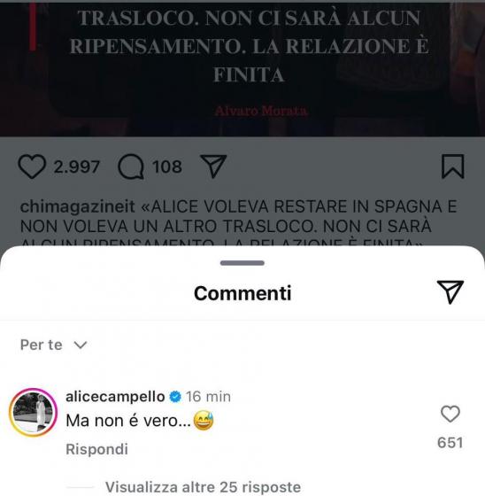 È di poco fa la netta replica di Alice. La Campello ha commentato il post scrivendo un secco: