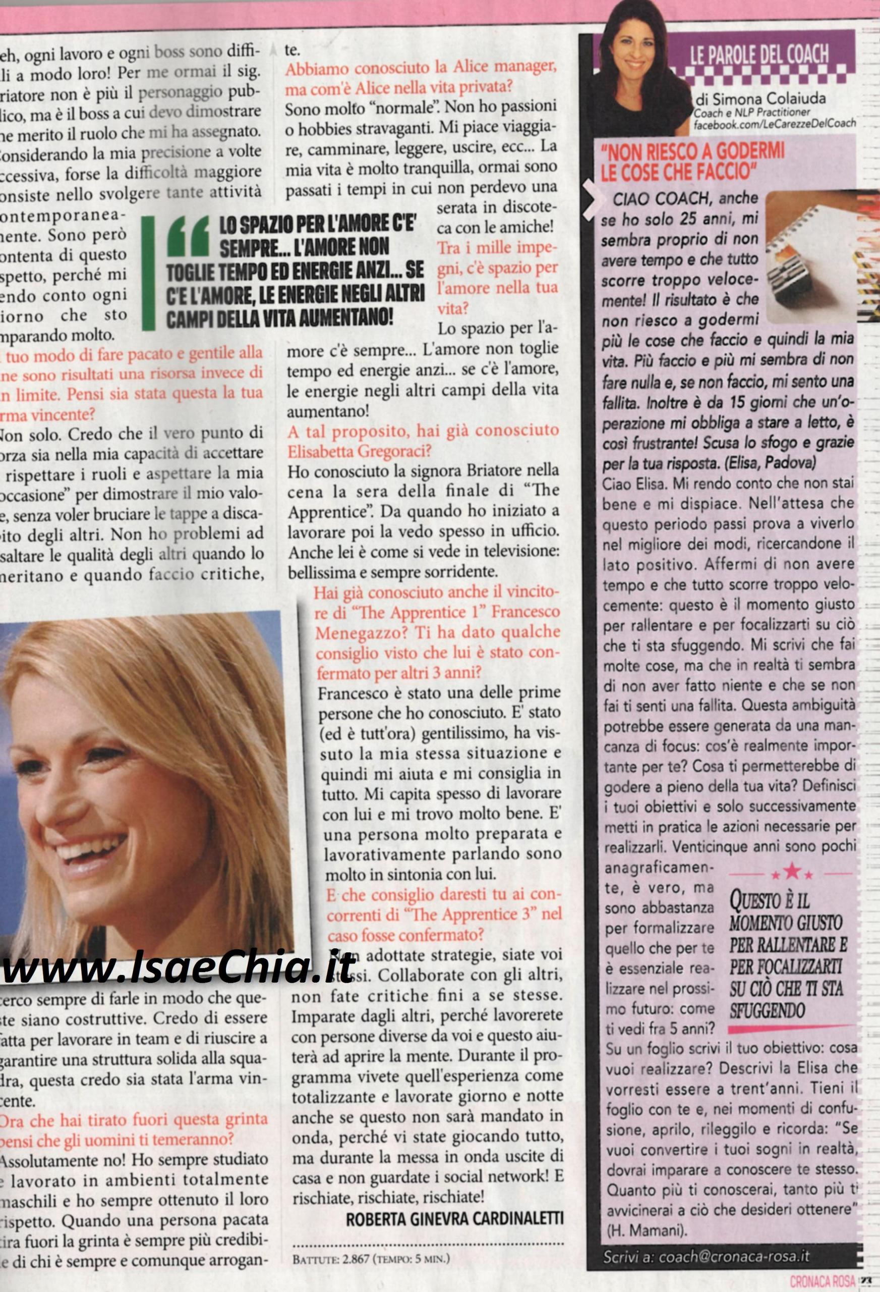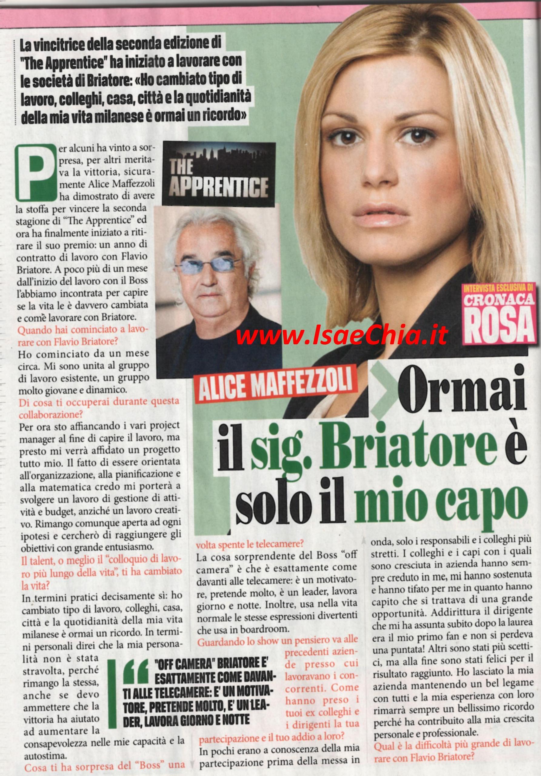 Alice Maffezzoli ha vinto la seconda edizione di The Apprentice, il talent che le ha dato la possibilità di lavorare con un anno con l’imprenditore Flavio Briatore: “Ho cominciato da circa un mese, mi sono unita al gruppo preesistente, molto giovane e dinamico. Per ora sto affiancando i vari project manager per capire il lavoro, ma presto mi verrà affidato un progetto tutto mio. Il fatto di essere orientata all’organizzazione, alla pianificazione e alla matematica mi porterà a svolgere un lavoro di gestione attività e budget, anziché un lavoro creativo. Rimango comunque aperta ad ogni ipotesi e cercherò di raggiungere ogni obiettivo con entusiasmo. Ho cambiato lavoro, vita, colleghi e casa e la mia vita milanese è solo un ricordo, ma la mia vita personale non è cambiata, sono sempre la stessa, anche se la vittoria mi ha aiutata ad avere più consapevolezza delle mie capacità. Sono una persona “normale” e nella mia vita c’è sempre posto per l’amore. Se c’è l’amore, le energie negli altri campi crescono. Solo i miei amici più stretti erano a conoscenza della mia partecipazione e i miei colleghi e il mio capo mi hanno sempre sostenuta: addirittura il primo dirigente che mi ha assunta dopo la laurea non si perdeva una puntata! Ho lasciato la mia azienda mantenendo un buon rapporto con tutti: hanno contribuito alla mia crescita. Briatore è esattamente come davanti alle telecamere: è un motivatore, pretende molto, è un leader, lavora giorno e notte, e usa le stesse espressioni divertenti che usa in boardroom. Per me il Boss non è più il personaggio televisivo, ma il boss a cui devo dimostrare il ruolo che mi ha assegnato. Considerando la mia precisione eccessiva, forse la mia difficoltà è svolgere tante attività contemporaneamente. Credo che il mio punto di forza sia la capacità di accettare i ruoli senza bruciare le tappe e non a discapito degli altri”. Quando le si chiede se ha conosciuto la signora Briatore, la showgirl Elisabetta Gregoraci, Alice risponde: “Sì, nella cena finale di The apprentice, poi la vedo spesso in ufficio. E’ come la si vede in tv: bellissima e sempre sorridente. Francesco Menegazzo, vincitore della prima edizione, è stato tra le prime persone che ho conosciuto: è gentilissimo, mi aiuta e mi consiglia. Mi capita spesso di lavorare con lui e siamo molto in sintonia. Ai concorrenti di un’eventuale terza edizione di The apprentice consiglio: collaborate con gli altri, non fate critiche fini a se stesse, imparate dagli altri, vivete il programma come un’esperienza totalizzante e lavorate giorno e notte perché vi state giocando tutto. Durante la messa in onda, però, non guardate i social network. E rischiate, rischiate, rischiate!”
