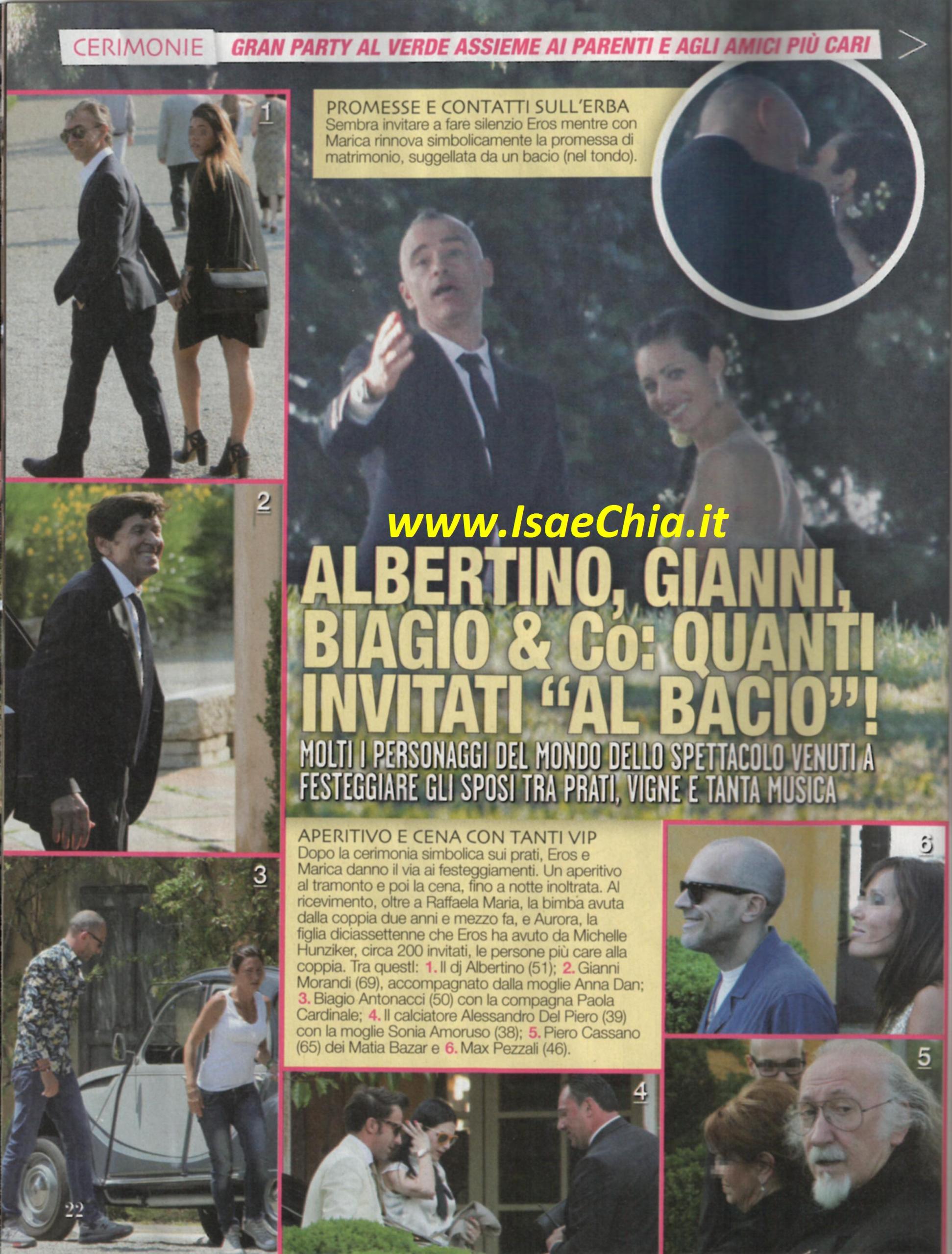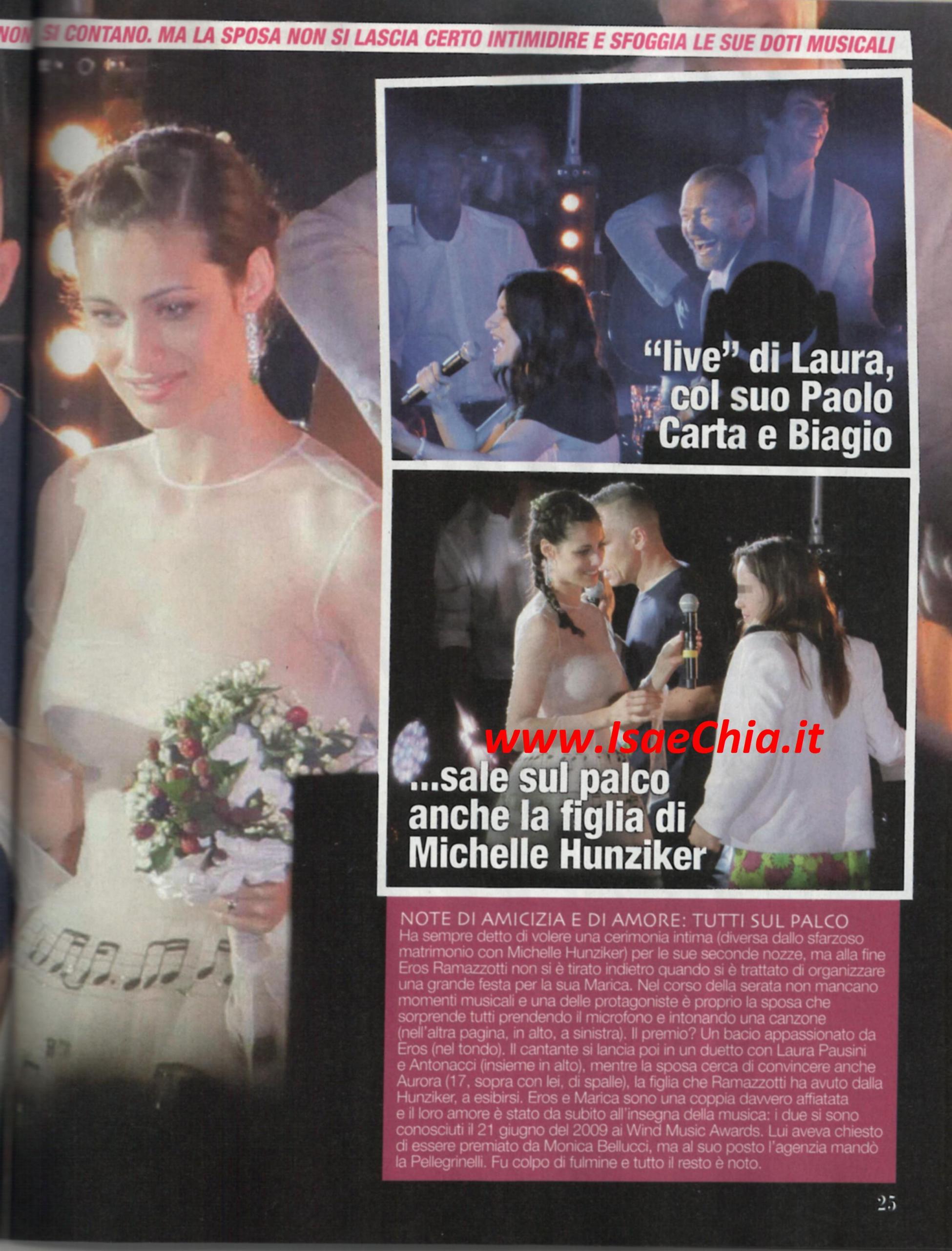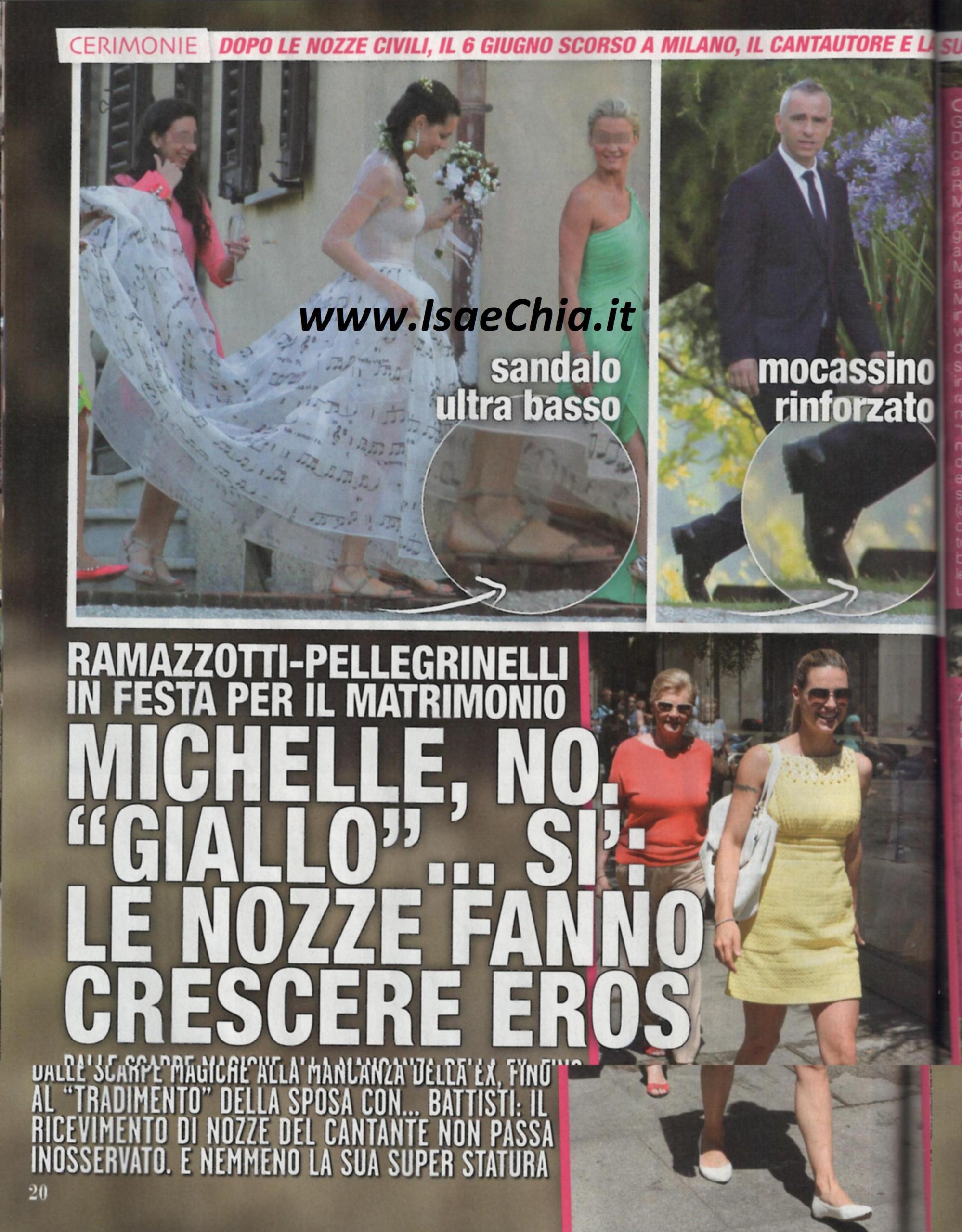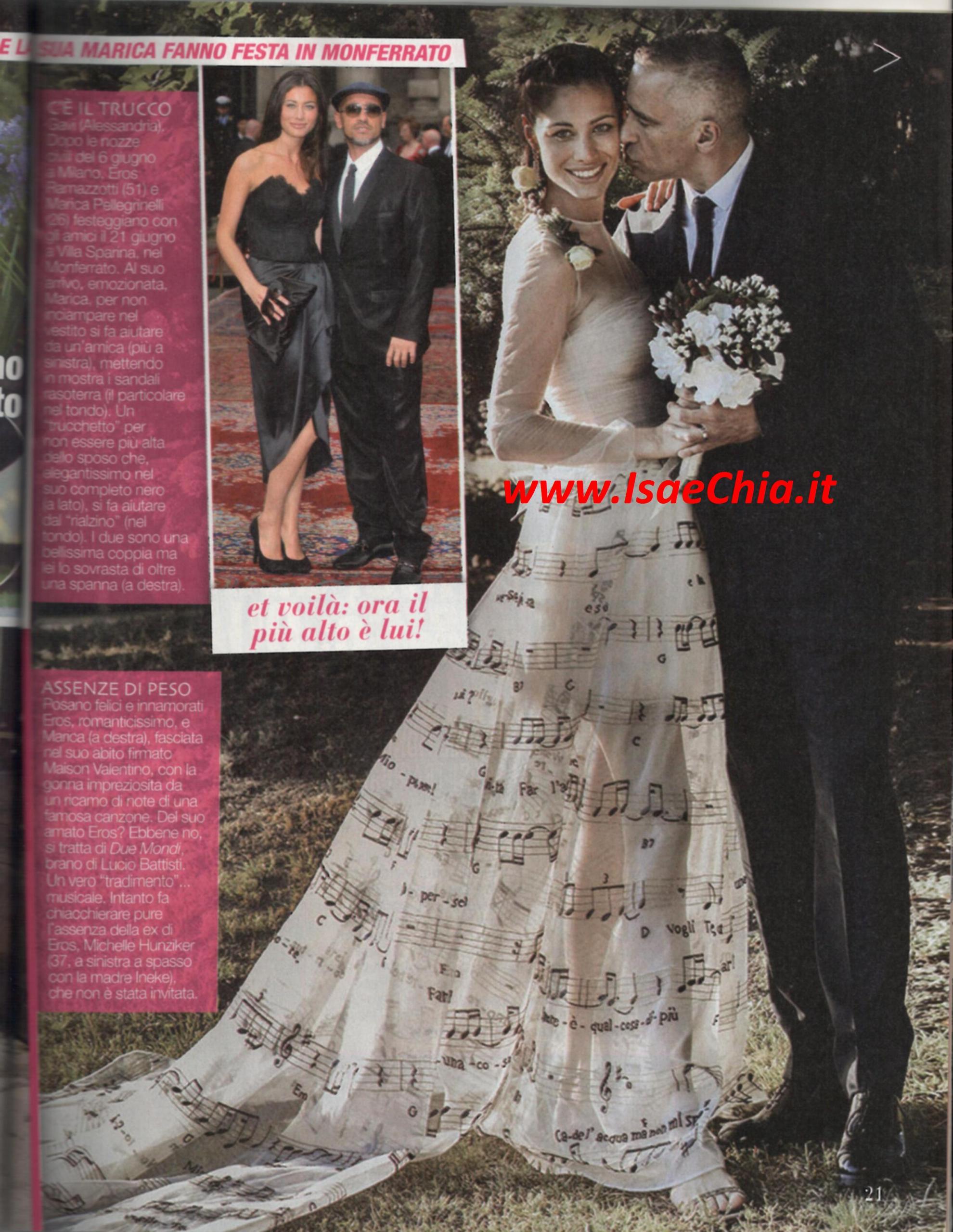 Lo scorso 21 giugno a Gavi (AL) si è tenuto il ricevimento per le nozze del cantante Eros Ramazzotti con Marica Pellegrinelli, celebrate il 6 giugno in gran segreto. La sposa è stata beccata prima di raggiungere la destinazione, mentre, accompagnata da un’amica, sollevava il vestito svelando dei sandali rasoterra: lei, infatti, è più alta di Eros; lui ha indossato delle scarpe con rinforzi e così nelle foto non ha sfigurato al suo fianco. L’abito di Marica ha colpito particolarmente: firmato dalla maison Valentino, era caratterizzato da una leggera ma lunghissima gonna coperta di note. Quelle di una canzone di suo marito? No, di Due Mondi del sempreterno Lucio Battisti! Dopo una cerimonia simbolica sui prati, Eros e Marica danno il via ai festeggiamenti. Tra gli invitati grandi nomi della musica italiana: Laura Pausini, Gianni Morandi, Biagio Antonacci, Max Pezzali, Piero Cassano dei Matia Bazar e altri vip tra cui il dj Albertino e il calciatore Alessandro Del Piero. Ovviamente, alla festa non poteva che essere protagonista la musica: perfino Marica stupisce tutti prendendo il microfono e dedicando una canzone a suo marito, che la premia con un bacio. Poi Ramazzotti duetta con la Pausini e con Antonacci, mentre la sposa cerca di convincere Aurora, la figlia che Eros ha avuto dalla prima moglie Michelle Hunziker, ad esibirsi. D’altronde, anche l’amore tra Eros e Marica è nato grazie alla musica: ai Wind Music Awards lui aveva chiesto di essere premiato da Monica Bellucci, ma l’agenzia mandò la Pellegrinelli. Ed è stato colpo di fulmine!