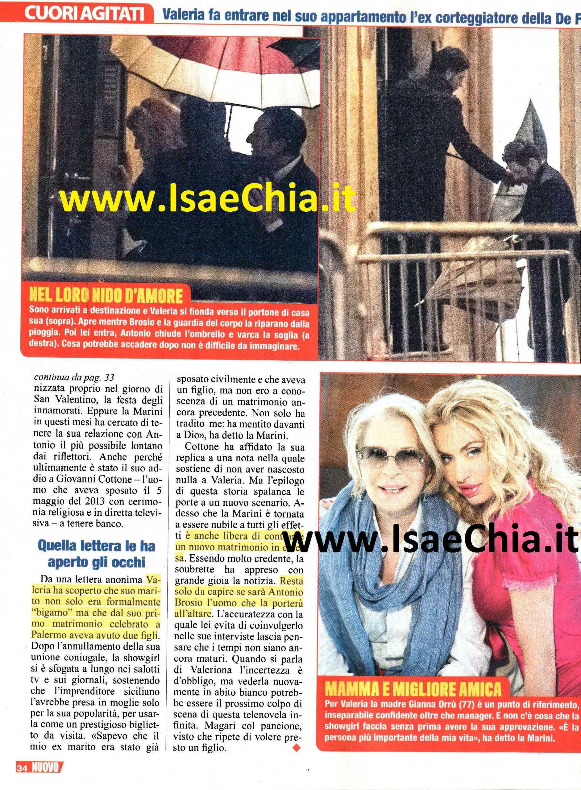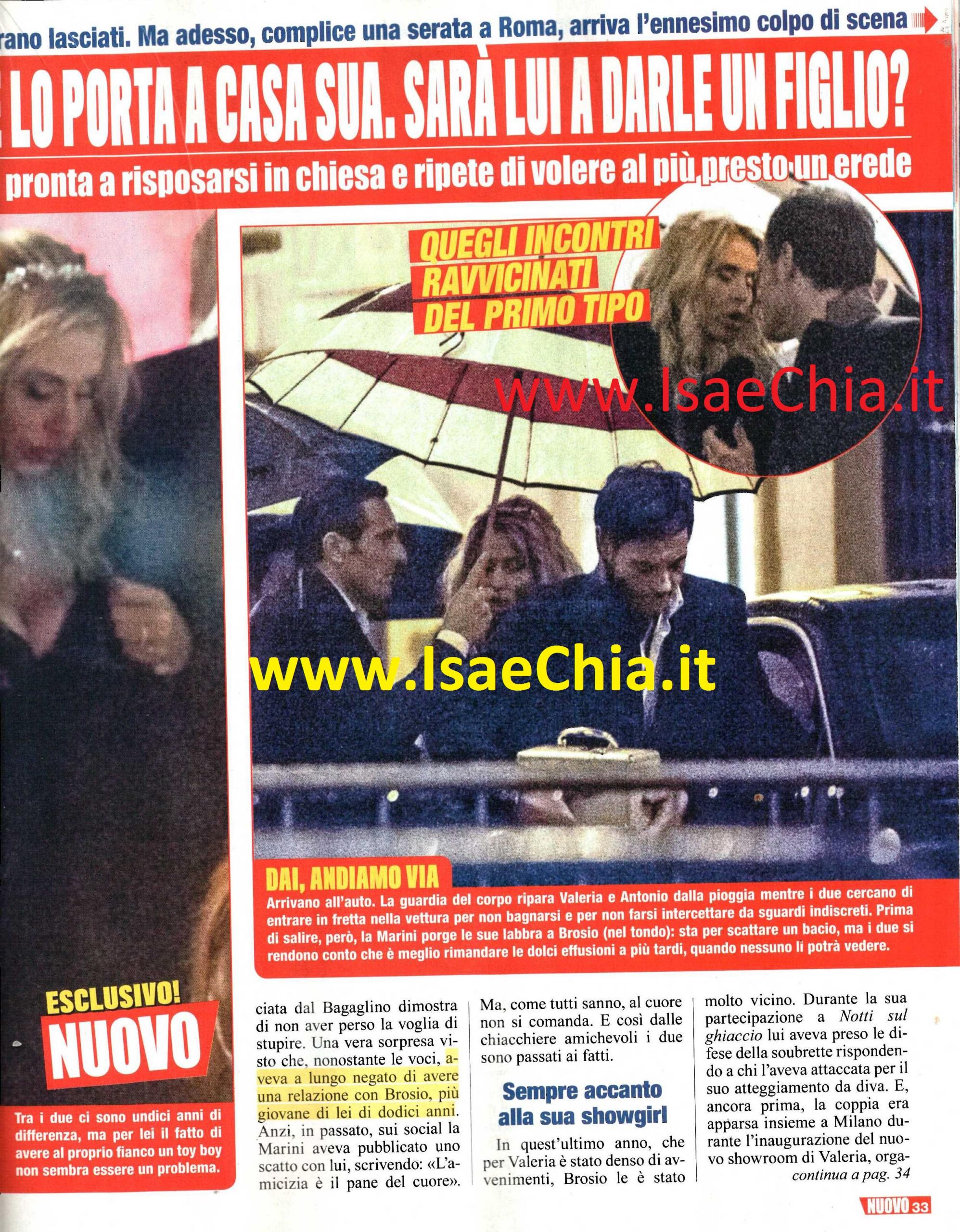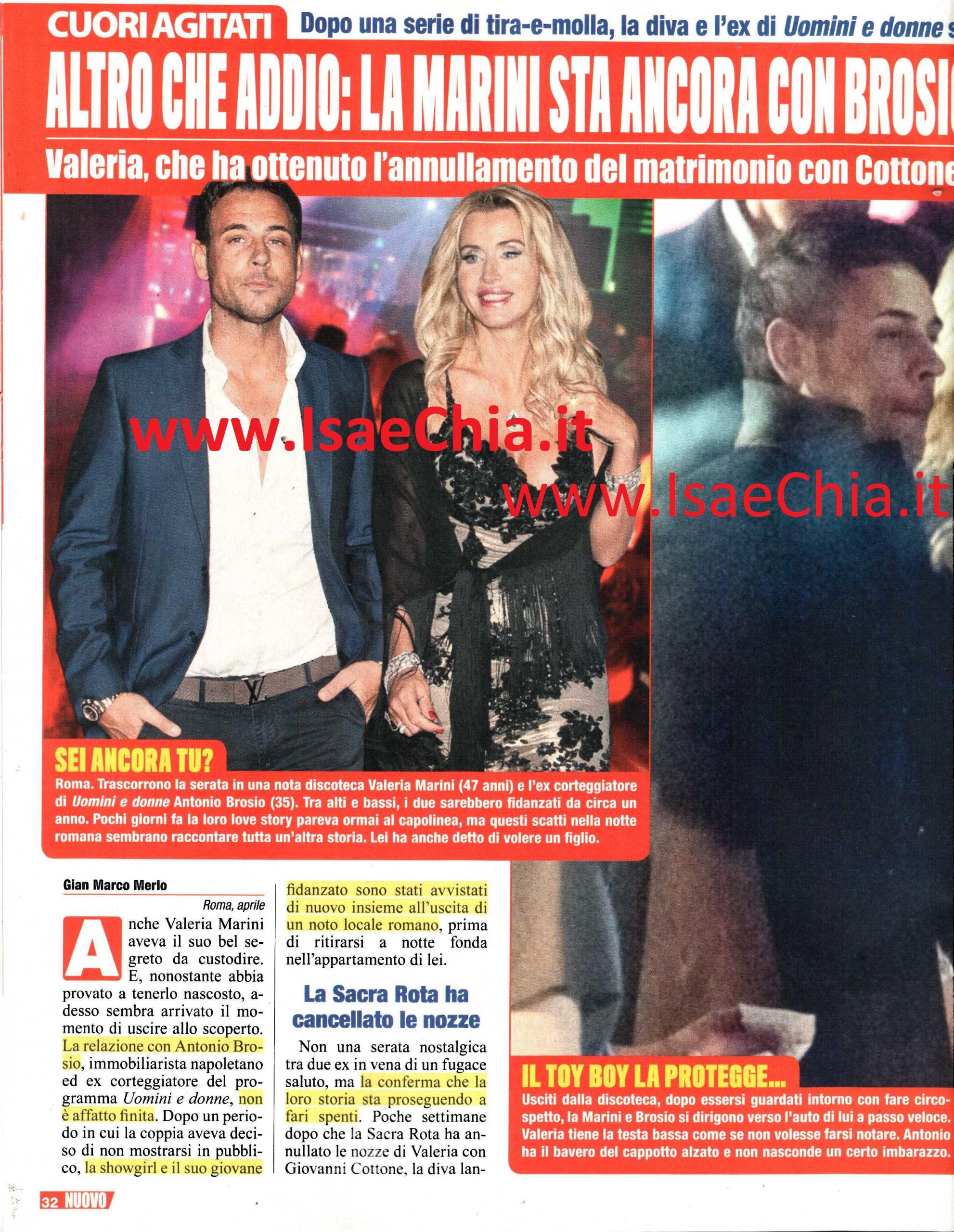 Negli scorsi giorni si era parlato di un’eventuale fine della storia tra la showgirl Valeria Marini e il suo fidanzato Antonio Brosio. Dopo un periodo in cui la coppia aveva deciso di non mostrarsi più in pubblico, però, l’ex naufraga e l’ex corteggiatore di Uomini e Donne sono stati visti di nuovo insieme all’uscita di un noto locale romano, prima di ritirarsi a notte fonda nell’appartamento di lei. Poche settimane fa la Sacra Rota ha annullato le nozze di Valeria con Giovanni Cottone, celebrate circa due anni fa e durate meno di un anno, dopo che lei aveva scoperto tramite una lettera che in realtà lui fosse già sposato, e questo è stato un ulteriore passo verso l’ufficializzazione del rapporto con Antonio. Inizialmente Valeria aveva negato di avere un flirt con l’imprenditore napoletano, di 12 anni più giovane di lei, ma in quest’ultimo anno, che per lei è stato denso di emozioni, lui le è stato sempre vicino, nel bene o nel male. Durante la sua partecipazione a Notti sul ghiaccio, lui aveva preso le difese della soubrette rispondendo a chi l’aveva attaccata per il suo atteggiamento da diva. Precedentemente, la sera di San Valentino, lui l’ha accompagnata all’inaugurazione di un suo nuovo showroom. Eppure la Marini, forse scottata dalla sovraesposizione mediatica del matrimonio con Cottone, ha deciso di tenerlo lontano dai riflettori. Adesso che è nubile a tutti gli effetti, è anche libera di contrarre un nuovo matrimonio in chiesa. Vederla di nuovo in abito bianco, magari in una cerimonia blindatissima, sarebbe davvero l’ennesimo colpo di scena in questa grande telenovela. Per il momento, i due si godono questi momenti insieme che vivono come qualsiasi coppia di normali fidanzati: usciti da una discoteca, la Marini e Brosio si dirigono verso l’auto di lui a passo veloce; lei tiene la testa bassa come se non volesse farsi notare, lui tiene alto il bavero del cappotto. La guardia del corpo li ripara dalla pioggia mentre salgono in fretta in auto. Prima di salire, però, Valeria porge le sue labbra e tra i due sembra stia per scattare un bacio. Alla fine, però, si rendono conto che è meglio rimandare le effusioni a più tardi. Giunti a destinazione, la coppia si fionda verso il portone di casa scortata dalla guardia del corpo con l’ombrello. Cosa sia successo dopo non è difficile immaginarlo…Che si mettano al lavoro per il figlio che Valeria desidera tanto?