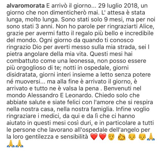 Alvaro Morata e Alice Campello sono diventati genitori! Ad annunciare la nascita dei loro bellissimi gemelli, pochissimi istanti fa è stato proprio il calciatore su Instagram, che con estrema gioia ha raccontato al mondo la sua felicità: “29 luglio 2018, un giorno che non dimenticherò mai. L’attesa è stata lunga, molto lunga. Sono stati solo 9 mesi, ma per noi sono stati tre anni. Non ho parole per ringraziarti, Alice, grazie per avermi fatto il regalo più bello e incredibile del mondo. Ogni giorno, da quando ti conosco, ringrazio Dio per averti messo sulla mia strada, sei la pietra angolare della mia vita. Questi mesi hai combattuto come una leonessa, non posso essere più orgoglioso di te; […] Benvenuti al mondo Alessandro e Leonardo!“.