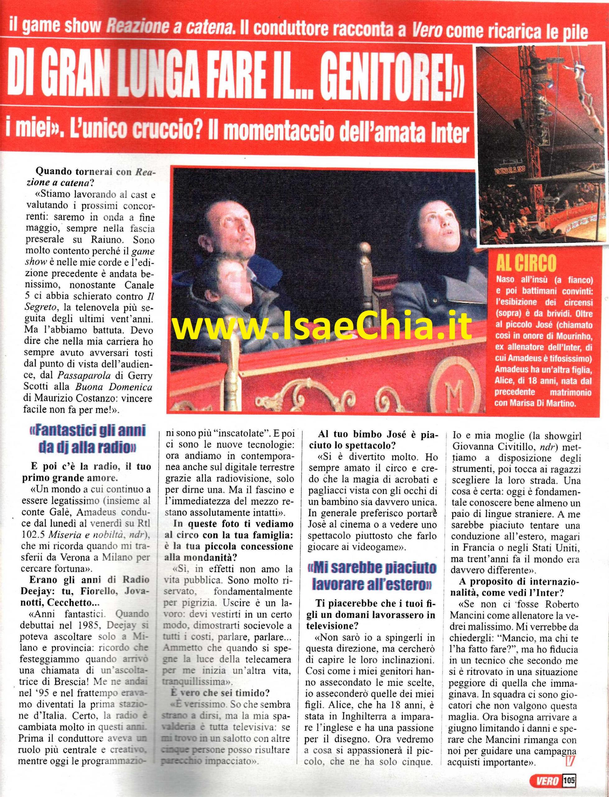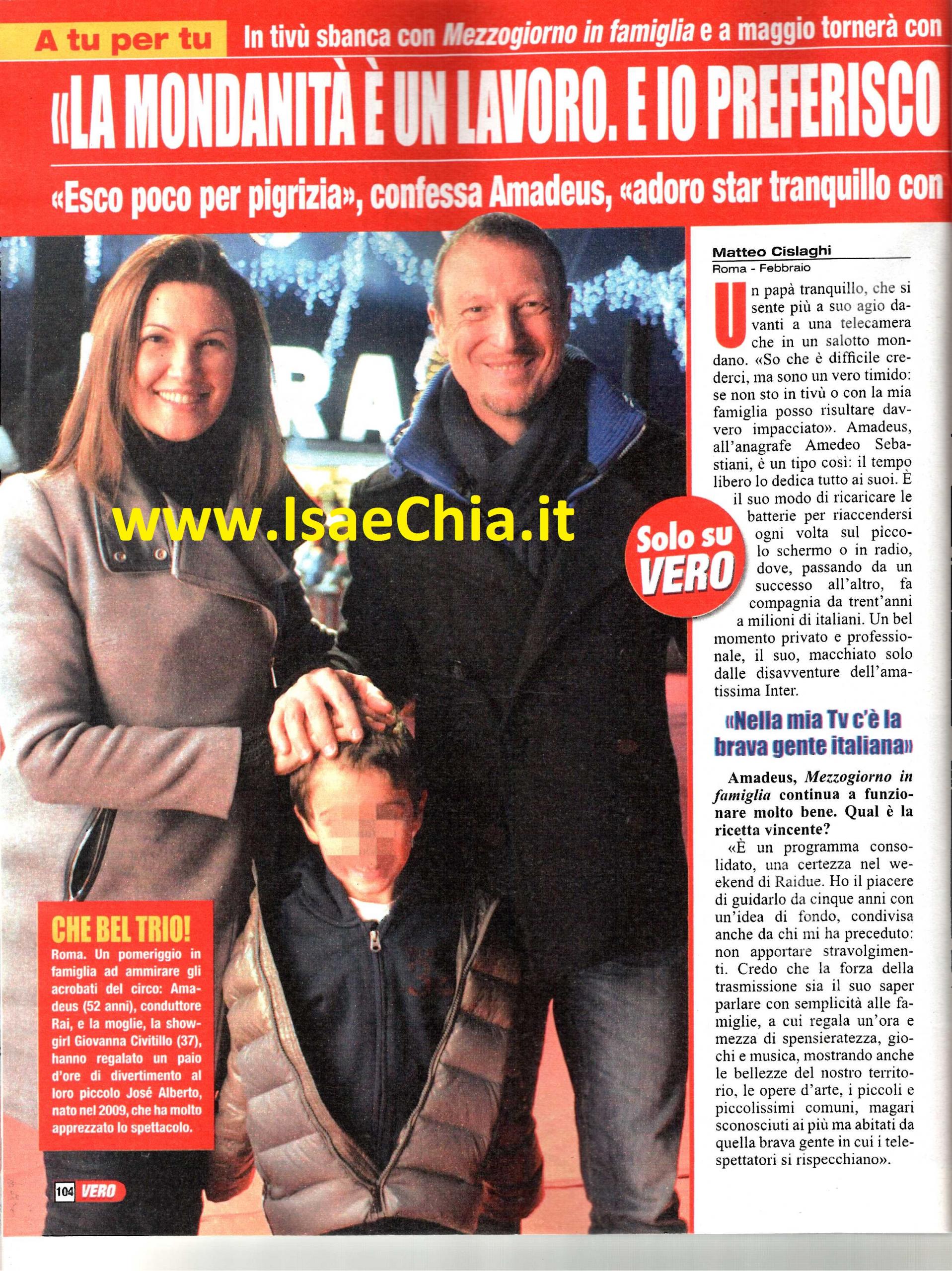 Tra un successo e l’altro, Amadeus fa compagnia agli Italiani ormai da trent’anni. Adesso Amedeo Sebastiani (questo è il suo vero nome) è uno dei volti di Mezzogiorno in famiglia, che continua a funzionare molto bene: “E’ un programma consolidato, ormai una certezza del weekend di Raidue. Ho il piacere di guidarlo da cinque anni con un’idea di fondo, condivisa anche da chi mi ha preceduto: non apportare stravolgimenti. Credo che la sua forza sia parlare con semplicità alle famiglie, regalare spensieratezza, mostrando anche le bellezze del nostro territorio. Con Reazione a catena, invece, saremo in onda da fine maggio e stiamo lavorando sul cast dei concorrenti. Sono molto contento perché l’edizione precedente è andata molto bene nonostante Canale 5 ci avesse schierato contro Il Segreto, la telenovela più seguita degli ultimi vent’anni, che però abbiamo battuto“. E poi, c’è la radio, il suo primo grande amore, dove Amadeus conduce Miseria e nobiltà su RTL 102.5 con il Conte Galé: “E’ un mondo a cui continuo ad essere legatissimo, mi ricorda quando mi trasferii a Milano per cercare fortuna. Quando debuttai nel 1985, Radio Deejay si poteva ascoltare solo a Milano e provincia, quando me ne andai nel ’95 era la prima radio d’Italia“. Riguardo alle sue foto scattate al circo a Roma insieme alla moglie Giovanna Civitillo e il figlio José, quando si commenta che non è un tipo molto mondano, Amadeus spiega: “Non amo molto la vita pubblica, sono molto riservato, fondamentalmente per pigrizia. Uscire è un lavoro, devi vestirti in un certo modo, mostrarti socievole a tutti i costi, parlare…Ammetto che quando si spegne la telecamera per me si accende un’altra vita, tranquillissima. So che sembra strano, ma sono timido e la mia spavalderia è tutta televisiva. Se mi trovo in un salotto con altre cinque persone posso risultare molto impacciato. Mio figlio si è divertito molto e in generale preferisco portarlo fuori, al cinema, piuttosto che vederlo giocare davanti ai videogame. Così come i miei genitori hanno assecondato le mie scelte, io cercherò di capire le inclinazioni dei miei figli. Alice, che ha 18 anni, è stata in Inghilterra e ha una passione per il disegno; ora vedremo cosa appassiona il piccolo. Io e Giovanna mettiamo a disposizione degli strumenti, poi tocca ai ragazzi scegliere la loro strada. Una cosa è certa: è fondamentale conoscere almeno un paio di lingue straniere. A me sarebbe piaciuto tentare una conduzione all’estero, in Francia o negli Stati Uniti, ma trent’anni fa il mondo era molto diverso!“.