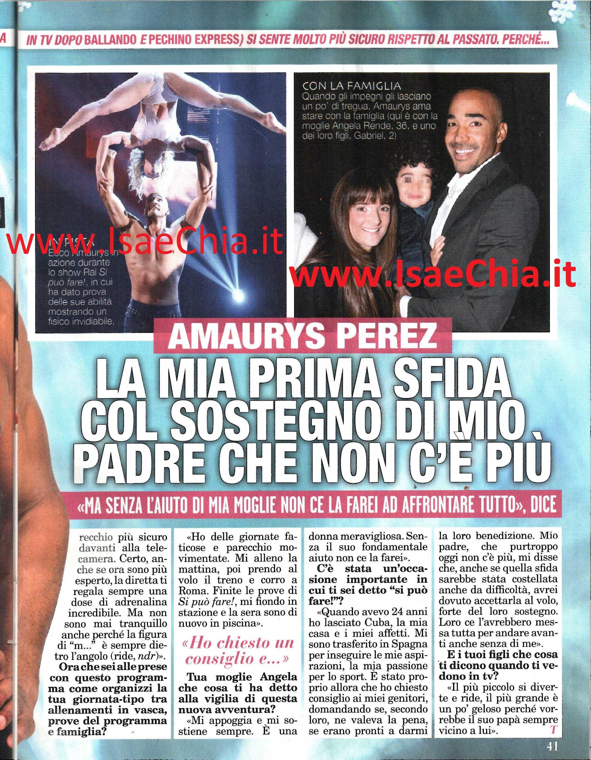 Fisico statuario, sorriso ammaliante e simpatia contagiosa: sono questi i segreti di Amaurys Perez, che, dopo Ballando con le stelle e Pechino Express, dove ha partecipato con la moglie Angela Rende, torna in tv con una terza sfida: Si può fare. “Già il titolo così emblematico di questa trasmissione ti dà una carica particolare, ti spinge ad impegnarti al massimo e a dare il meglio. A chiunque, durante il corso di una giornata, sarà capitato di autoincoraggiarsi dicendo ‘Si può fare’. Ecco perché l’ingrediente fondamentale per riuscire al meglio in quest’avventura è la grinta. Mi allettava l’idea di lavorare, dopo Milly Carlucci, con un altro numero 1 della nostra tv, come Carlo Conti. E sapevo che mi sarei divertito un mondo alle prese con queste prove. Il cast è meraviglioso e c’è anche un nutrito gruppo di sportivi. Per noi, cercare di superare i propri limiti, sfidare se stessi, rappresenta davvero il pane quotidiano. E’ l’unico modo per migliorare e dedicarsi al prossimo traguardo“. Quando gli si fa notare che è cambiato da quando, tempo fa, confessava che il solo pensiero di trovarsi davanti alle telecamere gli faceva tremare le gambe, il campione di pallanuoto risponde: “All’epoca mai avrei immaginato che poi ci avrei preso così tanto gusto e confidenza! Ora mi sento parecchio più sicuro davanti alla telecamera. Certo, anche se ora sono più esperto, la diretta regala sempre una dose incredibile di adrenalina: non sono mai tranquillo, perché la figura di m… è sempre dietro l’angolo! Le mie giornate sono faticose e movimentate: mi alleno la mattina, poi prendo al volo il treno e corro a Roma. Finite le prove di Si può fare, mi fiondo in stazione e la sera sono di nuovo in piscina!“. Quando gli si chiede cosa gli ha detto sua moglie Angela alla vigilia di questa nuova avventura, il 39enne cubano ha risposto: “Mi appoggia e mi sostiene sempre. E’ una donna meravigliosa. Senza il suo aiuto non ce la farei. Mio figlio minore si diverte guardandomi in tv; il maggiore, invece, è geloso perché vorrebbe il suo papà sempre vicino a lui“. Infine, quando gli si chiede se c’è stata un’occasione importante in cui si è detto ‘Si può fare’, Amaurys racconta: “Quando avevo 24 e ho lasciato Cuba, la mia casa e i miei affetti. Mi sono trasferito in Spagna per seguire le mie aspirazioni, la mia passione per lo sport. Allora ho chiesto consiglio ai miei genitori, domandando se, secondo loro, ne valesse la pena e se erano pronti a darmi la loro benedizione. Mio padre, che purtroppo oggi non c’è più, mi disse che, anche se quella sfida sarebbe stata costellata di difficoltà, avrei dovuto accettarla al volo. Loro ce l’avrebbero messa tutta per andare avanti anche senza di me“.