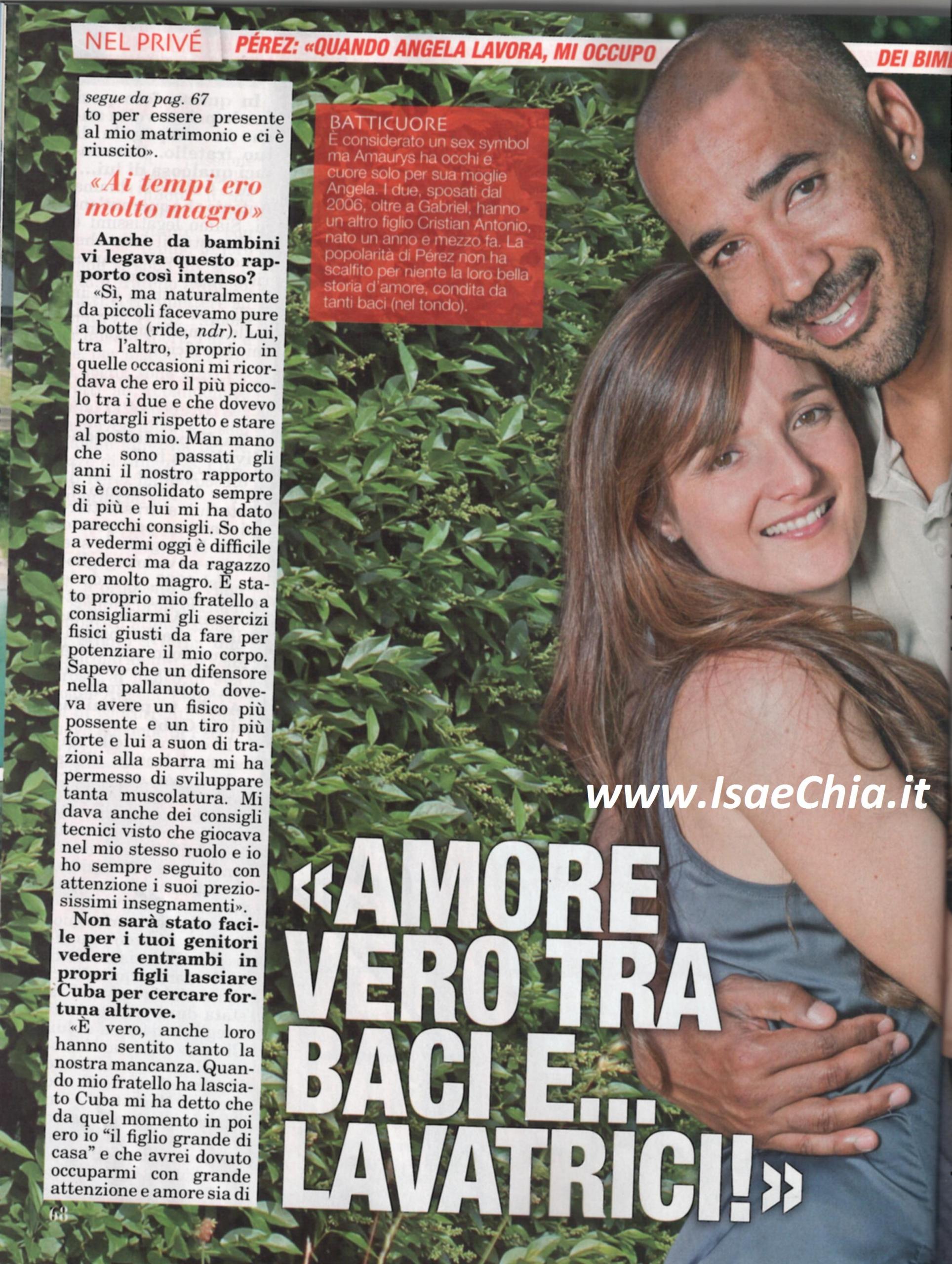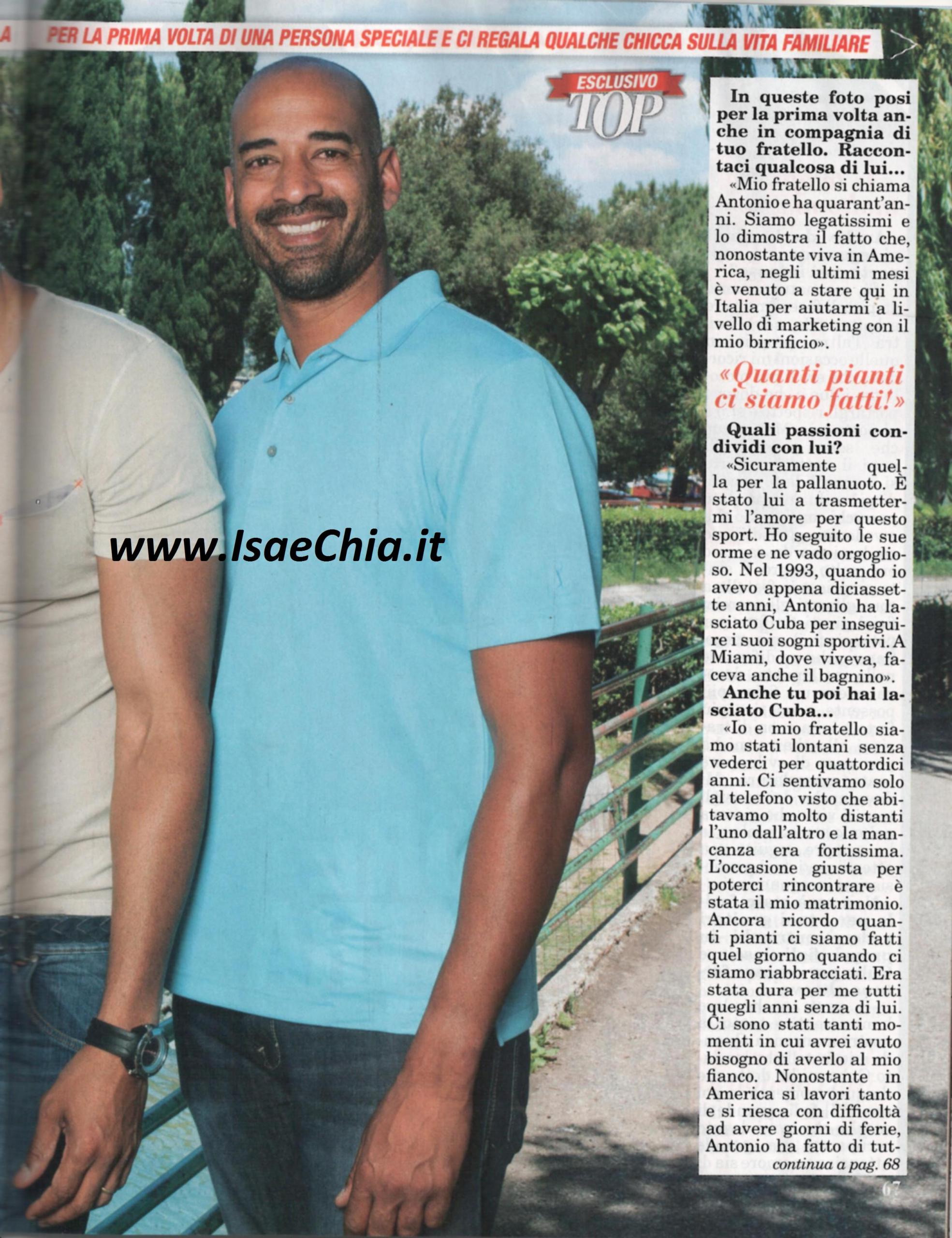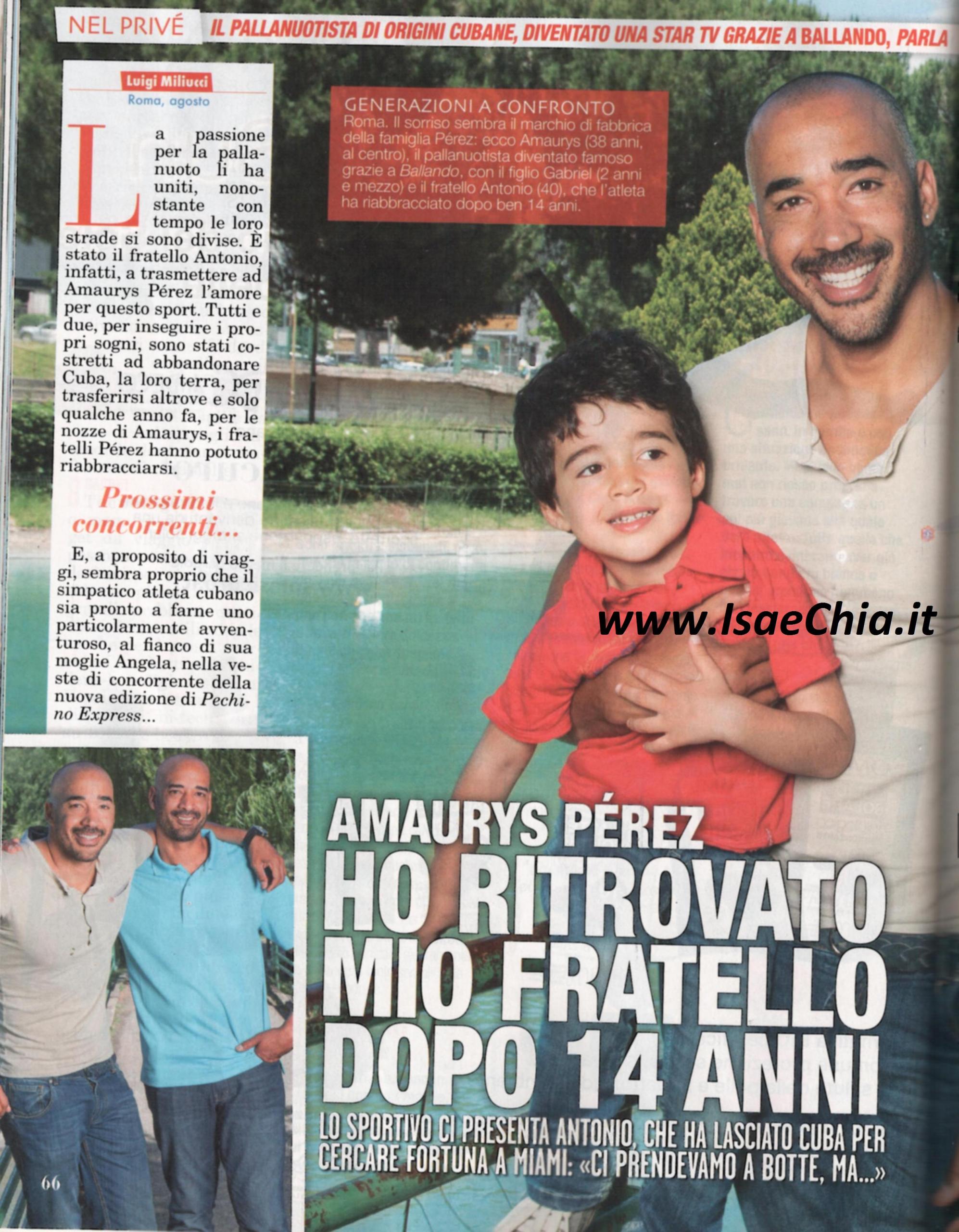 In questi giorni è stato reso noto il cast della terza edizione di Pechino Express, e tra i nomi spunta anche quello di Amaurys Perez, il pallanuotista di origini cubane che si è classificato secondo nella scorsa edizione di Ballando con le stelle. Ma sulle pagine di Top, il bel cubano dà un’altra bella notizia: ha finalmente riabbracciato suo fratello. “Mio fratello si chiama Antonio e ha 40 anni. Siamo legatissimi e lo dimostra il fatto che nonostante viva in America, negli ultimi mesi è stato qui in Italia per darmi una mano col mio birrificio. E’ stato lui a trasmettermi la passione per la pallanuoto: io ho seguito le sue orme. Nel 1993, quando aveva 17 anni, ha lasciato Cuba per inseguire i suoi sogni sportivi e faceva il bagnino a Miami. In seguito anch’io ho lasciato la mia isola ed io e lui non ci siamo visti per 14 anni. L’occasione giusta per poterci rincontrare è stato il mio matrimonio: ancora ricordo i pianti che ci siamo fatti quel giorno quando ci siamo riabbracciati! Lui mi ha dato tanti consigli. So che sembra strano, ma da ragazzo ero molto magro ed è stato proprio mio fratello a consigliarmi quali esercizi fare per potenziare il mio corpo. Quando mio fratello ha lasciato Cuba, mi disse che da quel momento io sarei stato “il figlio grande di casa” e che avrei dovuto occuparmi di mamma e di papà”. Adesso, però, Amaurys è un padre e un marito perfetto: “A mio figlio Gabriel piace stare in acqua, ma non voglio imporgli il mio sport, non voglio che diventino dei piccoli campioni, ma che siano sereni. Io mi occupo dei miei figli, cambio i pannolini, gioco e guardo i cartoni animati con loro…Ma le faccende domestiche sono la mia specialità: sono un maniaco della pulizia! Mi rilasso perfino a lavare il bagno fare la lavatrice!”. Infine, quando gli si chiede di dare un consiglio ai nuovi concorrenti di Ballando, dice: “Fidatevi al 100% degli insegnanti di ballo, non dovete fare altro che godervi l’esperienza! Milly Carlucci è straordinaria” mentre su Pechino Express commenta solo con un laconico “Non so…Ma l’Oriente mi affascina molto!”