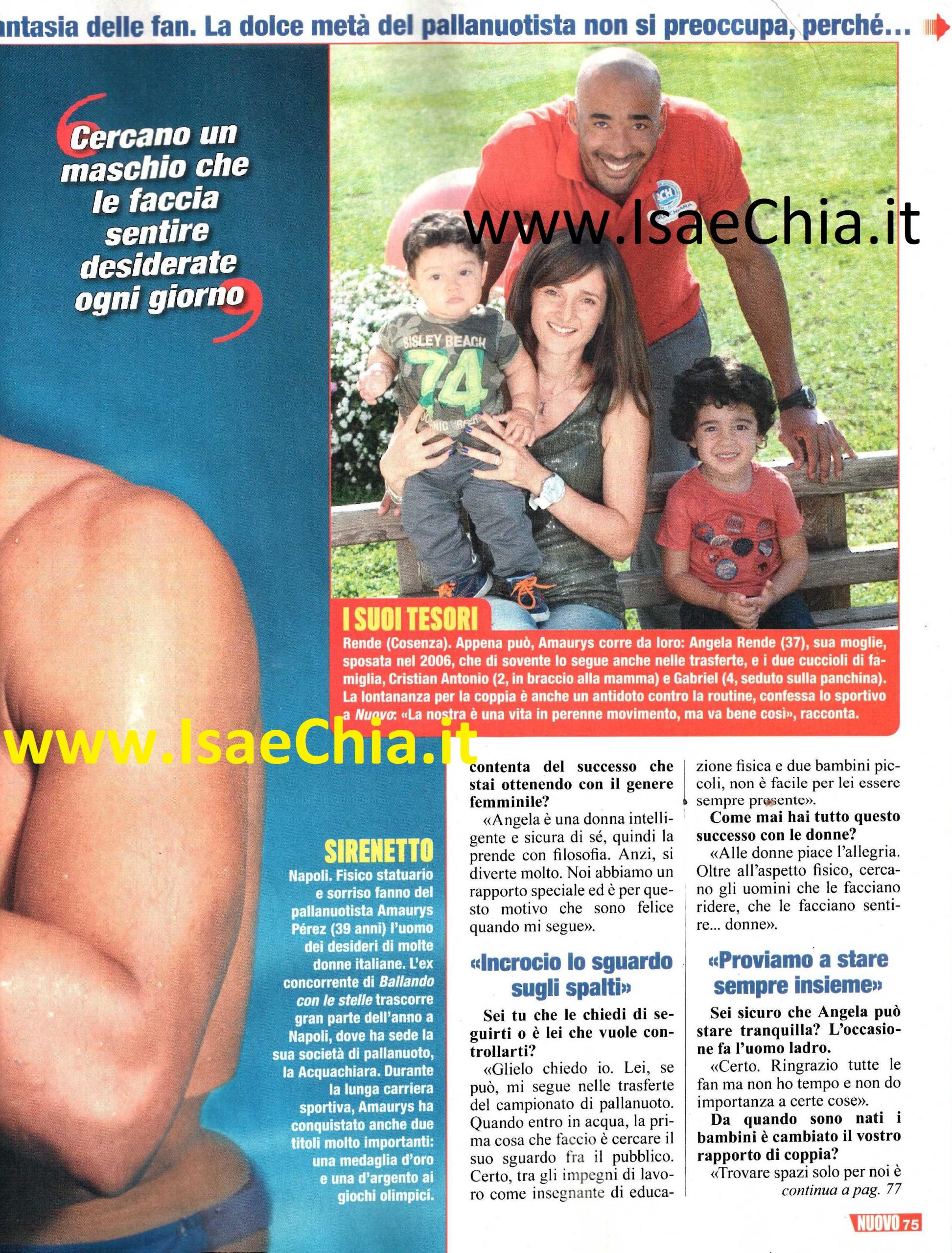 Uno striptease difficile da dimenticare a Si può fare, una famosa doccia a Pechino Express e dei balli calienti a Ballando con le stelle: Amaurys Perez ha conquistato così il pubblico femminile. Ma per fortuna la moglie Angela Rende, che ha preso parte con lui alla gara di Pechino Express, tiene a freno i suoi bollenti spiriti: “Angela è una donna intelligente e sicura di sé, quindi la prende con filosofia. Anzi, si diverte molto. Noi abbiamo un rapporto speciale ed è per questo che sono felice quando mi segue. Glielo chiedo io: lei, se può, mi segue nelle trasferte di pallanuoto. Quando entro in acqua, la prima cosa che faccio è cercare il suo sguardo nel pubblico. Certo, tra gli impegni di lavoro come insegnante di educazione fisica e due bambini piccoli, non è facile per lei essere sempre presente“. Quando gli si chiede qual è il suo segreto per piacere tanto alle donne, l’asso del pallanuoto risponde: “Alle donne piace l’allegria. Oltre all’aspetto fisico, cercano gli uomini che le facciano ridere, che le facciano sentire…donne! Ma Angela può stare tranquilla. Ringrazio tutte le fan ma non ho tempo e non do importanza a certe cose…“. Quando gli si chiede se il loro rapporto di coppia è cambiato da quando hanno avuto i loro due bambini, come succede a tanti, il bel cubano risponde: “Trovare spazi solo per noi è quasi impossibile, però cerchiamo di non cadere nella routine. Durante il campionato vivo a Napoli, mentre la mia famiglia è in Calabria. Loro mi raggiungono nel fine settimana, oppure mi sposto io se sono libero. La nostra è una vita sempre in movimento e, forse per questo, tra noi la fiamma della passione è sempre accesa! Cerchiamo di stare più tempo possibile insieme, ognuno di noi deve essere partecipe della vita dell’altro. Altrimenti è inutile sposarsi!“. Infine, Amaurys ripercuote la sua carriera, sia nello sport che nella tv, dove da qualche anno non si è più fermato “Per la pallanuoto ho dovuto lasciare il mio Paese quando avevo 18 anni, ma sono tanti i valori che mi ha insegnato e vorrei trasmetterli ai miei figli. L’attività sportiva è una vera e propria scuola di vita, soprattutto se di squadra. I sacrifici che richiede ti fanno capire che con la perseveranza si ottengono grandi risultati. Il mondo dello spettacolo mi piace, mi dà allegria e serenità e, di conseguenza, ottima salute. Per questo ho accettato anche Si può fare. Adesso la gente mi ferma per chiedere gli autografi e mi sembra di vivere in un sogno. Quello che avrei dovuto avere per le medaglie conquistate in 34 anni passati nella pallanuoto, lo sto avendo ora in tv. Qualche fan si è anche avvicinato a questo sport e per me è un grande risultato“.