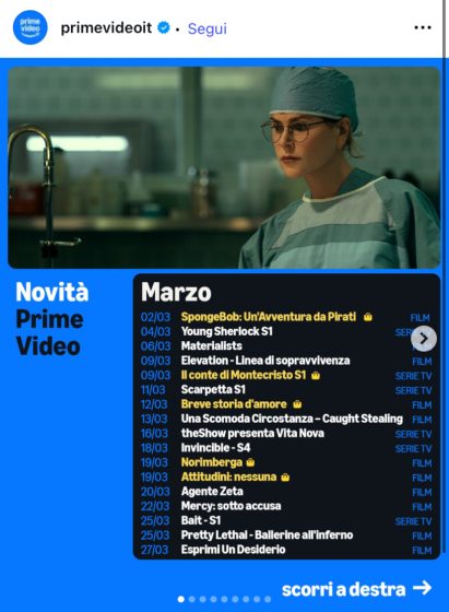 Poco fa, l’account Instagram di Amazon Prime Video tutti i titoli che vedremo a partire dai primi giorni di marzo. Eccoli nel dettaglio: