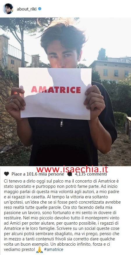 Riki ha annunciato ai suoi follower di aver voluto devolvere il montepremi – guadagnato grazie alla vittoria nella categoria canto durante la finalissima di Amici 16 – ai terremotati di Amatrice colpiti dal sisma il 24 agosto dello scorso anno.