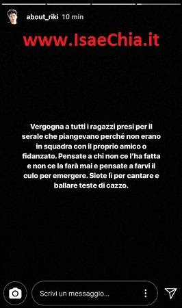 Chi proprio non è riuscito a trattenersi dal commentare questo episodio legato al ballerino è stato un ex concorrente della scorsa edizione di Amici, Riccardo Marcuzzo, che ha espresso il suo disappunto con una Instagram Stories, successivamente cancellata, in cui ha duramente accusato i concorrenti di essere ingrati. “Vergogna a tutti i ragazzi presi per il serale che piangevano perché non erano in squadra con il proprio amico o fidanzato”  attacca Riki “Pensate a chi non ce l’ha fatta e non ce la farà mai e pensate a farvi il culo per emergere. Siete lì per cantare e ballare teste di cazzo”