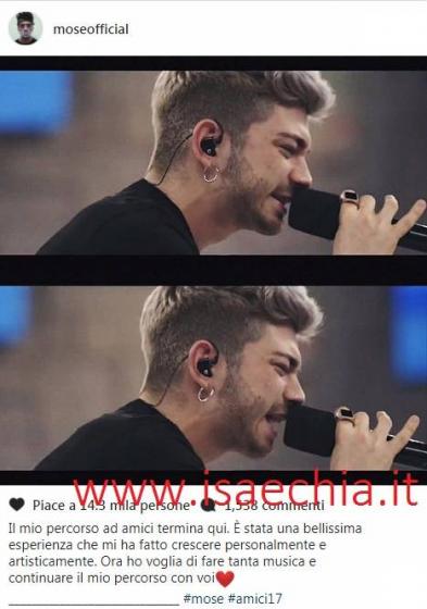 Il 21enne, a seguito della fine della sua avventura nel talent show di Canale 5, ha condiviso un post su Instagram, nel quale dichiara che quest’esperienza l’ha fatto crescere professionalmente e si augura di continuare a fare musica: “Il mio percorso ad amici termina qui. È stata una bellissima esperienza che mi ha fatto crescere personalmente e artisticamente. Ora ho voglia di fare tanta musica e continuare il mio percorso con voi“