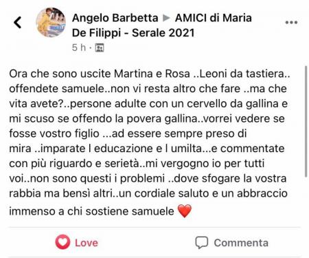 Chi invece sembra proprio non aver preso bene le critiche nei confronti di Samuele è il padre del ragazzo, Angelo Barbetta, che su Facebook ha lasciato un duro commento nei confronti di chi continua a giudicare suo figlio. “Ora che sono uscite Rosa e Martina offendete Samuele. Non vi resta altro da fare” ha esordito il signor Angelo, che poi ha proseguito: “Persone adulte con un cervello da gallina e mi scuso se offendo la povera gallina. Vorrei vedere se fosse vostro figlio ad esser sempre preso di mira. Imparate l’educazione e l’umiltà, commentate con più educazione e serietà. Mi vergogno io per tutti voi”.