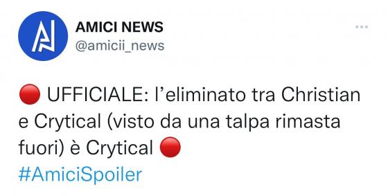 Stando a quanto si legge suo profilo Twitter @amicii_news, giunto al ballottaggio con il compagno d’avventura Christian, è stato proprio il rapper a dover abbandonare la scuola più spiata d’Italia. Crytical sarebbe stato visto da una talpa mentre lasciava la scuola.